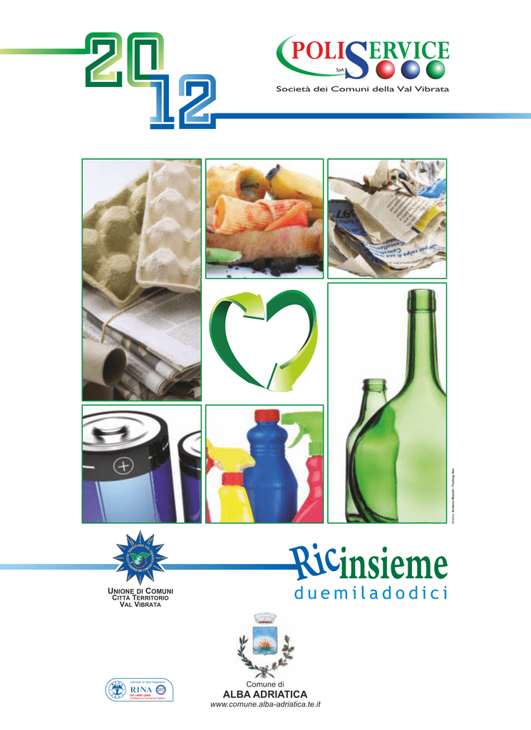 Grafica: Antonio Moretti - Fantasy Net duemiladodici UNIONE DI COMUNI CITTÀ TERRITORIO VAL VIBRATA Comune di ALBA ADRIATICA www.comune.alba-adriatica.te.it LEGENDA duemiladodici A volte sembra carta o sembra plastica, ma non è riciclabile (è il caso della carta oleata o del bicchiere di plastica). Le vaschette le metto con gli avanzi di cibo? La raccolta differenziata può sembrarti difficile, ma non è così. Se hai dubbi, usa questo promemoria. Puoi anche chiamare il numero verde. GLI AVANZI DI CIBO l Alimenti deteriorati l Briciole l Bucce di frutta e verdura l Bustine del the e della camomilla l Caffè l Carta assorbente (cucina) l Cenere (se spenta bene) l Fiori appassiti (piccole quantità) l Gusci di frutta l Gusci di molluschi l Gusci di uova l Lische di pesce l Noccioli di frutta l Ossi l Pane l Pasta l Pelli del pollo e del coniglio l Piume e pelli di animali l Riso avanzato l Semi l Tappi di sughero l The l Torsoli di frutta l Tovaglioli di carta usati l Verdura scartata l Piccole quantità di erba da prato (no ramaglie, foglie e potature) GLI SCARTI VERDI l Cassette di legno l Erba l Foglie l Potature LA CARTA E IL CARTONE l Carta di giornale l Cartoncino l Fogli di carta l Giornali l Libri l Quaderni l Riviste l Scatole e scatoloni l Tetrapak pulito LA PLASTICA l Barattoli l Blister l Bottiglie l Cellophane l Coperchi l Flaconi l Imballaggi (film) l Pellicole per alimenti l Sacchetti l Vaschette per cibi l Vasetti dello yogurt IL VETRO l Barattoli l Bicchieri l Bottiglie l Damigianelle l Lastre (piccole) l Vasetti I METALLI l Barattoli l Coperchi l Ferro (piccoli pezzi) l Lattine l Maniglie l Pentolame l Posate l Scatolette del tonno l Vasetti I RIFIUTI INGOMBRANTI l Ferro ingombrante l Materassi l Mobili l Rottami metallici l Tavoli ELETTRODOMESTICI l Computer l Condizionatori d'aria l Congelatori l Frigoriferi l Lavastoviglie l Lavatrici l Televisori l Tubi catodici I RIFIUTI PERICOLOSI l Accumulatori (batterie) delle automobili l Batterie dei telefonini l Bombolette spray l Bottigliette di farmaci scaduti l Confezioni di farmaci scaduti l Farmaci scaduti l Flaconi di sostanze tossiche, corrosive o infiammabili l Latte di vernice non ecologica o di solventi l Oli del motore l Pile esaurite GLI ABITI (se in buone condizioni) l Abiti l Borse l Scarpe OLI VEGETALI DI FRITTURA l Olio di oliva l Tutti gli oli di semi l Olio di palma l Olio di cocco I RIFIUTI SECCHI NON RICICLABILI l Accendini l Abiti (se in cattive condizioni) l Appendiabiti l Bastoncini nettaorecchie l Bigiotteria l Bicchieri di plastica l Calze l Carta carbone l Candele l Capelli tagliati l Carta adesiva l Carta catramata l Carta da parati l Carta metallizzata l Carta oleata l Carta plastificata l Carta vetrata l Ceramica (piatti) l Collant l Compact disc l Cuoio l Dischetti magnetici l Dischi l Fazzoletti di carta usati l Gomma l Ghiaietta del gatto l Lamette da barba l Lumini votivi l Mozziconi di sigarette l Musicassette l Nastro isolante l Ombrelli l Pannolini e pannoloni l Pelle conciata l Pellicole fotografiche l Penne l Piatti di plastica l Piatti rotti l Porcellana (cocci) l Polvere di pavimento l Rasoi l Scarpe (se in cattive condizioni) l Spazzatura di pavimento l Spazzolini da denti l Stracci l Tubetti del dentifricio l Vasi in plastica per piante l Vasi in terracotta l Videocassette GENNAIO duemiladodici 1 Dom 2 Lun 3 Mar 4 Mer 5 Gio 6 Ven 7 Sab 8 Dom 9 Lun 10 Mar 11 Mer 12 Gio 13 Ven 14 Sab 15 Dom 16 Lun Memo Maria Madre di Dio S. Basilio vescovo S. Genoveffa v. S. Ermete S. Amelia v. Epifania di N.S. S. Raimondo S. Massimo S. Giuliano m. S. Aldo eremita S. Igino S. Modesto S. Ilario v. S. Felice S. Mauro ab. S. Marcello papa RIFIUTI ORGANICI ORGANICS WASTES CARTA PAPER RIFIUTI SECCHI RESIDUI RESIDUAL WASTE PLASTICA PLASTIC VETRO GLASS LATTINE METAL I contenitori una volta riempiti, vanno messi a bordo strada nei giorni prestabiliti, nel periodo invernale dopo le ore 22.00 del giorno precedente la raccolta, da giugno a settembre dopo le ore 23,00. 17 Mar 18 Mer 19 Gio 20 Ven 21 Sab 22 Dom 23 Lun 24 Mar 25 Mer 26 Gio 27 Ven 28 Sab 29 Dom 30 Lun 31 Mar S. Antonio ab. S. Liberata v. S. Mario m. S. Sebastiano S. Agnese S. Vincenzo S. Emerenziana S. Francesco di S. Conv. di S. Paolo SS. Tito e Timoteo S. Angela Merici S. Tommaso d’Aquino S. Costanzo S. Martina S. Giovanni Bosco FEBBRAIO duemiladodici 1 Mer 2 Gio 3 Ven 4 Sab 5 Dom 6 Lun 7 Mar 8 Mer 9 Gio 10 Ven 11 Sab 12 Dom 13 Lun 14 Mar 15 Mer 16 Gio Memo S. Verdiana Present. del Signore S. Biagio v. S. Gilberto S. Agata m. S. Paolo Miki S. Teodoro m. S. Girolamo S. Apollonia S. Scolastica N.S. di Lourdes S. Eulalia S. Maura S. Valentino S. Faustino S. Giuliana RIFIUTI ORGANICI ORGANICS WASTES CARTA PAPER RIFIUTI SECCHI RESIDUI RESIDUAL WASTE PLASTICA PLASTIC VETRO GLASS LATTINE METAL I contenitori una volta riempiti, vanno messi a bordo strada nei giorni prestabiliti, nel periodo invernale dopo le ore 22.00 del giorno precedente la raccolta, da giugno a settembre dopo le ore 23,00. 17 Ven 18 Sab 19 Dom 20 Lun 21 Mar 22 Mer 23 Gio 24 Ven 25 Sab 26 Dom 27 Lun 28 Mar 29 Mer S. Donato m. S. Simone v. S. Mansueto S. Eleuterio S. Eleonora S. Margherita S. Renzo S. Edilberto S. Cesareo I di Quaresima S. Leandro v. S. Romano a. S. Giusto MARZO duemiladodici 1 Gio 2 Ven 3 Sab 4 Dom 5 Lun 6 Mar 7 Mer 8 Gio 9 Ven 10 Sab 11 Dom 12 Lun 13 Mar 14 Mer 15 Gio 16 Ven Memo S. Albino S. Basileo m. S. Cunegonda II di Quaresima S. Adriano S. Giordano S. Felicita S. Giovanni di Dio S. Francesco S. Simplicio papa III di Quaresima S. Massimiliano S. Rodrigo S. Matilde S. Luisa S. Eriberto v. RIFIUTI ORGANICI ORGANICS WASTES CARTA PAPER RIFIUTI SECCHI RESIDUI RESIDUAL WASTE PLASTICA PLASTIC VETRO GLASS LATTINE METAL I contenitori una volta riempiti, vanno messi a bordo strada nei giorni prestabiliti, nel periodo invernale dopo le ore 22.00 del giorno precedente la raccolta, da giugno a settembre dopo le ore 23,00. 17 Sab 18 Dom 19 Lun 20 Mar 21 Mer 22 Gio 23 Ven 24 Sab