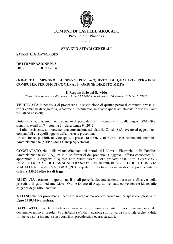 COMUNE DI CASTELL’ARQUATO Provincia di Piacenza ……….. SERVIZIO AFFARI GENERALI SMART CIG ZA70CF13E5 DETERMINAZIONE N. 3 DEL 03.01.2014 OGGETTO: IMPEGNO DI SPESA PER ACQUISTO DI QUATTRO PERSONAL COMPUTER PER UFFICI COMUNALI – ORDINE DIRETTO ME.PA Il Responsabile del Servizio (Giusto decreto sindacale di nomina n. 1 del 02 1 2014 ai sensi dell’art. 50, comma 10, D.Lgs 267/2000) VERIFICATA la necessità di procedere alla sostituzione di quattro personal computer presso gli uffici comunali di Segreteria, Anagrafe e Commercio, in quanto quelli attualmente in uso risultano usurati ed obsoleti; Dato atto che, in adempimento a quanto disposto dall’art.1 - comma 449 – della Legge 488/1999 e ss.mm.ii. e dall’art.7 – comma 2 – della Legge 94/2012: - risulta inesistente, al momento, una convenzione stipulata da Consip SpA, avente ad oggetto beni comparabili con quelli oggetto della presente procedura; - risulta invece possibile attivare apposita procedura di ODA sul Mercato Elettronico della Pubblica Amministrazione (MEPA) della Consip SpA stessa; CONSTATATO che, dalla visura effettuata sul portale del Mercato Elettronico della Pubblica Amministrazione (MEPA), tra le ditte fornitrici del prodotto in oggetto l’offerta economica più appropriata alle esigenze di questo Ente risulta essere quella prodotta dalla Ditta “GIANNONE COMPUTERS SAS DI GIANNONE FRANCO” – PI 01170160889 - CORRENTE IN VIA MACALLÈ N. 5 – 97015 MODICA (RG), la quale offre la fornitura in questione al prezzo unitario di Euro 350,50 oltre iva di legge; RILEVATA pertanto l’opportunità di predisporre la documentazione necessaria all’avvio della procedura di gara mediante ODA –Ordine Diretto di Acquisto- reputata conveniente e idonea alle esigenze degli uffici comunali; ATTESO che per procedere all’acquisto in argomento occorre prenotare una spesa complessiva di Euro 1710,44 iva inclusa; DATO ATTO che la liquidazione avverrà a fornitura avvenuta e previo acquisizione del documento unico di regolarità contributiva e/o dichiarazione sostitutiva da cui si rileva che la ditta fornitrice risulta in regola con i contributi previdenziali ed assistenziali; DATO ATTO altresì che la fornitura in questione risulta necessaria al fine di garantire il regolare funzionamento degli uffici e che pertanto la relativa somma verrà imputata nel bilancio del corrente esercizio in corso di formazione; RICHIAMATO il vigente “regolamento per l’esecuzione di forniture e servizi in economia”; VISTO l’art. 107 del Decreto Legislativo 18 agosto 2000, n. 267; VISTO il parere favorevole di regolarità tecnica del responsabile di servizio, ai sensi dell’art. 147/bis del D.Lgs. 267/2000, nonché il parere favorevole di regolarità contabile ed il visto attestante la copertura finanziaria, rilasciati dal Responsabile del Servizio Finanziario, ai sensi dell’art. 147/bis del D.Lgs. 267/2000; DETERMINA DI PROCEDERE, per i motivi descritti in premessa, tramite ME.PA, all’acquisizione di n. 4 personal computer da assegnare agli uffici comunali di Segreteria – Anagrafe e Commercio in sostituzione di quelli in dotazione non più funzionanti; DI DARE atto della necessità di procedere alla fornitura al fine di garantire il regolare funzionamento degli uffici; DI PRENOTARE pertanto, la spesa complessiva di Euro 1.710,44 iva inclusa, inerente la causale di cui in premessa, così come quantificata nella bozza ODA generata sul MEPA n. 1109497, in apposito intervento del Bilancio 2014 in corso di redazione; DI DARE ATTO che a tale affidamento viene attribuito il seguente codice SMART CIG: ZA70CF13E5; DI DARE ATTO del rispetto delle norme vigenti in materia di acquisto di beni e servizi nelle Pubbliche Amministrazioni; DI TRASMETTERE copia della presente determinazione al responsabile del Servizio Economico Finanziario per gli adempimenti consequenziali; DI DARE ATTO che il presente provvedimento è esecutivo con l’apposizione del parere favorevole di regolarità contabile e del visto attestante la copertura finanziaria, rilasciati dal Responsabile del Servizio Finanziario, ai sensi dell’art. 147/bis del D.Lgs. 267/2000. DI DISPORRE la pubblicazione della presente determinazione sul sito istituzionale dell’Ente, ai sensi e per gli effetti del Decreto Legislativo n. 33/2013 “Obblighi di pubblicità, trasparenza e diffusioni di informazioni da parte delle Pubbliche Amministrazioni”; Il Responsabile del Servizio - Marzia Antonioni – COMUNE DI CASTELL’ARQUATO Provincia di Piacenza ……….. SERVIZIO AFFARI GENERALI ALLEGATO ALLA DETERMINAZIONE N. 3 DEL 03.01.2014 OGGETTO: ACQUISTO DI QUATTRO PERSONAL COMPUTER PER UFFICI COMUNALI - MERCATO ELETTRONICO DELLA P.A. – PARERE DI REGOLARITA’ TECNICA: Il Responsabile del Servizio Affari Generali attesta la regolarità e la correttezza dell’azione amministrativa, ai sensi dell’art. 147/bis , comma 1, del D.Lgs. 267/2000; Castell’Arquato, 03.01.2014 Il Responsabile del Servizio M. Antonioni PARERE DI REGOLARITA’ CONTABILE: Il sottoscritto, Responsabile del Servizio Finanziario, ai sensi dell’art. 147/bis, comma 1, del D.Lgs. 267/2000, esprime il seguente parere di regolarità contabile relativamente alla presente determinazione: FAVOREVOLE VISTO ATTESTANTE LA COPERTURA FINANZIARIA: Importo spesa Euro 1710,44 Castell’Arquato, 03.01.2014 Intervento e capitolo di Bilancio 10108020100 Impegno contabile n. 35924 Il Responsabile del Servizio Finanziario Dr. Massimo Ampollini