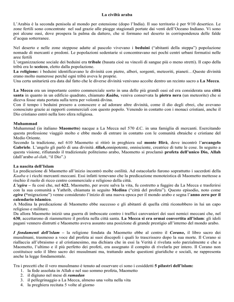La civiltà araba L’Arabia è la seconda penisola al mondo per estensione (dopo l’India). Il suo territorio è per 9/10 desertico. Le zone fertili sono concentrate nel sud grazie alle piogge stagionali portate dai venti dell’Oceano Indiano. Vi sono poi alcune oasi, dove prospera la palma da dattero, che si formano nel deserto in corrispondenza delle falde d’acqua sotterranee. Nel deserto e nelle zone steppose adatte al pascolo vivevano i beduini (“abitanti della steppa”) popolazione nomade di mercanti e predoni. Le popolazioni sedentarie si concentravano nei pochi centri urbani formatisi nelle aree fertili L’organizzazione sociale dei beduini era tribale (basata cioè su vincoli di sangue più o meno stretti). Il capo della tribù era lo sceicco, eletto dalla popolazione. La religione: i beduini identificavano le divinità con pietre, alberi, sorgenti, meteoriti, pianeti…Queste divinità erano molto numerose perché ogni tribù aveva le proprie. Una certa unitarietà era data dal fatto che le diverse divinità venivano accolte dentro un recinto sacro a La Mecca. La Mecca era un importante centro commerciale sorto in una delle più grandi oasi ed era considerata una città santa in quanto in un edificio quadrato, chiamato Kaàba, veniva conservata la pietra nera (un meteorite) che si diceva fosse stata portata sulla terra per volontà divina. Con il tempo i beduini presero a conoscere e ad adorare altre divinità, come il dio degli ebrei, che avevano conosciuto grazie ai rapporti commerciali con questo popolo. Venendo in contatto con i monaci cristiani, anche il Dio cristiano entrò nella loro sfera religiosa. Muhammad Muhammad (in italiano Maometto) nacque a La Mecca nel 570 d.C. in una famiglia di mercanti. Esercitando questa professione viaggiò molto e ebbe modo di entrare in contatto con le comunità ebraiche e cristiane del Medio Oriente. Secondo la tradizione, nel 610 Maometto si ritirò in preghiera sul monte Hirà, dove incontrò l’arcangelo Gabriele. L’angelo gli parlò di una divinità Allah,onnipotente, onnisciente, creatrice di tutte le cose. In seguito a questa visione, rifiutando il tradizionale politeismo arabo, Maometto si proclamò profeta dell’unico Dio, Allah (dall’arabo al-ilah, “il Dio”.) La nascita dell’Islam La predicazione di Maometto all’inizio incontrò molte ostilità. Ad ostacolarlo furono soprattutto i sacerdoti della Kaaba e i ricchi mercanti meccani. Essi infatti temevano che la predicazione monoteistica di Maometto mettesse a rischio il ruolo di ricco centro commerciale e religioso della città. L’egira – fu così che, nel 622, Maometto, per avere salva la vita, fu costretto a fuggire da La Mecca e trasferirsi con la sua comunità a Yathrib, chiamata in seguito Medina (“città del profeta”). Questo episodio, noto come egira (“migrazione”) venne considerato l’inizio di una nuova epoca per il mondo arabo e segna l’anno zero per il calendario islamico. A Medina la predicazione di Maometto ebbe successo e gli abitanti di quella città riconobbero in lui un capo religioso e militare. Da allora Maometto iniziò una guerra di imboscate contro i traffici carovanieri dei suoi nemici meccani che, nel 630, accettarono di riammettere il profeta nella città santa. La Mecca si era ormai convertita all’islam: gli idoli pagani vennero distrutti e Maometto aveva assunto una posizione di grande prestigio all’interno del mondo arabo. I fondamenti dell’islam – la religione fondata da Maometto ebbe al centro il Corano, il libro sacro dei musulmani, trasmesso a voce dal profeta ai suoi discepoli i quali lo trascrissero dopo la sua morte. Il Corano si riallaccia all’ebraismo e al cristianesimo, ma dichiara che in essi la Verità è rivelata solo parzialmente e che a Maometto, l’ultimo e il più perfetto dei profeti, era assegnato il compito di rivelarla per intero. Il Corano non costituisce solo il libro sacro dei musulmani ma, trattando anche questioni giuridiche e sociali, ne rappresenta anche la legge fondamentale. Tra i precetti che il vero musulmano è tenuto ad osservare ci sono i cosiddetti 5 pilastri dell’islam: 1. la fede assoluta in Allah e nel suo sommo profeta, Maometto 2. il digiuno nel mese di ramadan 3. il pellegrinaggio a La Mecca, almeno una volta nella vita 4. la preghiera recitata 5 volte al giorno 5. l’obbligo dell’elemosina L’espansione dell’islam Grazie al suo carisma religioso e alla sua abilità politica, al momento della sua morte (632) Maometto era riuscito, per la prima volta nella storia, ad unificare politicamente e religiosamente la penisola araba. Alla morte del profeta, alla guida dell’islam si succedettero 4 califfi (inizialmente eletti dalla comunità, in seguito si affermerà la successione dinastica). Il califfo (“vicario”, cioè sostituto del profeta) era la guida politica e religiosa della comunità islamica, che si configura quindi come una teocrazia. I califfi seguirono una politica espansionistica che, in pochi decenni, portò l’islam a conquistare vastissimi territori: gli arabi distrussero l’impero persiano e inflissero pesanti sconfitte all’impero bizantino che perse Siria, Egitto e Palestina. Successivamente gli arabi avanzarono in Africa nord-occidentale e da qui nella penisola iberica, che conquistarono (rimanendovi per otto secoli) distruggendo i regno visigoto (711). Anche la Sicilia fu sotto dominazione araba per ben due secoli (tra l’827 e il 1091). L’avanzata araba in Europa venne bloccata solo dai franchi guidati da Carlo Martello nella battaglia di Poitiers (732). Dopo i primi quattro successori di Maometto prese il potere la famiglia degli Omayyadi che si impadronì del califfato e iniziò a trasmetterselo ereditariamente che estesero ulteriormente i domini dello stato islamico dalla Spagna all’India. Nel 750 una rivolta portò all’abbattimento e al massacro degli omayyadi e alla presa di potere degli abbasidi che spostarono la capital