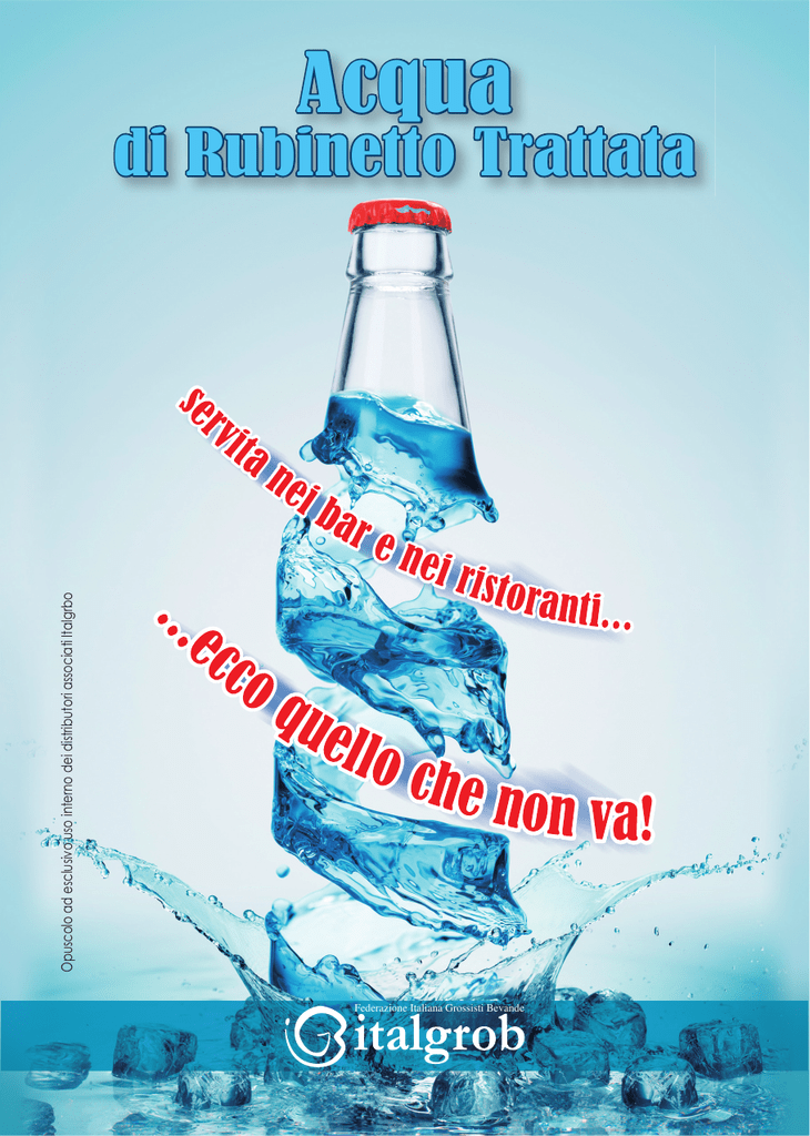 Opuscolo ad esclusivo uso interno dei distributori associati Italgrbo Acqua di Rubinetto Trattata Federazione Italiana Grossisti Bevande Che acqua vuole? Ogni giorno, in alcuni bar e ristoranti italiani si consuma un piccolo raggiro nei confronti dei clienti consumatori: succede quando nel chiedere un bicchiere o una bottiglia di acqua minerale per accompagnare le consumazioni, viene loro servita acqua di rubinetto trattata con filtri. Perché parliamo di raggiro? Il raggiro avviene quando tutto ciò non viene palesemente comunicato al consumatore nei termini che la legge prevede. Mai un consumatore quando si siede al ristorante dice: “Mi porti dell’acqua di rubinetto!”. E nel momento in cui gliela si serve, in una brocca o in bottiglia, si vuol sottendere che quell’acqua, seppur filtrata, ha caratteristiche simili se non migliori dell’acqua minerale. La beffa ulteriore è quando il consumatore è costretto, spesso, a pagarla. 2 Ma gli esercenti lo sanno? Succede purtroppo che, a volte, neanche gli esercenti sono informati o consapevoli delle rilevanti differenze fra l’acqua di rubinetto filtrata e l’acqua minerale così come sgorga dalle sorgenti, e gli stessi esercenti nella loro inconsapevolezza si espongono gratuitamente a rischi e sanzioni. Lo scopo di questo opuscolo è quello di spiegare in modo semplice e immediato quali sono le peculiari differenze fra acqua di rubinetto trattata e acqua minerale; e soprattutto quali sono gli evidenti vantaggi per un barista e un ristoratore di servire ai propri clienti acqua minerale in bottiglia. 3 Sarebbe opportuno chiedere agli esercenti: «Siete sicuri che i vostri clienti vogliono bere acqua di rubinetto trattata?» La risposta la offre un interessante sondaggio della Eurisko che registra negli anni dal 2010 al 2013 un continuo calo di attenzione verso l’acqua trattata. Segno che il consumatore, soprattutto quello informato, comprende i limiti e talvolta le insidie per la propria salute che possono nascondersi nell’acqua di rubinetto trattata. Nel 2013 solo il 28% del campione ha ancora un’opinione positiva Ricerca Eurisko Mentre i giudizi neutri rimangono stabili, aumentano quelli negativi a scapito di quelli positivi 4 Per di più il valore percepito dai consumatori è scarso Domanda: Quanto concordi con le seguenti affermazioni? MOLTO D’ACCORDO L’acqua filtrata dovrebbe essere servita nei ristoranti gratuitamente 76% Allo stesso prezzo, preferisco l’acqua minerale in bottiglia rispetto all’acqua filtrata in caraffa 69% Al ristorante ho più fiducia nell’acqua minerale in bottiglia dell’acqua filtrata in caraffa 67% I ristoranti di qualità servono acqua minerale in bottiglia piuttosto dell’acqua filtrata in caraffa 67% Al ristorante preferisco bere acqua minerale in bottiglia piuttosto dell’acqua filtrata in caraffa 65% Ricerca Eurisko L’indagine ha stabilito che in media quasi il 70% dei consumatori non gradisce bere l’acqua di rubinetto trattata. 5 Acqua di rubinetto trattata Ecco quello che non va! Sistemi di filtrazione sporchi e maltenuti, bottiglie non sufficientemente lavate. Recenti indagini giornalistiche (Le Iene, Striscia la notizia) hanno messo in luce che talvolta è più sana l’acqua del rubinetto così come sgorga, che non dopo essere passata dai filtri dove, se sporchi, a loro volta non possono che riempire l’acqua di batteri e altre sporcizie. Se i clienti e i consumatori avessero queste informazioni, starebbero più attenti nel farsi servire o bere anche un solo bicchiere di acqua di rubinetto trattata, che molte volte è più sporca di quella del rubinetto. http://www.iene.mediaset.it/puntate/2011/10/12/viviani-acqua-depurata_6744.shtml Servizio/denuncia de “Le Iene” sull’acqua trattata servita in alcuni ristoranti di Milano. 6 I consumatori spesso non sanno cosa bevono • Un’acqua trattata perde la garanzia di sicurezza del gestore del servizio idrico che opera bonifiche, disinfezioni, controlli per cercare di erogarla a norma di legge. • Il sistema di trattamento non garantisce la qualità dell’acqua, bottiglia dopo bottiglia, mediante controlli e certificazioni. Tutto si basa su un’efficienza progettuale dell’impianto e su un programma di manutenzione efficace e puntuale: ma alla fine chi ha la responsabilità del risultato quotidiano? • Alcuni aspetti igienico-sanitari fondamentali rimangono senza risposta per una carenza legislativa che tuttora permane, in particolare nell’esercizio di vigilanza ufficiale e nella regolamentazione del processo di trattamento dell’acqua. http://www.striscialanotizia.mediaset.it/video/videoextra.shtml?18726 Servizio di “Striscia La Notizia” sull’acqua demineralizzata servita ai clienti in alcuni ristoranti di Milano. 7 Il paradosso è: Se l’acqua di rubinetto è già potabile perchè filtrarla? Un’inchiesta di Altro Consumo ha stabilito che l’acqua filtrata venduta a volte a caro prezzo nei ristoranti è igienicamente e qualitativamente peggiore di quella di rubinetto. Da indagini e analisi, presso decine di locali fra Roma e Milano, è emerso che i clienti molte volte pagano per bere acqua sporca. Ecco i punti critici dell’indagine: • Igiene: la carica batterica riscontrata è decisamente fuori norma, per assurdo l’acqua presa dal rubinetto, se non filtrata è decisamente migliore di quella filtrata, che non rispetta le norme igieniche previste. • Pseudomonas aeruginosa: presente solo in pochi casi, si tratta di un patogeno sintomo di grave contaminazione che si sviluppa in situazioni di acque stagnanti. Di norma dovrebbe essere del tutto assente perchè causa gravi infezioni. • Nitrati e Nitriti: Pericolosi soprattutto per i neonati e donne in gravidanza, sono tollerati solo in quantità esigue, si sviluppano anch’essi in situazioni di acque stagnanti. • Solventi: Tetracloroetilene e tricloroetilene spesso minacciano le falde acquifere. Nei rilevamenti fortunatamente sono risultati assenti