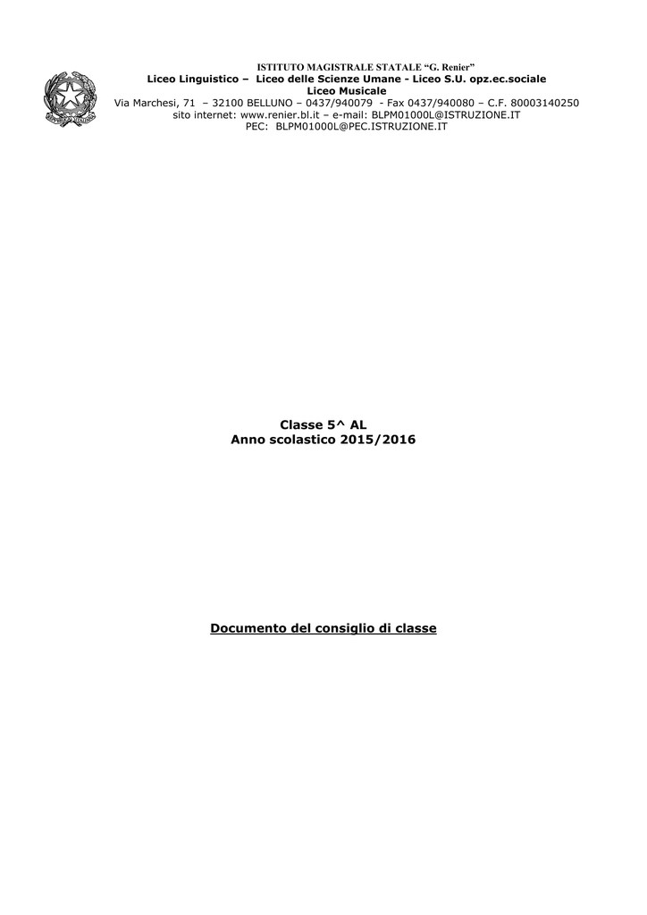 ISTITUTO MAGISTRALE STATALE “G. Renier” Liceo Linguistico – Liceo delle Scienze Umane - Liceo S.U. opz.ec.sociale Liceo Musicale Via Marchesi, 71 – 32100 BELLUNO – 0437/940079 - Fax 0437/940080 – C.F. 80003140250 sito internet: www.renier.bl.it – e-mail: [email protected] PEC: [email protected] Classe 5^ AL Anno scolastico 2015/2016 Documento del consiglio di classe Istituto Magistrale “G. Renier” Belluno Anno scolastico 2015-2016 Classe 5^ AL Presentazione globale della classe: Il nucleo originale contava 30 alunne in prima, ridotto a 22 nel terzo anno e 19 nel quarto. Durante il quarto anno quattro ragazze hanno frequentato l’anno all’estero: di queste, tre si sono iscritte per frequentare la classe quinta. La classe V AL attualmente si compone di 18 elementi. Nel corso del triennio la classe ha subito una certa discontinuità didattica:in quinta sono cambiati gli insegnanti di storia, arte e scienze e conversazione tedesca, in quarta gli insegnanti di matematica, tedesco, scienze, conversazione francese ed educazione fisica. L’attività didattica, che si è sempre svolta in un’atmosfera cordiale ma corretta e rispettosa, è nel complesso risultata discreta, e la partecipazione al dialogo attiva e vivace, con apprezzabili apporti critici e personali, anche se alcuni alunni sono meno inclini alla partecipazione e in qualche materia questa sia avvenuta in modo un po’ disordinato. La frequenza da parte di alcuni alunni , soprattutto nel secondo periodo scolastico è stata discontinua e ciò ha causato il rallentamento delle attività, specialmente nelle materie che godono di poche ore settimanali. Per quanto riguarda i risultati sotto il profilo del profitto, la classe complessivamente raggiunge un livello discreto, anche se naturalmente differenziato, in quanto si evidenzia da parte di alcuni uno studio selettivo, una preparazione e un impegno maggiori in alcune materie rispetto ad altre. Vi è all’interno del gruppo chi si è distinto nel triennio per costanza nello studio, conseguendo un profitto più che buono, sostenendo nel triennio gli esami di certificazione linguistica; vi è però un certo numero di alunni che rientra in una fascia appena sufficiente con alcune lacune o difficoltà settoriali che tuttora permangono , e che solo se opportunamente guidati raggiungono la sufficienza. Sono state somministrate due III prove di tipologia B, che si è rivelata la più adeguata per esprimere al meglio conoscenze e abilità: la prima in data 26 gennaio, la seconda in data 21 aprile. Due simulazioni di I prova sono state proposte il 27 novembre e il 29 febbraio; una simulazione di II prova si è svolta il 24 febbraio. Di seguito si dà indicazione delle visite guidate a mostre o centri di ricerca, partecipazione a conferenze o a rappresentazioni teatrali, stages, etc. • Viaggio di istruzione a Barcellona • Visita alla Biennale di Venezia • Incontro con un volontario dell’ADMO • Certificazioni linguistiche • Convegno “Arbores”nell'ambito della manifestazione”Oltre le vette”. Parte seconda: indicazioni didattiche e programmi disciplinari. ITALIANO-PROF.SSA VERONICA BRONZATO Programma di Italiano letteratura Testo adottato: Barberi Squarotti-Amoretti-Balbis-Bpggione-Mercuri: Contesti Letterari, Atlas editore, vol. 5°/ 6°/7° - La Divina Commedia, testi, strumenti, percorsi di Mineo-Cuccia-Melluso Relazione del docente: Ho iniziato a lavorare con questa classe dalla 2° (in seconda ho insegnato lingua latina). Gli alunni hanno mantenuto nel triennio sempre un ottimo rapporto con il docente, dimostrando rispetto, correttezza e interesse e il lavoro si è svolto complessivamente senza particolari problemi. Il profitto presenta tuttora diverse fasce, ma la maggior parte degli alunni è stabile su livelli in linea di massima discreti, pochi, soprattutto a causa di difficoltà con la produzione scritta, si attestano su livelli sufficienti. Criteri specifici per la selezione, strutturazione e organizzazione del programma: Di ogni periodo letterario sono state sviluppate le caratteristiche generali in base alle quali valutare continuità e differenze e in cui collocare lo studio specifico degli autori. Il programma è stato svolto secondo le previsioni, ma con difficoltà durante il secondo quadrimestre, perché assenze, uscite e vacanze hanno rallentato il lavoro e hanno reso lo studio frammentario. Nel percorso didattico si è data particolare attenzione alla lettura e all’analisi dei testi rispetto alla semplice esposizione schematica della vita e della poetica di ciascun autore. Alcuni romanzi sono stati consigliati in lettura estiva, altre letture antologiche invece sono state di volta in volta date da leggere come compiti per casa e poi riprese e commentate in classe, nonché continuamente ripassate durante le interrogazioni. Attraverso la lettura dei testi, infatti, si sono colti i tratti stilistici e contenutistici di ogni autore, messo in relazione col proprio periodo storico e con la provenienza sia geografica sia sociale. Con un costante confronto di autori tra loro diversi o distanti cronologicamente, simili o diametralmente opposti nelle rispettive poetiche e tematiche, si è cercato di evitare l’apprendimento mnemonico per stimolare, o almeno incoraggiare, una maturazione critica da parte degli alunni. Obiettivi disciplinari si fa riferimento al POF. Gli obiettivi programmati risultano raggiunti, seppur in modo differenziato: la maggioranza degli allievi ha saputo valorizzare le proprie capacità con studio regolare e in alcuni casi approfondito, ottenendo un profitto da discreto ad eccellente. Solo pochi alunni presentano un livello globale appena sufficiente, dovuto soprattutto ad una generica povertà lessicale che si ripercuote nell’esposizione sia scritta che orale. In rare occasioni sono emerse superficialità nell’argomentazione e nell’esposizione, per lo più evidenti nelle prove scritte. Globalmente positivo è stat