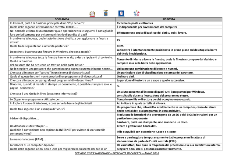 DOMANDA In Internet, qual è la funzione principale di un "Pop Server"? Quale delle seguenti affermazioni è corretta. Il BIOS..... Nel normale utilizzo di un computer quale operazione tra le seguenti è consigliabile fare periodicamente per evitare ogni rischio di perdita di dati? In ambiente Windows, quale tasto funzione si utilizza per aggiornare la finestra attiva? Quale tra le seguenti non è un'unità periferica? Dopo che si è attivata una finestra in Windows, che cosa accade? In ambiente Windows tutte le finestre hanno in alto a destra i pulsanti di controllo. Qual è la funzione del pulsante che ha per icona un trattino nella parte bassa? Nello scegliere una password che garantisca una buona sicurezza è buona norma.... Che cosa si intende per "corsivo" in un sistema di videoscrittura? Quale di queste funzioni non è propria di un programma di videoscrittura? Che cosa si intende per paragrafo nei programmi di videoscrittura? Di norma, quando si manda in stampa un documento, è possibile stampare solo le pagine desiderate? Che cosa è una Guida in linea (accezione informatica)? Lo Zipper è un programma utilizzato per.... In Esplora Risorse di Windows, a cosa serve la barra degli indirizzi? Quale tra i seguenti è un esempio di "virus"? I driver di dispositivo.... Un database è utilizzato per.... Quali file è conveniente non copiare da INTERNET per evitare di scaricare file contenenti virus? RISPOSTA Ricevere la posta elettronica É indispensabile per l'avviamento del computer Effettuare una copia di back-up dei dati su cui si lavora. F5. ROM. La finestra è istantaneamente posizionata in primo piano sul desktop e la barra del titolo è evidenziata. Consente di ridurre a icona la finestra, ossia la finestra scompare dal desktop e compare solo sulla barra delle applicazioni. Utilizzare una combinazione di lettere e numeri. Un particolare tipo di visualizzazione e stampa del carattere. Ordinare dati. La porzione di testo tra un a capo e quello successivo. Sì. Un aiuto presente all'interno di quasi tutti i programmi per Windows, consultabile durante l'esecuzione del programma stesso. Comprimere file o directory perché occupino meno spazio. Ad indicare in quale cartella ci si trova. Un programma che, introdotto subdolamente in un computer, causa dei danni anche seri ai dati o ai programmi in esso archiviati. Traducono le istruzioni che provengono da un SO o dal BIOS in istruzioni per un particolare componente hardware, quali una stampante, uno scanner o un disco. Creare e gestire una banca dati. I file eseguibili con estensione «.exe» e «.com» Serve a parcheggiare temporaneamente dati e programmi in attesa di elaborazione da parte dell'unità centrale (CPU). La velocità di un computer dipende: Da vari fattori, tra i quali la frequenza del processore e la sua architettura interna. Quale delle seguenti azioni non è utile per migliorare la sicurezza dei dati di un Scegliere nomi che si possono ricordare facilmente. SERVIZIO CIVILE NAZIONALE – PROVINCIA DI CASERTA – ANNO 2016 La memoria interna (RAM).... DOMANDA computer? Quale tra i seguenti software è più adatto per la riproduzione di un testo? Nei nomi dei file, l'estensione ha lo scopo di.... Quale di queste periferiche può sostituire il TOUCH PAD? L'evento che si verifica quando un apparato non riceve risposta ad un'interrogazione entro un periodo di tempo prefissato è chiamato.... Per poter utilizzare un computer non è indispensabile avere... Quale dei seguenti nomi identifica un sistema operativo? Qual è la lunghezza massima consentita per un file di testo? É corretto affermare che disporre di una stampante non è indispensabile per l'utilizzo di un computer? Per BOOTSTRAP si intende: In un database, lo scopo degli indici è quello di.... Il software completamente gratuito e a disposizione degli utenti è chiamato.... In Windows è possibile vedere quali file sono stati utilizzati recentemente? In una stampante ad aghi è necessario cambiare periodicamente.... Utilizzando una tastiera di tipo italiano (QWERTY), spostandosi da sinistra a destra sulla stessa riga, quale tasto si trova dopo il tasto "Q"? Quale, tra i seguenti, è il termine inglese con cui si definiscono genericamente virus, worms, Trojanhorses, etc.? Quale delle seguenti affermazioni meglio definisce una query? In un Database Relazionale, una chiave può essere composta da.... Che tipo di file è possibile allegare ad un messaggio di posta elettronica? Quale è la prima pagina che viene caricata all'avvio di un browser? Quali sono le funzioni delle icone in un sistema operativo a finestre? Quale delle seguenti affermazioni è corretta? Che cosa si intende per «testo giustificato» in un programma di elaborazione testi? In un programma di videoscrittura, la combinazione di tasti "Ctrl+Freccia sinistra": Quale delle seguenti affermazioni è falsa? Quale delle seguenti affermazioni relative al Sistema operativo Linux è falsa? Per gestire la posta elettronica occorre un opportuno programma. Quale tra i RISPOSTA Writer di Open Office. Associare al file il programma che lo debba elaborare. Mouse. Time-out. Una scheda audio. Windows 7. Qualsiasi. Si. Per poter utilizzare un computer non è indispensabile avere una stampante. Il processo di inizializzazione della macchina. Trovare o ordinare più rapidamente i record dell'archivio. Freeware. Sì, cliccando su «Avvio», «Dati recenti». Il nastro. Il tasto "W". Malware. Seleziona e presenta i dati che soddisfano le condizioni specificate. Più campi. Qualsiasi tipo di file. La pagina che è stata specificata nelle opzioni del browser. Rappresentano con un'immagine evocativa un documento o un'applicazione. Il Byte è un insieme di Bit. Testo in cui la larghezza di ogni riga del paragrafo è adattata ai margini della pagina. Sposta il cursore alla parola precedente. I monitor sono tutti di 15 pollici. É generalmente considerato non molto performante ancorché poco costoso o addirittura gratuito. Excha