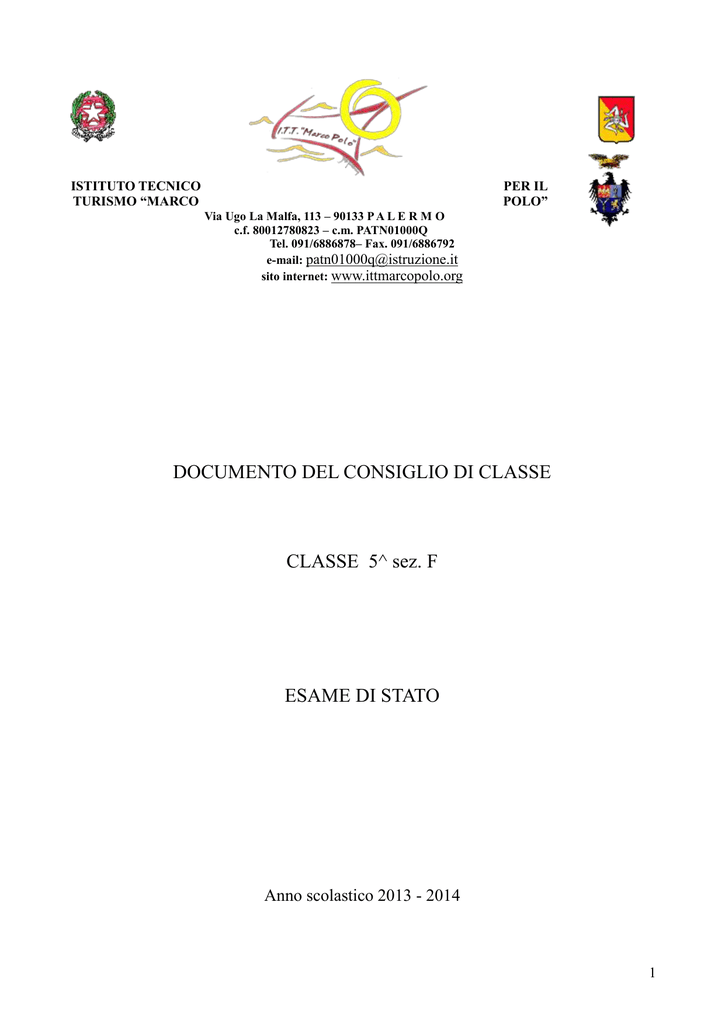 ISTITUTO TECNICO TURISMO “MARCO PER IL POLO” Via Ugo La Malfa, 113 – 90133 P A L E R M O c.f. 80012780823 – c.m. PATN01000Q Tel. 091/6886878– Fax. 091/6886792 e-mail: [email protected] sito internet: www.ittmarcopolo.org DOCUMENTO DEL CONSIGLIO DI CLASSE CLASSE 5^ sez. F ESAME DI STATO Anno scolastico 2013 - 2014 1 SOMMARIO IL CONSIGLIO DI CLASSE PROFILO DI INDIRIZZO PRESENTAZIONE ED EVOLUZIONE DELLA CLASSE ATTIVITÀ CURRICULARI ED EXTRACURRICULARI SVOLTE DALLA CLASSE COME PREPARAZIONE AGLI ESAMI DI STATO SIMULAZIONE DELLE PROVE D’ESAME E GRIGLIA DI VALUTAZIONE SCHEDE PER SINGOLE MATERIE 2 Il Consiglio di Classe Corso ordinario Disciplina Lingua e Lettere Italiane Storia ed Educazione Civica Storia dell'Arte Francese (teoria) Francese (conv.) Inglese (teoria) Inglese (conv.) Tedesco (teoria) Tedesco (conv.) Geografia generale, econ. e tur. Tecnica Turistica Pratica di Agenzia Ragioneria Diritto e Legislazione Turistica Scienza delle Finanze Educazione Fisica Religione Docente Firma Riotta Anita Peralta Elena Chirco Adriana Gambino Francesca Lesnes Elisabeth Monforte Corinzia Walsh Heater D’Amico Donata Luft Sabine Dalia Salvatore Di Bartolo Natale Parisi Mario Scoma Roberta Mannino Patrizia Mannino Patrizia Pennacchio Concetta Scambia Paola 3 Profilo dell’ indirizzo Il corso di studi conferisce un titolo per l’inserimento nel mondo del lavoro con prospettive professionali di: dirigente e quadro intermedio presso istituzioni ed enti pubblici e privati che operano nel settore della produzione, commercializzazione e realizzazione di servizi turistici; dirigente e quadro intermedio in Agenzie di Viaggio, Hotel, Villaggi Turistici, Compagnie di trasporto aereo, di navigazione marittima e di trasporto ferroviario; accompagnatore e guida turistica, hostess e steward; addetto alla commercializzazione e marketing; organizzazione congressuale; operatore del settore della conservazione dei beni culturali e della salvaguardia dell’ambiente. Il perito per il turismo deve possedere una formazione culturale adeguata e una competenza linguistica e comunicativa che gli consentano di interagire efficacemente in qualsiasi ambito lavorativo. Attraverso le conoscenze e le capacità acquisite nei cinque anni di studio, sarà in grado di: operare all’interno di una agenzia di viaggio con mansioni di tipo amministrativo-contabile e/o commerciale, di prenotazione e tariffazione dei servizi di trasporto e alberghieri, di organizzazione di viaggi, o con compiti di direzione e coordinamento delle attività gestionali; organizzare e gestire visite guidate, tour ed escursioni per turisti italiani e stranieri; operare all’interno di una struttura ricettiva con mansioni di tipo amministrativo-contabile e/o commerciale o con compiti di direzione e coordinamento delle attività gestionali; operare nel settore dei beni culturali e ambientali. Conoscenze Il perito per il turismo deve: conoscere il percorso storico-politico, culturale e artistico del nostro paese; conoscere le lingue e le culture straniere anche riguardo al linguaggio specialistico dell’ambito del turismo; conoscere gli aspetti fisici, antropici e turistici del territorio e la metodologia utile alla sua analisi e valutazione; conoscere i processi che caratterizzano la gestione e il funzionamento di una azienda turistica. Capacità Il perito per il turismo deve essere in grado di: usare un linguaggio appropriato e specifico delle discipline; gestire il proprio lavoro in modo flessibile; lavorare in gruppo, mettendo a sistema strumenti, strutture, immagini e metodologie; ricercare, dedurre, elaborare informazioni, anche estemporanee, traducendole in modo efficace in linguaggio verbale, numerico, geografico, informatico, cartografico e promozionale. Competenze Il perito per il turismo deve: essere in grado di formulare autonomamente opinioni e valutazioni; essere in grado di comunicare ed interagire nelle lingue straniere di indirizzo in relazione alle diverse situazioni dello specifico turistico; sapere analizzare un’area territoriale nel suo complesso, identificandone i fondamentali elementi costitutivi fisici, antropici e turistici e le loro interdipendenze; saper costruire il profilo turistico di un territorio sulla base di conoscenze, schemi geografici, artistici, storici, tecnici, giuridici e linguistici acquisiti; saper interpretare e redigere itinerari turistici, elaborando programmi di interesse culturale, geografico ed artistico; sapere individuare obiettivi di mercato e strategie di marketing. 4 Presentazione della classe Elenco alunni n°. 1. 2. 3. 4. 5. 6. 7. 8. 9. 10. 11. 12. 13. 14. 15. 16. 17. 18. Cognome e Nome Buffa Alessio Buffa Simona Cinà Simone Cottone Umberto Di Cara Federico Di Fiore Michele Genzardi Agata Giambanco Serena La Ciura Giovanni Lucchese Giuseppe Maltese Francesca Matranga Giuseppina Morana Jessica Patané Ylenia Pellegrino Tiziana Ricupero Roberta Riso Giulio Tricoli Davide Profilo della classe La classe è formata da 18 alunni (9 ragazzi e altrettante ragazze), tutti provenienti dalla ex 4a F. Il percorso scolastico nel corso triennio ha visto un graduale ma nel complesso costante processo di crescita che ha consentito di migliorare la preparazione di base, che per alcuni risultava lacunosa, e di acquisire gran parte delle principali conoscenze e competenze delle diverse discipline. Nel presente anno scolastico la frequenza e la partecipazione sono risultate buone, pertanto il livello di preparazione medio è risultato pienamente sufficiente. Alcuni alunni più motivati e maggiormente interessati all’approfondimento dei contenuti proposti hanno evidenziato una partecipazione attiva e costruttiva al dialogo educativo e maturato un valido metodo di lavoro, raggiungendo un buon livello di preparazione in quasi tutte le discipline. 5 Attività curriculari ed extracurriculari svolte dalla classe come preparazione agli esami di stato Viaggio d’istruzione Missione Intergovernativa Italia-Israele. 