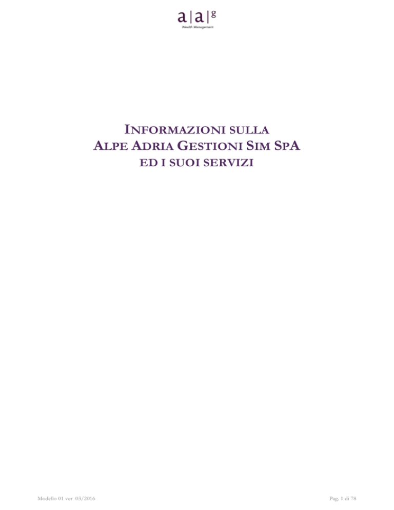INFORMAZIONI SULLA ALPE ADRIA GESTIONI SIM SPA ED I SUOI SERVIZI Modello 01 ver 03/2016 Pag. 1 di 78 Egregio Signore, Gentile Signora, secondo quanto previsto dalla normativa vigente, Le forniamo, di seguito, le informazioni necessarie, affinché possa meglio comprendere la natura dei servizi di investimento e dei servizi accessori prestati dalla Sim, il tipo di strumenti finanziari trattati, i rischi che li accompagnano e, di conseguenza, possa assumere le Sue decisioni di investimento con piena consapevolezza. Le informazioni ivi presenti sono sempre aggiornate e continuamente accessibili. Rimaniamo a disposizione per ogni Sua esigenza e La ringraziamo per l’attenzione che ci ha dimostrato. Distinti saluti Modello 01 ver 03/2016 Pag. 2 di 78 Sommario Principi generali .............................................................................................................................................................................................. 5 Definizioni .................................................................................................................................................................................................. 5 Informazioni sulla Società ............................................................................................................................................................................. 6 Metodi di comunicazione utilizzati fra la Sim ed il Cliente ................................................................................................................ 7 Autorizzazioni alla prestazione dei servizi di investimento ed accessori ......................................................................................... 7 Informazioni generali sui contratti .............................................................................................................................................................. 8 Informazioni sui costi e sugli oneri ............................................................................................................................................................. 8 I Servizi di Investimento ............................................................................................................................................................................... 9 Ricezione e trasmissione di ordini riguardanti uno o più strumenti finanziari e Servizio di mediazione .................................. 9 Modalità di svolgimento del servizio ................................................................................................................................................ 9 La rischiosità del servizio .................................................................................................................................................................... 9 Costi e oneri .......................................................................................................................................................................................... 9 Collocamento senza assunzione a fermo né assunzione di garanzia nei confronti dell’emittente .............................................. 9 Modalità di svolgimento del servizio .............................................................................................................................................. 10 La rischiosità del servizio .................................................................................................................................................................. 10 Costi e oneri ........................................................................................................................................................................................ 10 Consulenza in materia di investimenti ................................................................................................................................................. 10 Modalità di svolgimento del servizio .............................................................................................................................................. 11 La rischiosità della consulenza ......................................................................................................................................................... 11 Costi ed oneri ...................................................................................................................................................................................... 11 Gestione di portafogli ............................................................................................................................................................................. 12 Caratteristiche generali ...................................................................................................................................................................... 12 La rischiosità di una linea di gestione ............................................................................................................................................. 14 La leva finanziaria ............................................................................................................................................................................... 14 Tipologia delle operazioni ................................................................................................................................................................. 14 Gli strumenti finanziari inseribili nella linea di gestione .............................................................................................................. 15 Informazioni sul metodo e la frequenza di valutazione degli strumenti finanziari contenuti nel portafoglio gestito ...... 15 Valorizzazione degli strumenti finanziari ....................................................................................................................................... 15 Metodo d