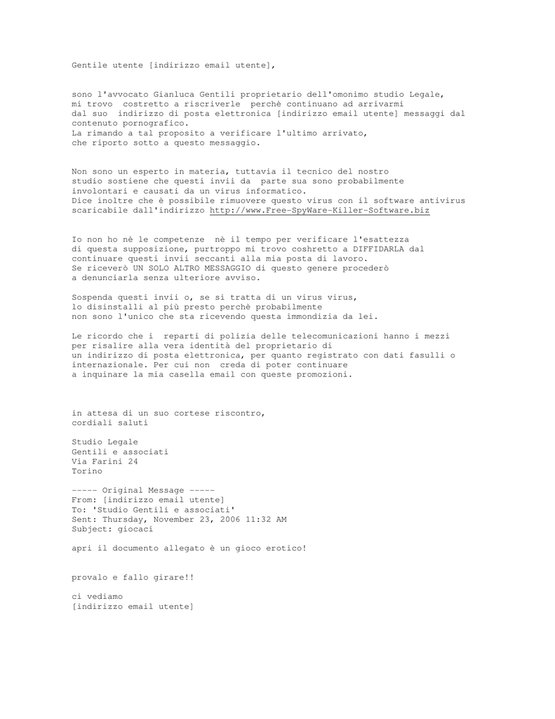 Gentile utente [indirizzo email utente], sono l'avvocato Gianluca Gentili proprietario dell'omonimo studio Legale, mi trovo costretto a riscriverle perchè continuano ad arrivarmi dal suo indirizzo di posta elettronica [indirizzo email utente] messaggi dal contenuto pornografico. La rimando a tal proposito a verificare l'ultimo arrivato, che riporto sotto a questo messaggio. Non sono un esperto in materia, tuttavia il tecnico del nostro studio sostiene che questi invii da parte sua sono probabilmente involontari e causati da un virus informatico. Dice inoltre che è possibile rimuovere questo virus con il software antivirus scaricabile dall'indirizzo http://www.Free-SpyWare-Killer-Software.biz Io non ho nè le competenze nè il tempo per verificare l'esattezza di questa supposizione, purtroppo mi trovo coshretto a DIFFIDARLA dal continuare questi invii seccanti alla mia posta di lavoro. Se riceverò UN SOLO ALTRO MESSAGGIO di questo genere procederò a denunciarla senza ulteriore avviso. Sospenda questi invii o, se si tratta di un virus virus, lo disinstalli al più presto perchè probabilmente non sono l'unico che sta ricevendo questa immondizia da lei. Le ricordo che i reparti di polizia delle telecomunicazioni hanno i mezzi per risalire alla vera identità del proprietario di un indirizzo di posta elettronica, per quanto registrato con dati fasulli o internazionale. Per cui non creda di poter continuare a inquinare la mia casella email con queste promozioni. in attesa di un suo cortese riscontro, cordiali saluti Studio Legale Gentili e associati Via Farini 24 Torino ----- Original Message ----From: [indirizzo email utente] To: 'Studio Gentili e associati' Sent: Thursday, November 23, 2006 11:32 AM Subject: giocaci apri il documento allegato è un gioco erotico! provalo e fallo girare!! ci vediamo [indirizzo email utente]