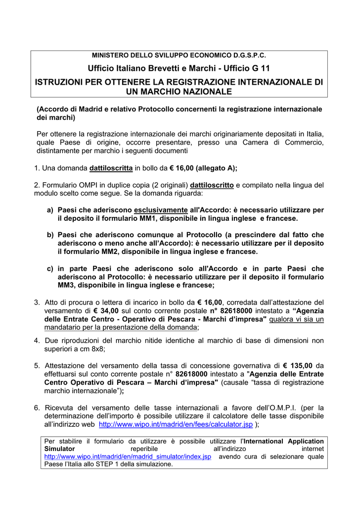 MINISTERO DELLO SVILUPPO ECONOMICO D.G.S.P.C. Ufficio Italiano Brevetti e Marchi - Ufficio G 11 ISTRUZIONI PER OTTENERE LA REGISTRAZIONE INTERNAZIONALE DI UN MARCHIO NAZIONALE (Accordo di Madrid e relativo Protocollo concernenti la registrazione internazionale dei marchi) Per ottenere la registrazione internazionale dei marchi originariamente depositati in Italia, quale Paese di origine, occorre presentare, presso una Camera di Commercio, distintamente per marchio i seguenti documenti 1. Una domanda dattiloscritta in bollo da € 16,00 (allegato A); 2. Formulario OMPI in duplice copia (2 originali) dattiloscritto e compilato nella lingua del modulo scelto come segue. Se la domanda riguarda: a) Paesi che aderiscono esclusivamente all'Accordo: è necessario utilizzare per il deposito il formulario MM1, disponibile in lingua inglese e francese. b) Paesi che aderiscono comunque al Protocollo (a prescindere dal fatto che aderiscono o meno anche all’Accordo): è necessario utilizzare per il deposito il formulario MM2, disponibile in lingua inglese e francese. c) in parte Paesi che aderiscono solo all'Accordo e in parte Paesi che aderiscono al Protocollo: è necessario utilizzare per il deposito il formulario MM3, disponibile in lingua inglese e francese; 3. Atto di procura o lettera di incarico in bollo da € 16,00, corredata dall’attestazione del versamento di € 34,00 sul conto corrente postale n° 82618000 intestato a “Agenzia delle Entrate Centro - Operativo di Pescara - Marchi d’impresa" qualora vi sia un mandatario per la presentazione della domanda; 4. Due riproduzioni del marchio nitide identiche al marchio di base di dimensioni non superiori a cm 8x8; 5. Attestazione del versamento della tassa di concessione governativa di € 135,00 da effettuarsi sul conto corrente postale n° 82618000 intestato a "Agenzia delle Entrate Centro Operativo di Pescara – Marchi d’impresa" (causale “tassa di registrazione marchio internazionale”); 6. Ricevuta del versamento delle tasse internazionali a favore dell’O.M.P.I. (per la determinazione dell’importo è possibile utilizzare il calcolatore delle tasse disponibile all’indirizzo web http://www.wipo.int/madrid/en/fees/calculator.jsp ); Per stabilire il formulario da utilizzare è possibile utilizzare l’International Application Simulator reperibile all’indirizzo internet http://www.wipo.int/madrid/en/madrid_simulator/index.jsp avendo cura di selezionare quale Paese l’Italia allo STEP 1 della simulazione. Allegato A Modello di domanda per la registrazione internazionale dei marchi Al Ministero dello Sviluppo Economico Ufficio Italiano Brevetti e marchi Ufficio G 11 Internazionali Marchi Comunitari e ROMA Il sottoscritto (generalità complete del richiedente e del mandatario, se vi sia, cognome e nome, CAP, città, via e numero) titolare del marchio nazionale (numero e data di concessione del marchio, oppure data e numero di deposito se si tratta di marchio non ancora concesso) costituito da (descrizione sintetica del marchio) e destinato a contraddistinguere (elenco dei prodotti corrispondente esattamente a quello del marchio nazionale, o coperto dallo stesso) chiede a codesto Ministero di far registrare lo stesso marchio presso l'O.M.P.I. di Ginevra allo scopo di garantirsene il diritto esclusivo nei seguenti Stati (elencare i paesi per i quali si chiede la protezione). (1) Alla presente domanda si allegano (elencare i prescritti documenti) Data.................. IL RICHIEDENTE 1) Solo se si utilizza il formulario MM3, cioè nel caso in cui si designano sia paesi aderenti all'Accordo che paesi aderenti al Protocollo, e il marchio nazionale di base non è ancora stato concesso, occorre aggiungere la seguente richiesta: "La presente domanda deve essere considerata dipendente sia dall'Accordo che dal Protocollo" Camera di Commercio Industria Artigianato e Agricoltura di Pavia Ufficio Conciliazione - Brevetti Via Mentana 27 (1° piano) 27100 PAVIA tel. 0382/393211 fax 0382/393243 Mail: [email protected] sito internet: www.pv.camcom.gov.it All’atto del deposito dovranno inoltre essere forniti: Se il depositante richiede copia autentica del verbale di deposito: una marca da bollo da € 16,00 e attestazione di versamento sul bollettino di conto corrente n. 10618270 intestato alla Camera di Commercio Industria Artigianato e Agricoltura di Pavia di € 43,00 comprensivi di diritti per presentazione e rilascio copia autentica del verbale di deposito. (causale del versamento: indicare: ‘’ diritti deposito marchio internazionale ’’) Se l’interessato non desidera copia autentica del verbale è dovuto unicamente un versamento di € 40,00. Qualora siano designati nella domanda internazionale gli Stati Uniti d’America occorrerà presentare anche il formulario OMPI MM18 in duplice copia (DECLARATION OF INTENTION TO USE THE MARK – UNITED STATES OF AMERICA). N.B: Si informa che sia la domanda rivolta all’U.I.B.M. Ufficio G 11 che la modulistica internazionale devono essere tassativamente dattiloscritte (compilazione a macchina da scrivere o a mezzo computer). La modulistica internazionale ( Mod. MM1, MM2, MM3, MM18 ecc. ) è disponibile in versione http://www.wipo.int/madrid/en/forms/ compilabile (modelli alle in seguenti versione pagina internet: lingua inglese) http://www.wipo.int/madrid/fr/forms/ (modelli in versione lingua francese). Il depositante è tenuto ad esibire all’addetto alla ricezione un documento d’identità in corso di validità. Fotocopia di tale documento sarà conservata agli atti dell’Ufficio LE DOMANDE POSSONO ESSERE PRESENTATE PRESSO L’UFFICIO CONCILIAZIONE BREVETTI DELLA CAMERA DI COMMERCIO DI PAVIA – VIA MENTANA 27 ESCLUSIVAMENTE DALLE ORE 9 ALLE ORE 12 DI OGNI GIORNO LAVORATIVO ESCLUSO IL SABATO. PER EVITARE LUNGHE ATTESE SI CONSIGLIA DI FISSARE UN APPUNTAMENTO.
