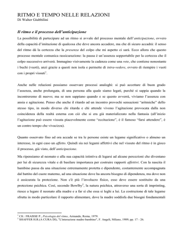 RITMO E TEMPO NELLE RELAZIONI Di Walter Giubbilini Il ritmo e il processo dell’anticipazione La possibilità di partecipare ad un ritmo si avvale del processo mentale dell’anticipazione, ovvero della capacità d’imitazione di qualcosa che deve ancora accadere, ma che di sicuro accadrà: il senso del ritmo dà la certezza che la presenza del colpo che mi aspetto ci sarà. Ecco allora che questo processo mentale comunica rassicurazione: la pausa è un’assenza sopportabile per la certezza che il colpo successivo arriverà. Immagino visivamente la cadenza come una rete, che contiene nonostante i buchi (vuoti), anzi grazie a questi non isola e permette di intra-vedere, ovvero di riempire i vuoti con i propri vissuti1. Anche nelle relazioni possiamo osservare processi analoghi: si può accettare di buon grado l’assenza, anche prolungata, di una persona alla quale siamo legati, purché si sappia quando la incontreremo di nuovo; ma se non sappiano quando e se questo avverrà, viviamo l’assenza con ansia e agitazione. Penso che anche il ritardo ad un incontro provochi sensazioni “aritmiche” dello stesso tipo, in modo diverso chi ritarda e chi attende vivono l’agitazione provocata dalla non coincidenza della realtà esterna con ciò che si era già materializzato nella fantasia (all’inizio l’agitazione può essere vissuta piacevolmente come “eccitazione”, è il famoso “farsi attendere”, è un contro tempo che vivacizza). Quanto osservato fino ad ora accade se tra le persone esiste un legame significativo o almeno un interesse, in ogni caso un affetto. Quindi sia nei legami affettivi che nel vissuto del ritmo è in gioco il processo, già visto, dell’anticipazione. Ma ripensiamo al neonato e alla sua capacità istintiva di legarsi ad alcune percezioni che diventano per lui di sicurezza vitale e di basilare importanza per costruire rapporti affettivi. Con la nascita il bambino passa da una situazione estremamente protetta e dipendente, costantemente accompagnata dal battito del cuore materno, ad una situazione dove ha ancora bisogno di dipendenza, ma dove non è assicurata la protezione. Non c'è più l’involucro fisico, esso deve essere sostituito da una protezione psichica. Così, secondo Bowlby2, la natura psichica, attraverso una sorta di imprinting, riesce a legare il neonato alla madre e a far sì che essa si leghi a lui. La costruzione di tale legame sfrutta in modo particolare il rapporto alimentare, dove la madre soddisfa due bisogni fondamentali 1 2 Cfr.: FRAISSE P., Psicologia del ritmo, Armando, Roma, 1979. SHAFFER H.R.(A CURA DI), "L'interazione madre-bambino", F. Angeli, Milano, 1989; pp. 17 - 26. del figlio: a) il bisogno di sazietà (presenza interna); b) il bisogno di contatto come riattualizzazione dell’ambiente intrauterino (calore, tocco e battito cardiaco: presenza esterna). Questa presenza rassicurante è basata, all’inizio, sulla percezione sensoriale: il piccolo si sveglia, ha fame, piange, la madre compare e lui si placa. Ma dopo il primo grande passo dello sviluppo psichico, la nascita dell’immaginazione (che si costruisce proprio come risposta all’angoscia dell’assenza e che si basa sul piacere della presenza), il bambino ha la capacità di attendere, all’inizio non per molto, in quanto riesce a evocare in sé ciò che ancora non è percepibile attraverso i sensi. Questa evocazione contiene un’importante stato emotivo: la certezza che la madre si renderà presente perché comunque esiste (esiste dentro di sé ...). Infatti se l’assenza si prolunga questo stato emotivo, ancora labile, si trasforma facilmente in disperazione. Ho pensato che questa dinamica affettiva sia la base su cui si costruisce il processo dell’anticipazione, che usufruisce anche di altre competenze: per anticipare non solo devo saper immaginare, ma anche prevedere, coordinare i movimenti e presupporre i tempi in gioco. 3 Queste capacità si sviluppano in special modo con l’imitazione, che comunque è, all’inizio, un esercizio affettivo. Immaginazione, coordinazione psicomotoria, previsione dei tempi in gioco: ecco i pilastri del senso del ritmo. E tutti e tre i pilastri poggiano su un unico basamento: le strutture costruite attraverso le prime relazioni affettive. Ho pensato, come esempio, al comportamento del bambino nei primi giorni di asilo. Normalmente il bambino piange quando la mamma va via, non sa quando la rivedrà, quindi non sa se la rivedrà! Ma con il passare dei giorni diventa capace di usare l’anticipazione, prende il ritmo tra le presenze all’inizio e alla fine delle ore d’asilo; se il ritmo cambia il bambino prova infatti un’emozione che può essere di sorpresa o di disagio, a seconda dei casi. Il significato di tempo nella relazione analitica Spazio e tempo sono dimensioni inscindibili di un’unica realtà, come afferma anche la fisica relativistica. Tuttavia, secondo la mia esperienza, la dimensione temporale, nella maggior parte dei casi, si evidenzia successivamente nel transfert rispetto a quella spaziale. In effetti anche la sua percezione è più raffinata, il tempo lo possiamo valutare solo se è legato ad un movimento, ad una trasformazione, interna od esterna. Ma, come già osservato, le prime percezioni legate al tempo sono costituite da eventi ritmici: il battito cardiaco della madre, il respiro, le poppate e in seguito l’alternanza notte–giorno, le stagioni, fino al tempo astratto e oggettivo degli orologi, che tuttavia è basato sempre su un ritmo, che sia il tic–tac di un pendolo o la frequenza di un cristallo di quarzo a 3 Cfr.: FRAISSE P., op. citata. poca importanza. Per l’esperienza umana gli eventi ritmici sono quindi generatori di tempo; è questa particolarità che, a mio avviso, crea un collegamento con lo spazio, là dove il tempo racchiuso tra il “tic” e il “tac” equivale per certi aspetti allo spazio contenuto tra le pareti; questa caratteristica contenitiva del tempo–ritmo ha una