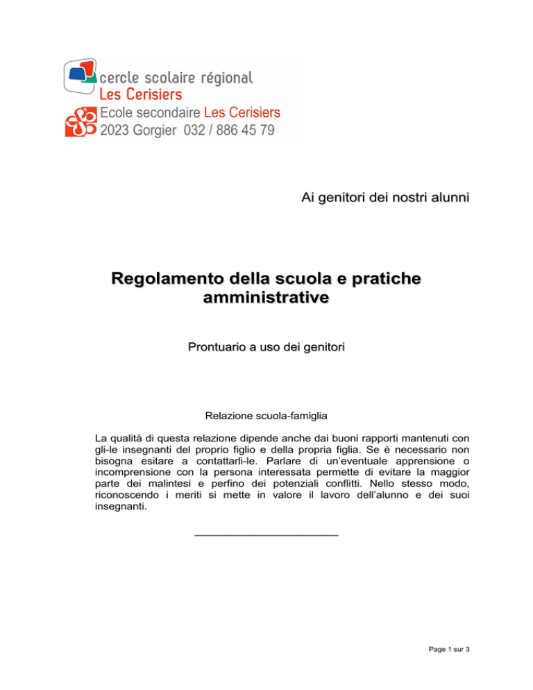 Ai genitori dei nostri alunni Regolamento della scuola e pratiche amministrative Prontuario a uso dei genitori Relazione scuola-famiglia La qualità di questa relazione dipende anche dai buoni rapporti mantenuti con gli-le insegnanti del proprio figlio e della propria figlia. Se è necessario non bisogna esitare a contattarli-le. Parlare di un’eventuale apprensione o incomprensione con la persona interessata permette di evitare la maggior parte dei malintesi e perfino dei potenziali conflitti. Nello stesso modo, riconoscendo i meriti si mette in valore il lavoro dell’alunno e dei suoi insegnanti. ________________________ Page 1 sur 3 1. Riunioni con i genitori Delle riunioni con i genitori sono organizzate per le classi di ogni livello ; tutte le riunioni si svolgono a scuola e in serata. Per ciascuna di esse un invito è indirizzato ai genitori. Se è necessario, l’insegnante principale o i genitori possono organizzare ulteriori riunioni. 2. Mediazione scolastica Oltre agli insegnanti e alla direzione, gli alunni o i genitori possono contattare un mediatore scolastico. 3. Agenda scolastica Pregasi leggere attentamente le prime pagine dell’agenda scolastica. È vostro compito tenervi informati sui voti e sulle osservazioni riguardo i propri figli riferiti nella suddetta agenda. Indispensabile per la vostra informazione, l’agenda scolastica deve essere firmata ogni settimana. 4. Regolamento di disciplina Pregasi leggere attentamente il regolamento di disciplina o rileggerlo con i propri figli. 5. Codice di condotta relativo all’utilizzo di Internet Pregasi leggere il suddetto documento con i propri figli e consegnare il formulario allegato entro il venerdì della prima settimana del rientro scolastico. 6. Congedi vari e visite mediche Il vademecum è contenuto nel regolamento di disciplina. Nell’interesse degli alunni, tutti i trattamenti ambulatoriali verranno eseguiti al di fuori del tempo scolastico. I genitori faranno pervenire le giustificazioni tramite l’agenda scolastica riempiendo l’apposita rubrica. 7. Pasti caldi per gli alunni Tutte le informazioni necessarie sono riferite nel documento « Servizio di pasti caldi : condizioni di utilizzo ». 8. Assicurazione scolastica Dal primo gennaio 1996, in caso di malattie o di incidenti la copertura dei rischi incombe esclusivamente sui genitori tramite le assicurazioni private. Questo vale anche per le spese dentarie. 9. Attività culturali e sportive Nel quadro della formazione generale dei ragazzi, accanto alle materie di studio, la nostra scuola organizza attività sportive (settimana bianca, tornei, ecc.) e attività culturali (spettacoli, concerti, visite, ecc.). Sfortunatamente, queste attività non sempre possono essere organizzate gratuitamente. Un modesto contributo finanziario da parte dei genitori è in tal caso richiesto. Nel caso in cui questo concorso alle spese dovesse mettere una famiglia in difficoltà, i genitori contatteranno direttamente la direzione (Signor S. Messerli) in modo strettamente confidenziale. 10. Materiale scolastico Tutti i libri distribuiti l’agenda scolastica inclusa vanno coperti. I libri danneggiati dagli alunni saranno rimborsati e diventeranno di loro proprietà. Page 2 sur 3 11. Biciclette e effetti personali Malgrado una sorveglianza da parte dei bidelli, degli insegnanti e della direzione, la scuola non può assumersi la responsabilità dei danni arrecati alle biciclette o ad altri mezzi parcheggiati nei locali a disposizione. La chiave per accedere a questi locali va ritirata in segreteria : un deposito cauzionale di 40 franchi è richiesto. Inoltre abiti e vari effetti personali spesso sono dimenticati dagli alunni (oltre 300 l’anno scorso) e pochi vengono ricuperati. I ragazzi possono rivolgersi in segreteria nel caso in cui cercassero qualcosa. 12. Furti Per ovvi motivi si sconsiglia di portare con sé a scuola oggetti di valore, tenendo conto del fatto che i vestiti appesi alle patere e le borse o zaini lasciati nei corridoi della scuola non sono sotto costante sorveglianza. Bisogna evitare di lasciare oggetti di valore nelle tasche dei vestiti o nelle borse, specialmente negli spogliatoi delle palestre, della piscina o davanti alla biblioteca. Se è necessario, l’alunno consegnerà i suddetti oggetti all’insegnante presente o alla bibliotecaria. 13. Trasporti pubblici e privati Gli orari dei trasporti pubblici e quelli delle lezioni coincidono perfettamente. Pertanto pregansi gli alunni di utilizzare esclusivamente i trasporti pubblici e di rinunciare all’utilizzo dei motorini. Qualora ci fossero motivi particolari, una richiesta verrà rivolta per iscritto alla direzione che concederà poi un eventuale deroga. Per ovvi motivi di sicurezza, è proibito l’uso di pattini, skateboards e monopattini nel perimetro scolastico e nei dintorni. L’utilizzo della bicicletta à autorizzato e gli alunni possono rivolgersi in segreteria per ottenere una chiave per accedere al locale biciclette. 14. Cellulari e dispositivi multimediali Negli edifici scolastici è proibito l’uso dei telefonini, dei dispositivi multimediali (MP3, IPod, PSP, ecc.), delle cuffie o degli auricolari. I dispositivi vanno spenti durante tutto il tempo scolastico e lasciati in fondo alle borse o consegnati all’insegnante (cf pt. 12 qui sopra). In caso contrario il materiale verrà sottratto all’alunno e consegnato alla direzione che lo terrà da parte finché i genitori si metteranno in contatto e fisseranno un appuntamento con essa. Se un allievo è recidivo il suo materiale sarà sottoposto a confisca sino alla fine dell’anno scolastico. 15. Soste dei veicoli da parte dei genitori davanti alla scuola Sono proibite le soste davanti agli ingressi della scuola in attesa dei propri figli. Per ovvi motivi di sicurezza pregasi utilizzare i parcheggi a disposizione a nord e a sud della scuola e non soffermarsi nelle vie che costeggiano i due ingressi. Ancora meglio pregasi evitare questo tipo 