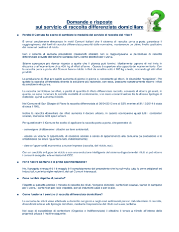 Domande e risposte sul servizio di raccolta differenziata domiciliare ■ Perché il Comune ha scelto di cambiare le modalità del servizio di raccolta dei rifiuti? È ormai ampiamente dimostrato in molti Comuni italiani che il sistema di raccolta porta a porta garantisce il raggiungimento dei livelli di raccolta differenziata prescritti dalle normative, mantenendo un ottimo livello qualitativo dei materiali destinati al riciclo. Con il sistema di raccolta precedente (cassonetti stradali) non si raggiungevano le percentuali di raccolta differenziata previste dall’Unione Europea (65%) come obiettivo per il 2012. Stiamo sprecando più risorse rispetto a quelle che il pianeta può fornirci. Mediamente ognuno di noi invia in discarica o all'inceneritore circa 400 kg di rifiuti all'anno . Questo è superiore alla capacità del nostro territorio. Con la raccolta porta a porta altri Comuni hanno ridotto i rifiuti da smaltire sotto i 100 kg a testa, riciclando gli altri rifiuti prodotti. La produzione di rifiuti pro-capite aumenta di giorno in giorno e, nonostante gli sforzi, le discariche “scoppiano”. Per questo la raccolta differenziata diventa la soluzione più razionale, con essa, possiamo concretamente ridurre i rifiuti da smaltire in discarica. La raccolta domiciliare dei rifiuti, a parità di quantità di rifiuto differenziato raccolto, consente di ridurre gli scarti, in quanto, se sono rispettare le corrette modalità di conferimento, vi è meno contaminazione tra le diverse tipologie di materiale, quindi aumenta il riciclo. Nel Comune di San Giorgio di Piano la raccolta differenziata al 30/04/2013 era al 52% mentre al 31/12/2014 è stata di circa il 79%. Inoltre la raccolta domiciliare dei rifiuti aumenta il decoro urbano, in quanto scompaiono quasi tutti i contenitori stradali, liberando molti spazi urbani. Per questi motivi il Comune ha scelto di applicare la raccolta porta a porta, che permette di: - coinvolgere direttamente i cittadini sui temi ambientali; - essere un volano di opportunità, di coesione sociale e senso di appartenenza alla comunità (la produzione e lo smaltimento dei rifiuti riguardano tutti, indistintamente); - dare un'opportunità economica a nuove imprese (raccolta, del riciclo, ecc). Con un credibile sviluppo del riciclo e con una evoluzione intelligente del sistema di gestione dei rifiuti, si può ridurre i consumi energetici e le emissioni di CO2. ■ Per il nostro Comune è la prima sperimentazione? No, il progetto che partirà il 6 maggio è il completamento del precedente che ha coinvolto tutte le zone artigianali ed industriali, con le famiglie residenti, dei sei Comuni interessati. ■ Cosa cambia rispetto al passato? Rispetto al passato cambia il metodo di raccolta dei rifiuti. Vengono eliminati i contenitori stradali, tranne le campane per il vetro, i contenitori per l’olio vegetale, per gli indumenti usati e per le pile. ■ Come funziona il servizio di raccolta differenziata domiciliare? La raccolta dei rifiuti viene effettuata a domicilio nei giorni e negli orari settimanali previsti dal calendario di raccolta, diversificati in base alla tipologia del rifiuto, mediante l’esposizione del rifiuto sul suolo pubblico. Nel caso di esposizione di contenitore (Organico e Indifferenziato) il cittadino è tenuto a ritirarlo all’interno della proprietà privata il mattino seguente. ■ Quali sono i vantaggi della raccolta porta a porta? - strade pulite e libere da cassonetti e rifiuti abbandonati; - maggiori posti per il parcheggio delle auto; - una significativa riduzione della produzione di rifiuti, quindi una riduzione di sprechi; - una netta riduzione dei rifiuti da inviare a discarica o inceneritore; - una percentuale di raccolta differenziata più alta, con conseguente aumento del rifiuto effettivamente recuperato. ■ Come mai nel servizio porta a porta non è stato compreso anche il vetro, lasciando quindi le campane verdi per questa raccolta? Il vetro è un tipo di rifiuto pericoloso da esporre sulla strada come gli altri contenitori o dentro i sacchi. Si è quindi preferito mantenere le campane verdi per questa raccolta. ■ E’ prevista una diminuzione delle tariffe della tariffa per lo smaltimento dei rifiuti solidi urbani? Nel 2014 non è previsto un aumento dei costi oltre al dovuto indice Istat. Per il 2015 sarà necessario valutare i risultati della raccolta differenziata. In generale con questa modalità di raccolta aumentano i costi di servizio ma diminuiscono quelli di smaltimento. Un'analisi su circa 2.000 Comuni del Veneto e della Lombardia ha mostrato che la raccolta porta a porta, una volta a regime, costa meno della raccolta stradale. Nel periodo di passaggio dallo stradale al porta a porta vi sono costi di avvio che, transitoriamente, possono far aumentare un poco i costi. I benefici economici si ottengono quando il sistema sarà a regime e consolidato. ■ Quali sono i rifiuti che vengono raccolti con il servizio di raccolta porta a porta? - carta e cartone di piccola dimensione - indifferenziato - plastica - organico - sfalci e potature ■ Dove si devono collocare i rifiuti? La carta va collocata nei sacchi di colore azzurro e il cartone può essere collocato di fianco. La plastica va collocata nei sacchi di colore giallo. Gli sfalci e potature vanno nei sacchi di colore verde o in piccole fascine di circa un metro di lunghezza. I rifiuti organici vanno collocati negli appositi sacchetti traspiranti in carta riciclata. Tali sacchetti vanno inseriti negli bidoncini da 30 litri o nei bidoni carrellati condominiali. Possono essere utilizzati anche i sacchetti biodegradabili e compostabili. I bidoncini vengono forniti alle abitazioni sino a 4 utenze, i bidoni carrellati alle abitazioni con più di 4 utenze. ■ E l’indifferenziato? Se eseguiremo una corretta raccolta differenziata rimarrà ben poco rifiuto indifferenziato. L’indifferenziato deve essere collocato nei soliti sacchi di colore nero o in quelli di colore ro