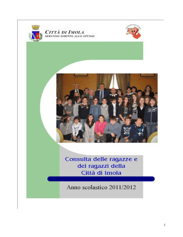 1 PRESENTAZIONE Con le elezioni avvenute nelle scuole primarie e secondarie di primo grado imolesi nei mesi di ottobre e novembre 2011 è iniziato il terzo mandato della Consulta delle ragazze e dei ragazzi della Città di Imola, istituita con deliberazione del Consiglio comunale n. 188 del 17.10.2007. I percorsi finora svolti, la collaborazione e la partecipazione attiva delle scuole nell’organizzazione delle elezioni, i dettagliati e ampi programmi “elettorali” dei candidati, l’entusiasmo delle ragazze e dei ragazzi eletti possono costituire alcuni indicatori che ci consentono di affermare che la Consulta sta perseguendo i propri obiettivi fondativi di: - contribuire in modo significativo alle funzioni di educazione dei bambini e dei ragazzi al confronto democratico e di avvicinamento alla vita ed ai percorsi amministrativi; - caratterizzarsi come espressione, proposta e progettazione partecipata su argomenti ed attività di interesse per i bambini ed i ragazzi, dando ad essi la possibilità di partecipare attivamente alla costruzione della vita futura della comunità locale; - costituire un’occasione per gli adulti e gli amministratori per meglio comprendere bisogni, interessi ed aspettative dei bambini e dei ragazzi della comunità. Le ragazze ed i ragazzi eletti - assieme alle loro famiglie - e con il contributo dei loro insegnanti e compagni, contribuiscono, infatti, ad approfondire e a ri-declinare il senso e il significato del vivere la partecipazione attiva delle giovani generazioni all’interno della comunità locale. Alla Consulta hanno aderito, i 6 Istituti Comprensivi Statali (I.C. n. 2, 3, 4, 5, 6 e 7) e la Scuola Paritaria San Giovanni Bosco, comprendenti le scuole primarie e secondarie di 1° grado presenti nel territorio imolese, che collaborano attivamente al funzionamento della “Consulta”, mettendo a disposizione personale docente con funzione di referenti di istituto e due docenti in qualità di mediatori. Le ragazze ed i ragazzi si sono insediati ufficialmente il giorno 12 dicembre 2011 nella sala del Consiglio Comunale alla presenza del Sindaco e della Giunta a cui hanno illustrato programmi e proposte avanzate nel corso della “campagna elettorale” svoltasi nelle scuole. LE ATTIVITÀ a) Programma di lavoro del presente anno scolastico b) Prosecuzione di idee e progetti elaborati dalla Consulta nei precedenti anni c) Progetti e attività finalizzate allo sviluppo della cittadinanza attiva ed alla conoscenza delle Istituzioni d) Attività di documentazione e informazione 2 a) Programma di lavoro del presente anno scolastico Il programma delle attività di questo anno scolastico è stato definito dalle ragazze e dai ragazzi sulla base dei propri programmi elettorali costituiti da diverse centinaia di proposte, utilizzando una sintesi di circa 50 progetti di lavoro approntata dal Servizio Diritto allo Studio e dai tre mediatori. Successivamente si sono costituiti i tre gruppi di lavoro di seguito riportati: Gruppo A - eletti delle classi quarte e quinte della scuola primaria - coordinato dalla mediatrice Maria Rosaria Costigliola Gruppo B – eletti delle classi quarte e quinte delle scuole primarie - coordinato dal mediatore Luciano Poli Gruppo C - eletti delle scuole secondarie di I° grado - coordinato dalla mediatrice Micaela Piazza Sintesi attività Gruppo A Il gruppo, composto da Scalegni Alessandro, Benini Elena, Manara Lisa, Buscaroli Andrea, Bedeschi Laura (Istituto Comprensivo n. 2), Guicciardi Ginevra, Nulmi Luca (Istituto Comprensivo n. 3), Micchinelli Cecilia, Bottau Stefano (Istituto Comprensivo n. 4), Sabbioni Luca (Istituto Comprensivo n. 5), ha focalizzato l’attenzione sulle seguenti aree di attività: • Riqualificare gli spazi esterni alla scuola “Carducci” • Organizzare iniziative, con il coinvolgimento delle scuole, per gli anziani presenti nelle case di riposo o nell’ospedale • Organizzare attività in collaborazione con il canile e il gattile del Comune di Imola • Un “tappo per la vista”: raccogliere i tappi di plastica per finanziare l’acquisto di cani per ciechi Il lavoro sulla riqualificazione degli spazi esterni alla scuola “Carducci” ha visto l’intervento tecnico e la collaborazione della Dott.ssa Catia Nanni dell’Ufficio Verde del Comune di Imola, che ha guidato i ragazzi in una progettazione consapevole all’uso degli spazi del giardino, nonché alla conoscenza delle piante che circondano tale area. I ragazzi hanno elaborato dei “progetti”, lavorando sulla planimetria e sull’organizzazione degli spazi, individuando: - zone d’ombra; - aree per la sistemazione di tavoli-panca, per favorire il momento della ricreazione all’aperto soprattutto nelle giornate calde; - postazioni per mettere i cestini dei rifiuti e una fontana 3 - uno spazio verde per favorire le attività didattiche all’aperto: es. orto scolastico - uno spazio che consenta il gioco libero - una zona dove curare l’aspetto estetico con aiuole fiorite, cespugli, etc.. La realizzazione finale del progetto sarà correlata alla disponibilità economica e finanziaria del Comune di Imola. Per quanto riguarda la realizzazione di iniziative a favore degli anziani presenti in strutture sociosanitarie di Imola, l’attività del gruppo si è concretizzata nella organizzazione, nel mese di maggio, di una visita dei ragazzi della Consulta presso l’RSA di Imola, struttura residenziale che accoglie anziani non autosufficienti che necessitano di un'assidua assistenza socio-sanitaria. Scopo della visita è stato quello di portare un po’ di conforto e svago ai degenti attraverso la lettura di testi ameni e divertenti. Visto l’esito molto positivo dell’iniziativa, i ragazzi della Consulta intendono dare continuità con anche maggiore frequenza e assiduità a quest’attività a partire da settembre. Per quanto riguarda le attività in collaborazione con il canile di Imola, i ragazzi hanno avanzato la richiesta di interventi da pa