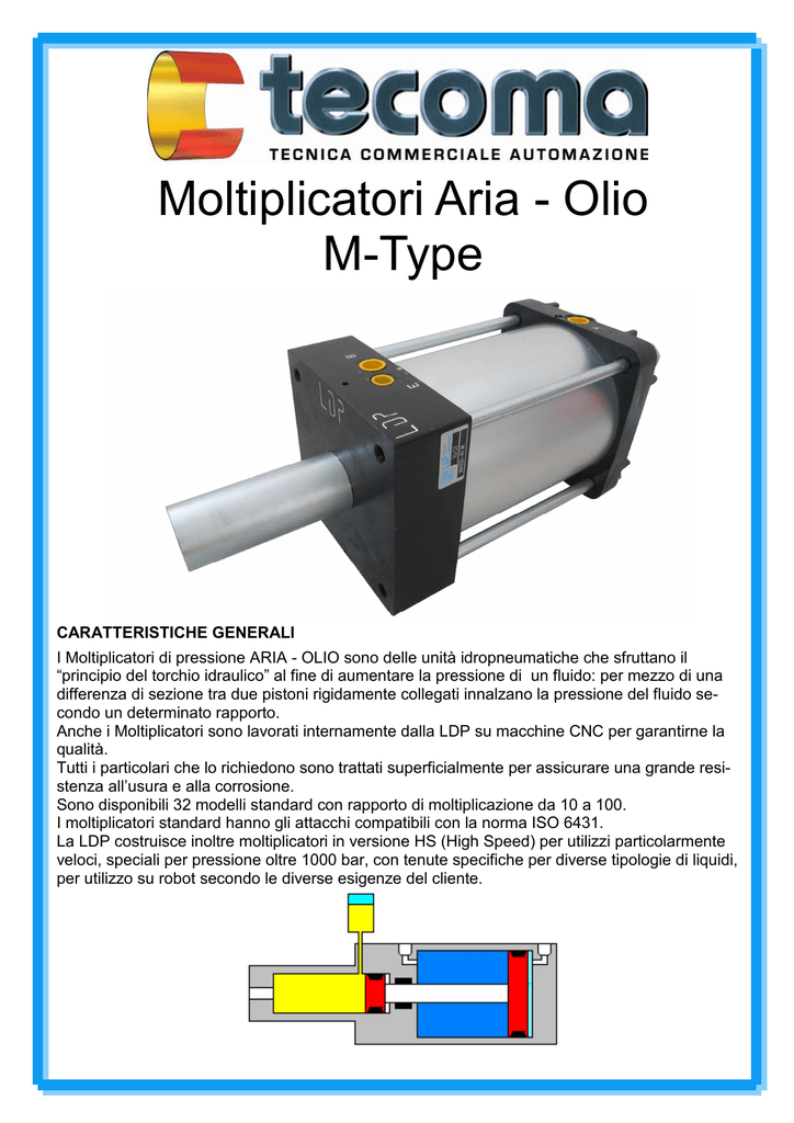 Moltiplicatori Aria - Olio M-Type CARATTERISTICHE GENERALI I Moltiplicatori di pressione ARIA - OLIO sono delle unità idropneumatiche che sfruttano il “principio del torchio idraulico” al fine di aumentare la pressione di un fluido: per mezzo di una differenza di sezione tra due pistoni rigidamente collegati innalzano la pressione del fluido secondo un determinato rapporto. Anche i Moltiplicatori sono lavorati internamente dalla LDP su macchine CNC per garantirne la qualità. Tutti i particolari che lo richiedono sono trattati superficialmente per assicurare una grande resistenza all’usura e alla corrosione. Sono disponibili 32 modelli standard con rapporto di moltiplicazione da 10 a 100. I moltiplicatori standard hanno gli attacchi compatibili con la norma ISO 6431. La LDP costruisce inoltre moltiplicatori in versione HS (High Speed) per utilizzi particolarmente veloci, speciali per pressione oltre 1000 bar, con tenute specifiche per diverse tipologie di liquidi, per utilizzo su robot secondo le diverse esigenze del cliente. Moltiplicatore Speciale MODELLO MODELLI E CARATTERISTICHE RAPPORTO P a 6 bar MOLTIPLICAZ. VOLUME (cc) RAPPORTO MOLTIPLICAZ. 61 366 30.1 P a 6 bar VOLUME (cc) MP 61 - 30 MODELLO MP 39 - 47 39 234 47.1 MD 62 - 07 62 370 7.5 MP 25 - 73 25 150 73 MD 27 - 16 27 160 16.9 MP 17 - 105 17 102 105 MD 15 - 30 15 90 30.1 MP 12 - 144 12 75 144 MD 09 - 47 9 55 47.1 MW 100 - 30 100 600 30.1 MJ 64 - 11 64 380 11.7 MW 64 - 47 64 380 47.1 MJ 32 - 23 32 190 23 MW 41 - 73 41 240 73 MJ 25 - 30 25 150 30.1 MW 28 - 106 28 170 106 MJ 16 - 47 16 90 74.1 MW 21 - 144 21 125 144 MJ 10 - 73 10 60 73 MW 16 - 188 16 96 188 MX 69 - 16 69 410 16.9 MH 100 - 47 100 600 47.1 MX 51 - 23 51 300 23 MH 64 - 73 64 380 73 MX 39 - 30 39 230 30.1 MH 44 - 106 44 260 106 MX 25 - 47 25 150 47.1 MH 32 - 144 32 190 144 MX 16 - 73 16 90 73 MH 25 - 188 25 150 188 MX 11 - 106 11 60 106 MH 16 - 294 16 96 294 PROGRAMMA DI PRODUZIONE: - Moltiplicatori di Pressione, Cilindri aria-olio - Teste di Pressa E-Type, Cs-Type, KS-type & Speciali - Sistemi di clinciatura - Presse Pneumatiche, Presse Idropneumatiche a collo di cigno & a colonne LDP thrust technology DISTRIBUITO DA: SEDE LEGALE – AMM.: Via Puccini, 13 -I- 20085 Locate T. (MILANO) Italia Tel 0039 - 02 90731137 Fax 0039 - 02 90730659 SEDE OPERATIVA: Via Del Lavoro, 8 -I- 24050 Bariano (BERGAMO) Italia Tel 0039 - 0363 95096 Fax 0039 – 0363 959210 http://www.ldpitalia.com E-mail: [email protected] Essendo i prodotti in continua evoluzione, la Società si riserva il diritto di modificare le caratteristiche, siano esse tecniche o dimensionali od estetiche, in qualsiasi momento e senza alcun preavviso.