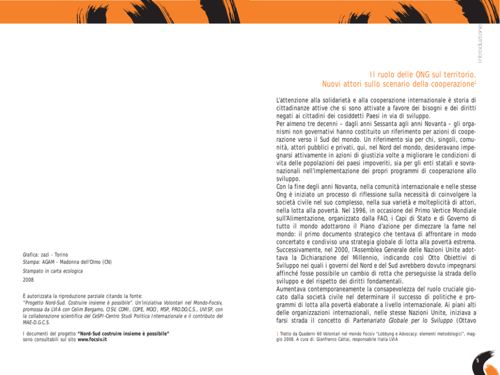 introduzione Il ruolo delle ONG sul territorio. Nuovi attori sullo scenario della cooperazione1 È autorizzata la riproduzione parziale citando la fonte: “Progetto Nord-Sud. Costruire insieme è possibile”. Un’iniziativa Volontari nel Mondo-Focsiv, promossa da LVIA con Celim Bergamo, CISV, COMI, COPE, MOCI, MSP, PRO.DO.C.S., UVISP, con la collaborazione scientifica del CeSPI-Centro Studi Politica Internazionale e il contributo del MAE-D.G.C.S. L’attenzione alla solidarietà e alla cooperazione internazionale è storia di cittadinanze attive che si sono attivate a favore dei bisogni e dei diritti negati ai cittadini dei cosiddetti Paesi in via di sviluppo. Per almeno tre decenni – dagli anni Sessanta agli anni Novanta – gli organismi non governativi hanno costituito un riferimento per azioni di cooperazione verso il Sud del mondo. Un riferimento sia per chi, singoli, comunità, attori pubblici e privati, qui, nel Nord del mondo, desideravano impegnarsi attivamente in azioni di giustizia volte a migliorare le condizioni di vita delle popolazioni dei paesi impoveriti, sia per gli enti statali e sovranazionali nell’implementazione dei propri programmi di cooperazione allo sviluppo. Con la fine degli anni Novanta, nella comunità internazionale e nelle stesse Ong è iniziato un processo di riflessione sulla necessità di coinvolgere la società civile nel suo complesso, nella sua varietà e molteplicità di attori, nella lotta alla povertà. Nel 1996, in occasione del Primo Vertice Mondiale sull’Alimentazione, organizzato dalla FAO, i Capi di Stato e di Governo di tutto il mondo adottarono il Piano d’azione per dimezzare la fame nel mondo: il primo documento strategico che tentava di affrontare in modo concertato e condiviso una strategia globale di lotta alla povertà estrema. Successivamente, nel 2000, l’Assemblea Generale delle Nazioni Unite adottava la Dichiarazione del Millennio, indicando così Otto Obiettivi di Sviluppo nei quali i governi del Nord e del Sud avrebbero dovuto impegnarsi affinché fosse possibile un cambio di rotta che perseguisse la strada dello sviluppo e del rispetto dei diritti fondamentali. Aumentava contemporaneamente la consapevolezza del ruolo cruciale giocato dalla società civile nel determinare il successo di politiche e programmi di lotta alla povertà elaborate a livello internazionale. Ai piani alti delle organizzazioni internazionali, nelle stesse Nazioni Unite, iniziava a farsi strada il concetto di Partenariato Globale per lo Sviluppo (Ottavo I documenti del progetto “Nord-Sud costruire insieme è possibile” sono consultabili sul sito www.focsiv.it 1 Tratto da Quaderni 60 Volontari nel mondo Focsiv “Lobbyng e Advocacy: elementi metodologici”, maggio 2008. A cura di: Gianfranco Cattai, responsabile Italia LVIA Grafica: zazì - Torino Stampa: AGAM - Madonna dell’Olmo (CN) Stampato in carta ecologica 2008 5 introduzione Obiettivo di Sviluppo del Millennio): un appello ai Governi, alle Istituzioni e alle Società civili del Nord e del Sud del mondo ad imboccare un cammino, un lavoro comune nella costruzione di un mondo più equo. In questo contesto, gli organismi non governativi hanno condiviso la consapevolezza e la convinzione che l’interdipendenza crescente tra paesi, comunità e persone nel mondo, porta con sé la possibilità del cittadino ampiamente inteso – come singolo e come collettività, tanto nella dimensione privata quanto in quella pubblica - di farsi attore di processi lontani, ma soltanto apparentemente, dalla propria realtà. Comporta cioè la possibilità di ampliare il nostro diritto/dovere di cittadinanza nell’ambito di una società che da locale è diventata globale: abbiamo oggi la possibilità, il dovere e il diritto di essere cittadini del mondo. Gli organismi non governativi hanno scelto di farsi “portatori di interessi”. Gli interessi di coloro che stanno al di sotto dei processi di globalizzazione che, lungi dal subirne passivamente le dinamiche, ne restano tuttavia schiacciati: queste sono le realtà che potremmo genericamente indicare come i Sud del mondo. E nello stesso tempo, così agendo, le Ong si propongono di sostenere gli interessi di quelle realtà definite come i Nord del mondo: coloro che della globalizzazione stanno al di sopra, che ne manovrano, più o meno consapevolmente, i meccanismi. Portatori di interessi, quindi, che accompagnano i Sud nell’impegno verso i diritti di una vita dignitosa, e che accompagnano i Nord non solo verso la costruzione di una società più sicura - perché la sicurezza è indissolubilmente connessa alla giustizia che caratterizza un mondo più equo – ma anche verso una diffusione della cultura della cooperazione. In quanto portatori di interesse impegnati nella costruzione di una società più giusta e sicura, gli organismi non governativi hanno una missione specifica, implementata attraverso tre settori di attività: • Educazione allo sviluppo e alla cooperazione sul territorio, in quanto l’informazione e la comprensione dei fenomeni complessi della globalizzazione è competenza necessaria per esercitare il diritto/dovere di cittadinanza attiva e agire su quei processi che interessano ogni cittadino, al Nord come al Sud, non solo in campo economico, ma nella vita quotidiana, nella cultura, nella tecnologia, nella politica e nella governance. • Interventi di sviluppo in partenariato con soggetti diversi nei Paesi del Sud, per sostenere gli sforzi delle comunità, delle organizzazioni e delle istituzioni locali tesi a identificare e realizzare i programmi di intervento, per favorire e rafforzare percorsi di cambiamento sociale, dinamiche di sviluppo sostenibile, di inclusione sociale e di lotta contro la povertà. 6 introduzione • Facilitazione di rapporti tra Nord e Sud e viceversa, fungendo da ponte tra le comunità, grazie al fatto di avere radici sia nei Nord che nei Sud. Gli organismi non governativi nascono nei Nord e vogliono essere