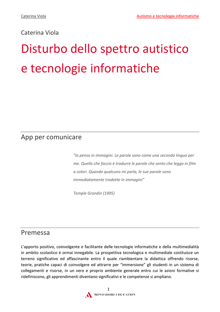 Caterina Viola Autismo e tecnologie informatiche Caterina Viola Disturbo dello spettro autistico e tecnologie informatiche App per comunicare “Io penso in immagini. Le parole sono come una seconda lingua per me. Quello che faccio è tradurre le parole che sento che leggo in film a colori. Quando qualcuno mi parla, le sue parole sono immediatamente tradotte in immagini” Temple Grandin (1995) Premessa L’apporto positivo, coinvolgente e facilitante delle tecnologie informatiche e della multimedialità in ambito scolastico è ormai innegabile. La prospettiva tecnologica e multimediale costituisce un terreno significativo ed affascinante entro il quale riambientare la didattica offrendo risorse, teorie, pratiche capaci di coinvolgere ed attrarre per “immersione” gli studenti in un sistema di collegamenti e risorse, in un vero e proprio ambiente generale entro cui le azioni formative si ridefiniscono, gli apprendimenti diventano significativi e le competenze si ampliano. 1 Caterina Viola Autismo e tecnologie informatiche Le tecnologie e i media diventano “non veicoli, ma ambienti del sapere, del saper fare, dell’essere e del sentire” (Maragliano R., Nuovo manuale di didattica multimediale, Laterza, 1998). L’utilizzo delle tecnologie riesce a motivare ed interessare i ragazzi, facilitandone i processi di attenzione e concentrazione, fornendo feedback costanti e stabili, rafforzandone l’autonomia e l’autostima. Le nuove tecnologie sono, inoltre, da tempo all’attenzione del mondo medico, oltre che educativo, per la valenza facilitante che possono avere nella progettazione di programmi abilitativi personalizzati/individualizzati. In particolare, è dimostrata l’utilità per i ragazzi con disturbi dello spettro autistico, in quanto le tecnologie informatiche, adeguatamente impiegate, riescono a costituire un supporto valido nei percorsi di intervento e di trattamento finalizzati al superamento dei deficit comunicativi e relazionali che notoriamente connotano tali disturbi per potenziarne l’apprendimento, la comunicazione e la socializzazione. L’uso delle tecnologie informatiche permette di usare un canale comunicativo prevalentemente visuo-‐spaziale, particolarmente adatto alle caratteristiche dei ragazzi con disturbi dello spettro autistico. Inoltre, il linguaggio informatico, in quanto chiaro, strutturato e prevedibile, ha il grande pregio di non comportare inferenze emotive o sottintesi, incomprensibili per una persona con autismo a causa della teoria della mente deficitaria, dei deficit di coerenza centrale e delle funzioni esecutive. Naturalmente l’uso delle tecnologie informatiche richiedono consapevole progettazione, personalizzazione/individualizzazione adeguata ai bisogni specifici, alle caratteristiche e alle preferenze di ogni soggetto, condivisione in rete e costante monitoraggio e supporto della figura adulta. Si tratta di uno strumento e non di un “toccasana“ di per sé risolutivo di ogni problema, perché serio potrebbe essere il rischio che si possano determinare nuove stereotipie, rigidità e forme di isolamento. Perciò va dedicata la massima attenzione alla modalità di utilizzo degli strumenti informatici, che deve essere sempre integrata entro un progetto didattico che preveda la presenza dell’adulto entro piccoli gruppi cooperativi, in modo da evitare l’isolamento sociale dovuto ad attività che possono aggravare, anche per il loro carattere gratificante, le stereotipie comportamentali. Le tecnologie informatiche, utilizzate con accortezza, hanno per persone con disturbi dello spettro autistico ricadute positive in più ambiti: nell’apprendimento scolastico, nella comunicazione aumentativa e alternativa (CAA), come supporto nella scelta delle attività abilitative e nell’insegnamento di abilità personali e sociali. 2 Caterina Viola Autismo e tecnologie informatiche Tabella riassuntiva Tratta da: A. Monica, Utilizzo delle tecnologie informatiche, Università di Parma. http://www.istruzioneparma.it/parma/wp-‐content/uploads/2012/02/Pres_Monica.pdf 3 Caterina Viola Autismo e tecnologie informatiche Rassegna delle app che facilitano la comunicazione Immaginario: comunicare per immagini https://www.fingertalks.it/immaginario Immaginario è un’interessante app per comunicare in modo efficace e semplice con i ragazzi con disturbi dello spettro autistico. Ha vinto il Premio “La miglior App per pazienti” all’AboutPharma Digital Awards nel 2013, prima edizione. In particolare, è stata premiata per "la capacità di Finger Talks di realizzare il progetto unendo le competenze specialistiche a quelle tecnologiche in una sinergia di esperienze, che ha permesso di realizzare un’app completa, efficace, familiare ai bimbi autistici e pratica da usare per chi li cresce, esaltando le caratteristiche di personalizzazione e portabilità del mezzo mobile". Immaginario offre ad insegnanti, genitori ed operatori uno strumento di facile utilizzo ed efficace per la comunicazione: carte virtuali colorate ricche di immagini che rappresentano parole e azioni per favorire un dialogo con i bambini con disturbi intellettivi o con autismo. Grazie ad Immaginario, si può superare, con l’uso di immagini a supporto dei codici verbali, una delle difficoltà più serie dell’autismo: la difficile comprensione dei concetti. Immaginario trasforma il tablet in un vero e proprio contenitore di immagini associate a concetti, carte virtuali facilmente reperibili da mostrare al bambino, e da utilizzare per la costruzione di frasi e di agende personalizzate, da gestire in modo efficace e veloce al momento opportuno. Obiettivi: • • • • • Migliorare la vita dei ragazzi con autismo e degli adulti che si prendono cura di loro attraverso l’uso facilitato ed efficace delle immagini attraverso le nuove tecnologie. Offrire una soluzione innovativa ed efficace per l’inclusione Innalzare la qualità della vita Facilitare la gestione quotidiana della comunic