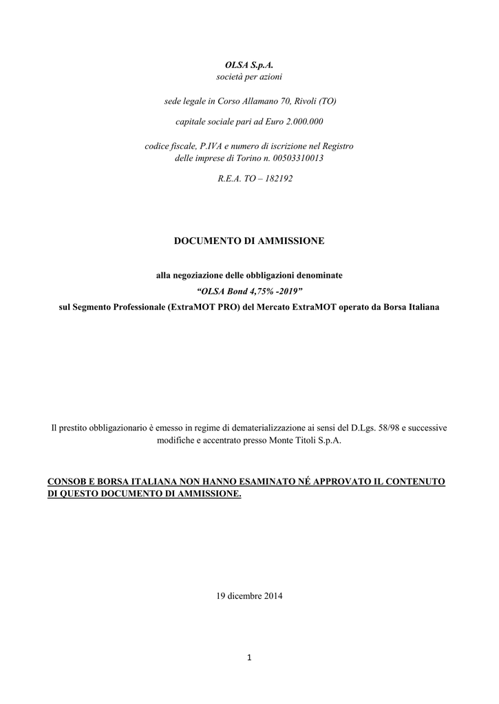 OLSA S.p.A. società per azioni sede legale in Corso Allamano 70, Rivoli (TO) capitale sociale pari ad Euro 2.000.000 codice fiscale, P.IVA e numero di iscrizione nel Registro delle imprese di Torino n. 00503310013 R.E.A. TO – 182192 DOCUMENTO DI AMMISSIONE alla negoziazione delle obbligazioni denominate “OLSA Bond 4,75% -2019” sul Segmento Professionale (ExtraMOT PRO) del Mercato ExtraMOT operato da Borsa Italiana Il prestito obbligazionario è emesso in regime di dematerializzazione ai sensi del D.Lgs. 58/98 e successive modifiche e accentrato presso Monte Titoli S.p.A. CONSOB E BORSA ITALIANA NON HANNO ESAMINATO NÉ APPROVATO IL CONTENUTO DI QUESTO DOCUMENTO DI AMMISSIONE. 19 dicembre 2014 1 INFORMAZIONI IMPORTANTI Il presente documento di ammissione (il “Documento di Ammissione”) contiene informazioni importanti e deve essere letto con particolare attenzione nella sua interezza, unitamente ai documenti allegati. Il presente Documento di Ammissione è messo a disposizione presso la sede legale della società emittente OLSA S.p.A. (di seguito, l’“Emittente” o ”Società” ), Corso Allamano 70, 10098 –Rivoli (TO) e sul sito internet dell’Emittente all’indirizzo www.olsagroup.com. Il presente Documento di Ammissione si riferisce ed è stato predisposto esclusivamente in relazione all’ammissione alle negoziazioni delle obbligazioni “OLSA Bond 4,75% - 2019” (Codice ISIN IT0005072712 ) di seguito, le “Obbligazioni”) sul segmento professionale del sistema multilaterale di negoziazione ExtraMOT (di seguito “ExtraMOT PRO”), organizzato e gestito da Borsa Italiana S.p.A. (di seguito, “Borsa Italiana”). Il presente documento è stato pertanto redatto in conformità al regolamento del mercato ExtraMOT (di seguito, il “Regolamento ExtraMOT”) e non costituisce un prospetto ai sensi del D.Lgs. 24 febbraio 1998, n. 58, e del Regolamento Consob 14 maggio 1999, n. 11971, entrambi come successivamente modificati e integrati (di seguito, rispettivamente, il “TUF” e il “Regolamento 11971”). Le Obbligazioni non sono negoziate in alcun mercato regolamentato o non regolamentato italiano o estero e la Società non ha presentato domanda di ammissione alle negoziazioni delle Obbligazioni in altri mercati italiani o esteri (fatta eccezione per il segmento professionale (ExtraMOT PRO) del sistema multilaterale di negoziazione ExtraMOT organizzato e gestito da Borsa Italiana). Né il presente Documento di Ammissione, né l’operazione ivi descritta costituisce, o può essere intesa come, un’offerta al pubblico di strumenti finanziari né un’ammissione alle negoziazioni di strumenti finanziari in un mercato regolamentato così come definiti nel TUF e nel Regolamento 11971. Non si rende pertanto necessaria la redazione di un prospetto secondo gli schemi previsti dal Regolamento 809/2004/CE della Commissione del 29 aprile 2004 recante modalità di esecuzione della Direttiva Prospetti (come di seguito definita), come successivamente modificato e integrato (il “Regolamento 809”). La pubblicazione del presente documento non deve essere, e non è stata, autorizzata dalla Commissione Nazionale per le Società e la Borsa (di seguito, “Consob”) ai sensi della Direttiva 2003/71/CE del Parlamento europeo e del Consiglio relativa al prospetto da pubblicare per l’offerta o l’ammissione alla negoziazione di strumenti finanziari, come successivamente modificata e integrata (di seguito, la “Direttiva Prospetti”) o di qualsiasi altra norma o regolamento in materia (ivi inclusi gli articoli 94 e ss. e 113 e ss. del TUF). Consob e Borsa Italiana non hanno esaminato né approvato il contenuto di questo Documento di Ammissione. La lingua italiana è la lingua utilizzata dall’Emittente ai fini del presente Documento di Ammissione, nonché la lingua che sarà da questi utilizzata per tutti i documenti e informazioni messi e/o da mettere a disposizione degli investitori e per qualsiasi altro documento e informazione previsti dalla normativa, anche secondaria, applicabile e dal regolamento del prestito obbligazionario rappresentato dalle Obbligazioni (il “Prestito Obbligazionario”). Le Obbligazioni non sono state, né saranno registrate ai sensi dello United States Securities Act del 1993, come modificato ed integrato, né ai sensi delle corrispondenti o analoghe normative in vigore in qualsiasi altro paese nel quale la vendita, il trasferimento o comunque la consegna delle Obbligazioni, direttamente o indirettamente, non siano consentiti in assenza di specifiche esenzioni o autorizzazioni da parte delle competenti autorità (di seguito, collettivamente, gli “Altri Paesi”) e non potranno conseguentemente essere offerte, vendute o comunque consegnate, direttamente o indirettamente, negli Stati Uniti d'America, negli Altri Paesi o a soggetti che siano o agiscano per conto o a beneficio di United States Persons o a cui non 2 possano essere vendute, trasferite o consegnate ai sensi della normativa applicabile. La pubblicazione e la distribuzione del presente documento in altre giurisdizioni e la vendita, il trasferimento o comunque la consegna delle Obbligazioni (diretta e/o indiretta), potrebbero essere soggette a restrizioni di legge o regolamentari e pertanto gli investitori sono tenuti ad informarsi sulla normativa applicabile in materia nei rispettivi paesi di residenza e ad osservare tali restrizioni. La violazione di tali restrizioni potrebbe costituire una violazione della normativa applicabile in materia di strumenti finanziari nella giurisdizione di competenza. *** 3 INDICE 1. DEFINIZIONI 5 2. PERSONE RESPONSABILI E CONFLITTI DI INTERESSE 6 3. FATTORI DI RISCHIO 6 4. INFORMAZIONI RELATIVE ALL’EMITTENTE 19 5. STRUTTURA ORGANIZZATIVA 25 6. PRINCIPALI SOCI 30 7. INFORMAZIONI FINANZIARIE RIGUARDANTI LE ATTIVITA’ E LE PASSIVITA’, LA SITUAZIONE FINANZIARIA E I PROFITTI E LE PERDITE DELL’EMITTENTE 31 8. INFORMAZIONI RELATIVE ALLE OBBLIGAZIONI 31 9. 