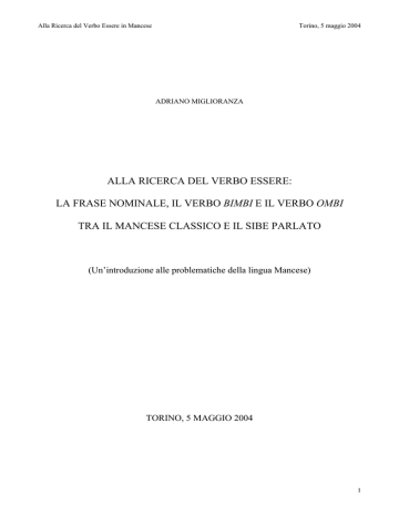 Alla Ricerca del Verbo Essere in Mancese Torino, 5 maggio 2004 ADRIANO MIGLIORANZA ALLA RICERCA DEL VERBO ESSERE: LA FRASE NOMINALE, IL VERBO BIMBI E IL VERBO OMBI TRA IL MANCESE CLASSICO E IL SIBE PARLATO (Un’introduzione alle problematiche della lingua Mancese) TORINO, 5 MAGGIO 2004 1 Alla Ricerca del Verbo Essere in Mancese Torino, 5 maggio 2004 0. PREMESSA: ACCENNI STORICI DELLE LINGUE MANCESE E SIBE. Prima di tutto un breve accenno su cosa intendo per: “tra Mancese Classico e Sibe Parlato”. Il Mancese Classico (Qīngwén, 清文) è soprattutto la lingua canonica per i memoriali imperiali durante il regno della dinastia cinese Qīng 清朝 Daicing gurun (1644-1911), e comprende pure la lingua Mancese Parlata (Mǎnwén, 滿文) che costituiva la lingua di corte, delle classi alte e della letteratura in generale. Ultimamente si è prestata una certa attenzione allo studio sul Mancese di Pechino (Mǎnyǔ de jīngyǔ, 滿語的京語) parlato dalle truppe e dai funzionari mancesi nella capitale, si presuppone che questo ‘dialetto’ sia il vero Mancese in quanto parlato dal popolo in condizioni reali. Per quanto riguarda l’origine è abbastanza fondata l’ipotesi che per Mancese si intenda una rinomina della lingua Jurchen (女真 Nǚzhēn) parlata nella regione dell’odierno Liáoníng 遼 寧 (a Nord-est di Pechino) al momento della conquista dell’Impero Cinese da parte di Mancesi. Tutte queste ‘lingue’ sono praticamente scomparse. Oggi in qualche remoto angolo della regione cinese dello Hēilóngjiāng 黑龍江 (Manciuria del Nord) qualcuno parla ancora il Mancese Parlato Moderno (Mǎnyǔ, 滿語), ma la sua scomparsa sembra inevitabile. Infatti tale lingua è classificata come ‘Nearly Extinct’ nelle “Endangered Languages” nel rapporto compilato da Juha Janhunen per l’UNESCO. La storia del popolo Sibe e della sua lingua è piuttosto lunga e ancora non del tutto chiara soprattutto per quanto riguarda le origini. Diciamo brevemente che al momento della presa di potere in Manciuria da parte di Nurhaci 努爾哈齊 (fine 1500 inizio 1600) sbagliarono le alleanze e finirono come sudditi di popolazioni più potenti e accorte politicamente di schiatta mongola. Comunque sia andata, ad un certo punto tale popolazione fu riconosciuta durante un’udienza presenziata dallo stesso imperatore Kāngxī 康熙 (Elhe Taifin 1662-1722) come affine ai Mancesi e venne annessa sotto l’ala protettrice delle Bandiere Mancesi – sorta di organizzazione civile e militare. Da questo punto in poi i Sibe vissero le vicissitudini dei cugini mancesi, ma durante l’era Qiánlóng 乾隆 (Abkai Wehiyehe 1736-1795) una parte di loro fu mandata in una remota regione del Xīnjiāng 新疆 a difendere le frontiere con l’impero zarista (1764). Qui, in completo isolamento e con la condanna della pena capitale se fossero tornati in Manciuria, vissero preservando il Mancese e la loro lingua d’origine. Inutile dire che conservarono anche usi e costumi completamente scomparsi altrove e che l’interesse allo studio della loro lingua è soprattutto a carattere antropologico e filologico. Il Sibe, dopo lunghe discussioni se era lingua, dialetto o volgarizzazione del Mancese, si può ora dividere in Sibe Letterario (Xībówén, 錫伯文) che è praticamente Mancese Letterario (Mǎnwén, 滿文) meno aulico e pomposo e dove le differenze grammaticali con la lingua di riferimento sono quasi nulle. La parte più innovativa resta il lessico, di fatto mutato col tempo. Il Sibe Parlato (Xībóyǔ Kǒuyǔ, 錫伯語口語) è a tutti gli effetti la lingua di questa popolazione. Sebbene abbia subito in passato una forte influenza del Mancese ha conservato non di meno le sue caratteristiche iniziali. Purtroppo adesso sembra essere minacciato dall’Uiguro grammaticalmente e soprattutto dal Cinese lessicalmente. Le forme originali/originarie che caratterizzavano questa lingua in passato non venivano espresse in Sibe Letterario, ma ultimamente non solo il lessico Sibe si sta differenziando dal Mancese, ma anche fanno capolino qua e là forme grammaticali propriamente autoctone. Ovviamente in questa trattazione ci interessa soprattutto il Sibe Parlato perché maggiormente si differenzia dal Mancese. 2 Alla Ricerca del Verbo Essere in Mancese Torino, 5 maggio 2004 Le lingue qui sopra descritte sono (a parte l’Uiguro e il Cinese) del ramo Manciù-tunguso o Tunguso Meridionale della famiglia delle Lingue Tunguse che fanno parte dell’ampio e controverso Raggruppamento Altaico (di cui fanno parte pure le ampie famiglie del Turco e del Mongolo principalmente). 1. LA FRASE NOMINALE La lingua Mancese è una lingua “fortemente verbale”, ovvero è una lingua in cui il verbo ricopre una fondamentale importanza: la radice verbale porta affissi e suffissi vari e può ricorre serialmente. Ma esiste un tipo di frase che chiameremo “minima” in cui il verbo può essere omesso e al suo posto appaiono particelle tematiche e/o/con particelle finali caratteristiche di tale costruzione. Le costruzioni della Frase Nominale Mancesi più tipiche possono essere: A serengge B (inu); A seci B; A oci B (inu, kai), etc. Dove A e B sono due elementi nominali o nominalizzati; “serengge, seci, oci” potremmo definirle Particelle Tematiche (Topic); mentre “inu, kai” e altre meno usate sono a tutti gli effetti Particelle Finali (Pfin). “Serengge” e “seci” sono forme cristallizzate del verbo Sembi (dire). “Oci” detta a volte “posposizione” viene dal verbo Ombi (divenire, essere). “ inu” è un qualcosa di più complesso: 1) chiude costruzioni nominali; 2) usata avverbialmente vuol dire “anche” e in questo caso si pone dopo il soggetto; 3) crea domande e risposte del tipo sì/no. In realtà il suo significato primario sembra essere quello di “vero”, si tratterebbe perciò di un aggettivo. Il Sibe parlato fa una costruzione più agile: la semplice giustapposizione dei due elementi nominali opp