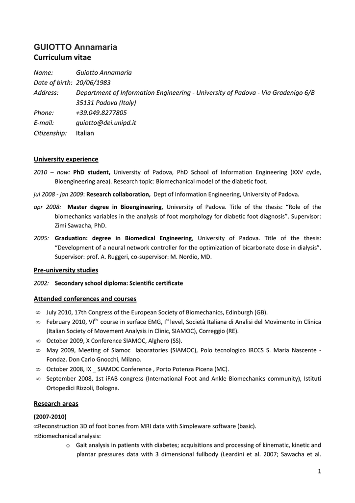 GUIOTTO Annamaria Curriculum vitae Name: Guiotto Annamaria Date of birth: 20/06/1983 Address: Department of Information Engineering - University of Padova - Via Gradenigo 6/B 35131 Padova (Italy) Phone: +39.049.8277805 E-mail: [email protected] Citizenship: Italian University experience 2010 – now: PhD student, University of Padova, PhD School of Information Engineering (XXV cycle, Bioengineering area). Research topic: Biomechanical model of the diabetic foot. jul 2008 - jan 2009: Research collaboration, Dept of Information Engineering, University of Padova. apr 2008: Master degree in Bioengineering, University of Padova. Title of the thesis: “Role of the biomechanics variables in the analysis of foot morphology for diabetic foot diagnosis”. Supervisor: Zimi Sawacha, PhD. 2005: Graduation: degree in Biomedical Engineering, University of Padova. Title of the thesis: “Development of a neural network controller for the optimization of bicarbonate dose in dialysis”. Supervisor: prof. A. Ruggeri, co-supervisor: M. Nordio, MD. Pre-university studies 2002: Secondary school diploma: Scientific certificate Attended conferences and courses • • • • • • July 2010, 17th Congress of the European Society of Biomechanics, Edinburgh (GB). February 2010, VIth course in surface EMG, Ist level, Società Italiana di Analisi del Movimento in Clinica (Italian Society of Movement Analysis in Clinic, SIAMOC), Correggio (RE). October 2009, X Conference SIAMOC, Alghero (SS). May 2009, Meeting of Siamoc laboratories (SIAMOC), Polo tecnologico IRCCS S. Maria Nascente Fondaz. Don Carlo Gnocchi, Milano. October 2008, IX _ SIAMOC Conference , Porto Potenza Picena (MC). September 2008, 1st iFAB congress (International Foot and Ankle Biomechanics community), Istituti Ortopedici Rizzoli, Bologna. Research areas (2007-2010) • Reconstruction 3D of foot bones from MRI data with Simpleware software (basic). • Biomechanical analysis: o Gait analysis in patients with diabetes; acquisitions and processing of kinematic, kinetic and plantar pressures data with 3 dimensional fullbody (Leardini et al. 2007; Sawacha et al. 1 2009) and foot protocols (Sawacha et al. 2009) in order to assess diabetic foot impairments. Comparison with the data of healthy subjects and assessment of the effect of diabetic neuropathy and vasculopathy on the biomechanics of the diabetic foot. Analysis of the relationship between foot morphology and diabetes. o Gait and postural analysis in patients with Ankylosing Spondylitis; assesement of kinematics, kinetics, and balance in Ankylosing Spondylitis patients. . Gait and postural analysis in post-stroke patients; acquisitions and processing of kinematic, kinetic and plantar pressures data in order to evaluate post-rehabilitation improvements. o COP signal processing: evaluation of time-domain parameters (ellipses, sway area, sway path, velocity), frequency domain parameters, stochastic analysis. (2005) • Development of a neural network controller in Matlab. Processing of blood concentration data of substances related to bicarbonate concentration. • Application of the neural network to hemodialysis patients. Awards - Degree award SIAMOC 2009 (Italian Society of Clinical Movement Analysis, best Italian Master Thesis in Movement Analysis). - BTS-Bioengineering/SIMFER Award 2010 with the abstract “ABNORMAL ACTIVATION OF KNEE AND ANKLE FLEXORS-EXTENSORS IS RELATED TO ALTERED GAIT IN ANKYLOSING SPONDILYTIS?”, authors E. Carraro , Z. Sawacha , S. Del Din, F. Spolaor, A. Guiotto , A. R. Gravina, R. Guglielmin, C. Cobelli, S. Masiero. Presented by S.Del Din at the Congress ESPRM 2010. Thesis co-supervision: 2008-2009 Two thesis in Motor science, Master degree. 2009-2010 One Master thesis in Bioengineering. PERSONAL SKILLS Languages: Italian (native), English (good), Spanish (good), French (basic). Computer skills: SO: Windows, Unix (basic). Programming language: Matlab (good), Latex (fair), Java (basic), Assembler Mips (basic), Sql (basic), Html (basic). Software: Office Pakage (good), Saam II (basic), FrontPage (basic), Share Point Designer (basic), Winstodec (basic), Spk (basic), SPSS (basic). Movement analysis laboratory: Software: eMotion SMART Capture – Tracker – Analyzer (good), WINPOD Imagortesi (good), Simpleware-Scan IP software (good), COMSOL Femlab software (basic). Instruments: Smart Optoelectronic System (stereophotogrammetric system); Bertec Force Plates; Winpod pressure system; Pocket e Free EMG BTS (surface electromyographic systems). Pubblications Journal (regular paper): 1. Sawacha Z., Guarneri G., Cristoferi G., Guiotto A., Avogaro A., Cobelli C., (2009) Diabetic gait and posture abnormalities: A biomechanical investigation through three dimensional gait analysis, Clin. Biomech., Nov 2009, Volume 24 – Issue 9, pag. 722-728. 2 2. Del Din S., Carraro E., Sawacha Z., Guiotto A., Bonaldo L., Masiero S., Cobelli C., (2011) Impaired gait in ankylosing spondylitis. Medical & Biological Engineering & Computing. 2011 Jul;49(7):801-9. Online publication date: 1/13/11 3. Sawacha Z., Guarneri G., Cristoferi G., Guiotto A., Avogaro A., Cobelli A., Integrated kinematics-kinetics-plantar pressure data analysis: a useful tool for characterizing diabetic foot biomechanics. Gait and Posture (in press) 4. Sawacha Z., Carraro E., Del Din S., Guiotto A., Bonaldo L., Punzi L., Cobelli C., Masiero S., Development of a biomechanics evaluation test for analyzing ankylosing spondylitis subjects balance and posture. JNER. First review positive. Under review. 5. Giannotti E., Sawacha Z., Guiotto A., Del Din S., Carraro E., Bonaldo L., Cobelli C., Masiero S., The contribution of multisegment foot kinematics, kinetics, plantar pressure and electromyography analysis during gait in the treatment of Rheumatoid Arthritis deformed feet: a case-based review. Submitted. Journal (abstracts): 1. Sawacha Z., Guiotto A., Guarneri G., Cristoferi G., Avogaro A., Cobelli C., (2008) Foot deformities cla