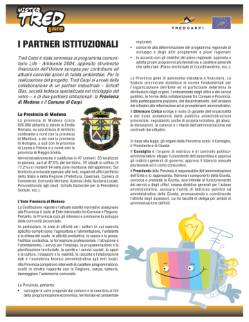 I PARTNER ISTITUZIONALI Tred Carpi è stata ammessa al programma comunitario Life - Ambiente 2004, apposito strumento finanziario dell’Unione europea per contribuire ad attuare concrete azioni di tutela ambientale. Per la realizzazione del progetto, Tred Carpi si avvale della collaborazione di un partner industriale – Schott Glas, società tedesca specializzata nel riciclaggio del vetro – e di due partners istituzionali: la Provincia di Modena e il Comune di Carpi. La Provincia di Modena La provincia di Modena (circa 620.000 abitanti) si stende in Emilia Romana, su una striscia di territorio confinante a nord con la provincia di Mantova, a est con la provincia di Bologna, a sud con le province di Lucca e Pistoia e a ovest con la provincia di Reggio Emilia. Amministrativamente è suddivisa in 47 comuni: 23 localizzati in pianura, pari al 47,5% del territorio, 10 situati in collina (il 17,2%) e i restanti 14 nelle zone montuose dell'appennino. Sul territorio provinciale operano altri enti, organi ed uffici periferici dello Stato e della Regione (Prefettura, Questura, Camera di Commercio, Comunità Montane, Azienda Unità Sanitaria Locale, Provveditorato agli studi, Istituto Nazionale per la Previdenza Sociale, ecc.). L'Ente Provincia di Modena La Costituzione vigente e l'attuale assetto normativo assegnano alla Provincia il ruolo di Ente intermedio fra Comune e Regione. Pertanto, la Provincia cura gli interessi e promuove lo sviluppo della comunità provinciale. In particolare, le aree di attività ed i settori in cui esercita specifici compiti sono: l'agricoltura e l'alimentazione, l'ambiente e la difesa del suolo, le attività produttive, la caccia e la pesca, l'edilizia scolastica, la formazione professionale, l'istruzione e l'orientamento, i servizi per l'impiego, la programmazione e la pianificazione territoriale, la sanità e i servizi sociali, lo sport e la cultura, i trasporti e la viabilità, la raccolta e l'elaborazione dati e l'assistenza tecnico amministrativa agli enti locali. Alla Provincia competono interventi di carattere programmatorio, svolti in stretto rapporto con la Regione, senza, tuttavia, danneggiare l'autonomia comunale. La Provincia, pertanto: • raccoglie le varie proposte dai comuni e le coordina ai fini della programmazione economica, territoriale ed ambientale • • regionale; concorre alla determinazione del programma regionale di sviluppo e degli altri programmi e piani regionali; in accordo con gli obiettivi del piano regionale, appronta e adotta propri programmi pluriennali sia a carattere generale che settoriale (Piano territoriale di Coordinamento, ecc.); La Provincia gode di autonomia statutaria e finanziaria. Lo Statuto provinciale stabilisce le norme fondamentali per l'organizzazione dell'Ente ed in particolare determina le attribuzioni degli organi, l'ordinamento degli uffici e dei servizi pubblici, le forme della collaborazione fra Comuni e Provincia, della partecipazione popolare, del decentramento, dell'accesso dei cittadini alle informazioni ed ai procedimenti amministrativi. Il Difensore Civico svolge il ruolo di garante dell'imparzialità e del buon andamento della pubblica amministrazione provinciale, segnalando anche di propria iniziativa, gli abusi, le disfunzioni, le carenze e i ritardi dell'amministrazione nei confronti dei cittadini. In base alla legge, gli organi della Provincia sono: il Consiglio, il Presidente e la Giunta. Il Consiglio è l'organo di indirizzo e di controllo politicoamministrativo: elegge il presidente dell'assemblea e approva gli indirizzi generali di governo; approva il bilancio annuale pluriennale ed il conto consuntivo. Il Presidente della Provincia è responsabile dell'amministrazione dell'Ente e lo rappresenta. Nomina i componenti della Giunta, convoca e presiede la Giunta, sovrintende al funzionamento dei servizi e degli uffici, emana direttive generali per l'azione amministrativa, assicura l'unità di indirizzo politico ed amministrativo della Giunta, promuovendo e coordinando l'attività degli assessori, cui ha facoltà di delega per ambiti di amministrazione definiti. La Giunta è composta dal Presidente e da otto assessori: è nominata dal Presidente e collabora con lui nella amministrazione della Provincia, nell'attuazione degli indirizzi generali del Consiglio e svolge attività propositiva e di impulso nei confronti del Consiglio stesso. Modena Città Città dell'Emilia-Romagna (comune di 183,63 km2 con 177.000 abitanti), capoluogo dell'omonima provincia, a 34 m s.m. Mercato agricolo e del bestiame, con industrie siderurgiche, meccaniche (automobilistiche, trattori), chimiche (fertilizzanti), alimentari (conserve, formaggi, salumi, zucchero), grafiche, tessili, dell'abbigliamento. Il nucleo più antico possiede un ricco patrimonio artistico: il duomo romanico (secc. XI-XIV) con la torre della Ghirlandina (87 m), il palazzo ducale (XVII sec.), sede dell'Accademia Militare, la galleria Estense, le chiese di S. Pietro, di S. Giovanni Battista, di S. Maria Pomposa, il palazzo dell'università. Cenni Storici Città della confederazione etrusca e più tardi presidio dei Galli, divenne colonia romana (Mutina) verso il 180 a.C. Fiorente centro agricolo e commerciale durante l'età repubblicana e quella imperiale, subì una profonda decadenza nell'alto Medioevo. Libero Comune nel XII sec., passò in seguito sotto la dinastia degli Este, che nel 1598 ne fecero la capitale del ducato. Gli Este vi dominarono, con alterne vicende, fino all'unità d'Italia. Il plebiscito del 1860 ne decretò l'annessione al Piemonte e quindi al Regno d'Italia. Per maggiori informazioni: PROVINCIA DI MODENA Area Ambiente e Sviluppo Sostenibile Via J. Barozzi, 340 – 41100 Modena Tel. +39 (0) 59 20 91 11 - Fax +39 (0) 59 20 94 09 www.provincia.modena.it [email protected] Il Comune di Carpi Carpi è un centro dell’Emilia Romana in Provincia di Modena, il suo Comune è situato nel nord della Provincia ed ha una popolazione di c