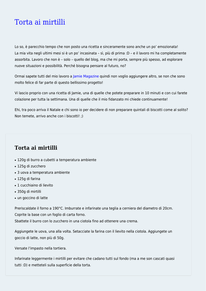 Torta ai mirtilli Lo so, è parecchio tempo che non posto una ricetta e sinceramente sono anche un po’ emozionata! La mia vita negli ultimi mesi si è un po’ incasinata – sì, più di prima :D – e il lavoro mi ha completamente assorbita. Lavoro che non è – solo – quello del blog, ma che mi porta, sempre più spesso, ad esplorare nuove situazioni e possibilità. Perché bisogna pensare al futuro, no? Ormai sapete tutti del mio lavoro a Jamie Magazine quindi non voglio aggiungere altro, se non che sono molto felice di far parte di questo bellissimo progetto! Vi lascio proprio con una ricetta di Jamie, una di quelle che potete preparare in 10 minuti e con cui farete colazione per tutta la settimana. Una di quelle che il mio fidanzato mi chiede continuamente! Ehi, tra poco arriva il Natale e chi sono io per decidere di non preparare quintali di biscotti come al solito? Non temete, arrivo anche con i biscotti! ;) Torta ai mirtilli ● 120g di burro a cubetti a temperatura ambiente ● 125g di zucchero ● 3 uova a temperatura ambiente ● 125g di farina ● 1 cucchiaino di lievito ● 350g di mirtilli ● un goccino di latte Preriscaldate il forno a 190°C. Imburrate e infarinate una teglia a cerniera del diametro di 20cm. Coprite la base con un foglio di carta forno. Sbattete il burro con lo zucchero in una ciotola fino ad ottenere una crema. Aggiungete le uova, una alla volta. Setacciate la farina con il lievito nella ciotola. Aggiungete un goccio di latte, non più di 50g. Versate l’impasto nella tortiera. Infarinate leggermente i mirtilli per evitare che cadano tutti sul fondo (ma a me son cascati quasi tutti :D) e metteteli sulla superficie della torta. Cuocete in forno per 35-40 minuti o fino a doratura. Controllate la cottura con uno stuzzicadenti, quando uscirà pulito la torta sarà pronta. Lasciatela raffreddare, sformatela e servite! Crostata di mele con mandorle Una semplice crostata di mele con mandorle, davvero ricca di gusto! Sapete che ormai da tempo lavoro per la versione italiana della rivista Jamie (sì, proprio quella di Jamie Oliver!) e molto spesso mi capita di provare le ricette che traduco. Purtroppo raramente finiscono nel blog perché scompaiono alla velocità della luce, ma per fortuna, per una volta, non ero in ritardo e sono riuscita a fotografare la torta prima che arrivassero gli ospiti. È una crostata di mele con mandorle con un cuore di crema frangipane. L’ho voluta provare subito perché la ricetta mi ispirava molto e me ne sono innamorata. Rispetto alla ricetta originale ho fatto una piccola modifica inserendo nel ripieno anche le mele, invece Jamie le aveva messe sulla superficie, ma le mie erano mele che chiedevano pietà, tutte un po’ stortarelle, quindi non era proprio possibile :) Il risultato finale è stato pienamente soddisfacente! E se volete comprare Jamie andate in edicola tra un paio di giorni e troverete il numero nuovo ;) Crostata alle mele con mandorle ● 100g di burro ● 125g di zucchero ● 2 uova sbattute ● 125g di mandorle a scaglie ● 1 cucchiaio di farina 00 ● 230g di pasta frolla ● 2 mele piccole, senza torsolo e tagliate finemente ● 10g di pistacchi tritati Innanzi tutto dovete preparare la frolla. Potete seguire questo link che vi porterà ad una frolla perfetta, ovviamente potete scegliere anche la versione della pasta frolla con olio. In una ciotola lavorate il burro con lo zucchero finché sarà chiaro e morbido, poi unite le uova, una alla volta (tenendone 1/2 cucchiaino per la glassa). Aggiungete gli ingredienti secchi e amalgamate l’impasto. Otterrete una crema frangipane. Copritela con la pellicola e mettetela in frigorifero. Preriscaldate il forno a 220°. Stendete la frolla su di un piano di lavoro e ricopriteci una teglia da crostata, imburrata ed infarinata, del diametro di 22-23cm. Mischiate la crema frangipane con le mele e rovesciate il composto sopra la frolla. Cospargete la crema di pistacchi e sistemate il bordo della crostata. Aggiungete le scaglie di mandorle e spennellatele con l’uovo rimasto. Infornate per 25 minuti finché la frolla non sarà dorata, poi aspettate qualche minuto che si raffreddi, sformatela e lasciatela raffreddare completamente su di una gratella. Ricciarelli al cioccolato fondente di Jamie Oliver Non vi devo certo spiegare chi è Jamie Oliver perché è stra-famoso e non ha bisogno di presentazioni, ma se per caso non doveste sapere chi è Jamie, questo è il momento giusto per recuperare. Finalmente, infatti, anche in Italia è uscita la sua rivista, Jamie, appunto. Un magazine veramente ben fatto, pieno di bellissime immagini e altrettanto splendide ricette. Ma le notizie qui sono due: ok, la prima è che in edicola potete trovare il numero di aprile. La seconda, invece, è che – rullo di tamburi – io faccio parte della redazione! Qualcosa tipo dream come true. Per seguirci: Facebook Twitter Sito Quindi vi aspettiamo in edicola con tante belle ricette e, ovviamente il bel Jamie (lo potrò dire al mio capo supremo che è bello? boh… tanto non leggerà! :)) Per questo numero ho tradotto, tra le altre cose, anche la ricetta dei Ricciarelli al cioccolato. E potevo non provarli subito? Ricciarelli al cioccolato fondente ● 150g mandorle sgusciate (o farina di mandorle) ● 200g zucchero a velo, più 250g per decorare ● 2 cucchiai di cacao in polvere ● 2 albumi ● semi di una bacca di vaniglia ● 1 cucchiaino di estratto di mandorla ● 100g di cioccolato fondente, sciolto e lasciato raffreddare Mettete le mandorle tostate in un tritatutto, insieme a due cucchiai di zucchero a velo, e tritatele finemente. Fate attenzione a non tritarle troppo a lungo, altrimenti l’olio contenuto nelle mandorle potrebbe renderle appiccicose. (Oppure prendete direttamente la farina di mandorle) In una ciotola setacciate lo zucchero a velo rimanente ed il cacao, quindi aggiungete le mandorle tritate e mettete da parte il composto. Con una frusta elettrica montate gli a