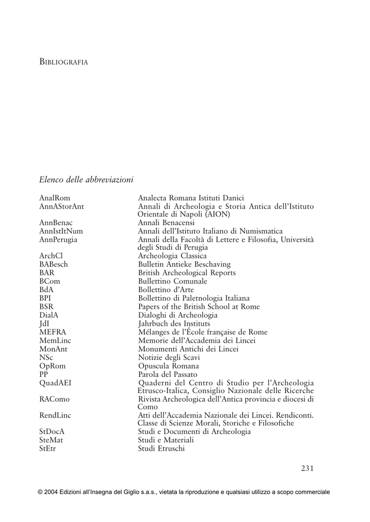 BIBLIOGRAFIA Elenco delle abbreviazioni AnalRom AnnAStorAnt AnnBenac AnnIstItNum AnnPerugia ArchCl BABesch BAR BCom BdA BPI BSR DialA JdI MEFRA MemLinc MonAnt NSc OpRom PP QuadAEI RAComo RendLinc StDocA SteMat StEtr Analecta Romana Istituti Danici Annali di Archeologia e Storia Antica dell’Istituto Orientale di Napoli (AION) Annali Benacensi Annali dell’Istituto Italiano di Numismatica Annali della Facoltà di Lettere e Filosofia, Università degli Studi di Perugia Archeologia Classica Bulletin Antieke Beschaving British Archeological Reports Bullettino Comunale Bollettino d’Arte Bollettino di Paletnologia Italiana Papers of the British School at Rome Dialoghi di Archeologia Jahrbuch des Instituts Mélanges de l’École française de Rome Memorie dell’Accademia dei Lincei Monumenti Antichi dei Lincei Notizie degli Scavi Opuscula Romana Parola del Passato Quaderni del Centro di Studio per l’Archeologia Etrusco-Italica, Consiglio Nazionale delle Ricerche Rivista Archeologica dell’Antica provincia e diocesi di Como Atti dell’Accademia Nazionale dei Lincei. Rendiconti. Classe di Scienze Morali, Storiche e Filosofiche Studi e Documenti di Archeologia Studi e Materiali Studi Etruschi 231 © 2004 Edizioni all’Insegna del Giglio s.a.s., vietata la riproduzione e qualsiasi utilizzo a scopo commerciale AA.VV. 1963: AA.VV., Veio (Isola Farnese). Scavi di una necropoli villanoviana in località “Quattro Fontanili”, «NSc», pp. 53-263. AA.VV. 1965: AA.VV. Veio (Isola Farnese). Continuazione degli scavi nella necropoli villanoviana di “Quattro Fontanili”, «NSc», pp. 49-236. AA.VV. 1967: AA.VV., Veio (Isola Farnese). Continuazione degli scavi nella necropoli villanoviana di “Quattro Fontanili”, «NSc», pp. 87-280. AA.VV. 1969: AA.VV., Restauri archeologici. Mostra dei restauri sulle opere d’arte del Museo Archeologico di Firenze danneggiati dall’alluvione del 4 novembre 1966, Catalogo della mostra (Firenze 1966), Firenze. AA.VV. 1972: AA.VV., Veio (Isola Farnese). Continuazione degli scavi nella necropoli villanoviana di “Quattro Fontanili”,«NSc», pp. 195-384. AA.VV. 1975: AA.VV., Veio (Isola Farnese). Continuazione degli scavi nella necropoli villanoviana di “Quattro Fontanili”, «NSc», pp. 63-184. AA.VV. 1982: AA.VV., Satricum. Una città latina, Firenze. AA.VV. 1983: AA.VV., Ardea. Immagini di una ricerca, Roma. AA.VV. 1987: AA.VV. Etrusker in der Toscana, Catalogo della mostra (Malmö, 1987), Firenze. ACCONCIA 2001: V. ACCONCIA, Fosse e discariche come indicatori di strutture sociali: alcuni esempi, in BRANDT, KARLSSON 2001, pp. 377-381. ACCONCIA 2002: V. ACCONCIA, La formazione del territorio in Etruria settentrionale interna: il caso di Campassini, in Atti Colle Val d’Elsa, pp. 127-147. ACCONCIA, AIELLO 1999: V. ACCONCIA, M. AIELLO, I tipi più antichi di fornaci da ceramica in ambito etrusco: l’esempio di Monteriggioni, «StEtr», LXIII, pp. 349-363. ACCONCIA et alii 2002: V. ACCONCIA, G. BANDINELLI, D. ZINELLI, Località Quartaia (Colle Val d’Elsa – SI): le prime campagne di scavo, in Atti Colle Val d’Elsa, pp. 149-160. AGOSTINIANI 1982: L. AGOSTINIANI, Le “iscrizioni parlanti” dell’Italia antica, Firenze. ALBERICI VARINI 1999: C. ALBERICI VARINI, Corredi funerari dalla necropoli ceretana della Banditaccia-Laghetto I. Tombe 64, 65, 68, «Rassegna di Studi del Civico Museo Archeologico e del Civico Gabinetto Numismatico di Milano», supplemento XIX. ANDREOTTI et alii 1998: A. ANDREOTTI, M.C. BETTINI, P. GAMBOGI-S. MATERAZZI, A. ZANINI, Il Bronzo Finale e la prima età del Ferro nell’Etruria Settentrionale, in NEGRONI CATACCHIO 1995a, pp. 7-22. ANGLE, GIANNI 1985: M. ANGLE, A. GIANNI, La morte ineguale: dinamiche sociali riflesse nel rituale funerario. Il caso della necropoli dell’età del ferro di Caracupa, «Opus», IV, pp. 179-215. ARANGUREN et alii 1985: B.M. ARANGUREN, E. PELLEGRINI, P. PERAZZI, L’insediamento protostorico di Pitigliano. Campagne di scavo 1982-83, Pitigliano. ARANGUREN, PARIBENI ROVAI 1998: B.M. ARANGUREN, E. PARIBENI ROVAI, Follonica etrusca. I segni di una civiltà, Catalogo della mostra (Follonica, 1998), Follonica. ARNOLD 1989: D.E. ARNOLD, Ceramic Theory and Cultural Process, Cambridge. Atti Colle Val d’Elsa: Città e territorio nell’Etruria settentrionale, Atti delle Giornate di studio (Colle di Val d’Elsa, 1998), Colle di Val d’Elsa 2002. Atti Grosseto: La civiltà arcaica di Vulci, Atti del X Convegno di Studi Etruschi ed Italici (Grosseto, 1975), Firenze 1977. Atti Orvieto: Chiusi dal Villanoviano all’età arcaica, in Annali della Fondazione per il Museo Claudio Faina di Orvieto VII, Atti del Convegno (Orvieto, 1999), Roma 2000. Atti Salerno-Pontecagnano: La presenza etrusca nella Campania Meridionale, Atti delle Giornate di Studio (Salerno-Pontecagnano, 1990), Firenze 1994. 232 © 2004 Edizioni all’Insegna del Giglio s.a.s., vietata la riproduzione e qualsiasi utilizzo a scopo commerciale Atti Volterra: Aspetti della cultura di Volterra etrusca fra l’età del ferro e l’età ellenistica e contributi alla ricerca antropologica alla conoscenza del popolo etrusco, Atti del XIX Convegno di Studi Etruschi ed Italici (Volterra, 1995), Firenze 1997. BAGLIONE, DE LUCIA BROLLI 1990: M.P. BAGLIONE, M.A. DE LUCIA BROLLI, Nuovi dati sulla necropoli de “I Tufi” di Narce, in La Civiltà dei Falisci, Atti del XV convegno di Studi Etruschi e Italici (Civita Castellana, 1987), Firenze, pp. 62-102. BALDELLI 1999: G. BALDELLI, L’insediamento di Montedoro di Scapezzano, in G. COLONNA (a cura di), I Piceni, Popolo d’Europa, Catalogo della mostra (TeramoAscoli Piceno, 2000), Roma, pp. 169-170. BALDONI 1994: D. BALDONI, La necropoli di Villanova-Caselle di San Lazzaro: la tomba 25, in FORTE, VON ELES 1994, pp. 270-290. BARBIERI, GAMBI 1973: G. BARBIERI, L. GAMBI, La casa rurale in Italia, Firenze. BARNABEI 1893: F. BARNABEI, Di un sepolcro con cinerario fittile in forma di capanna scoperto nella 