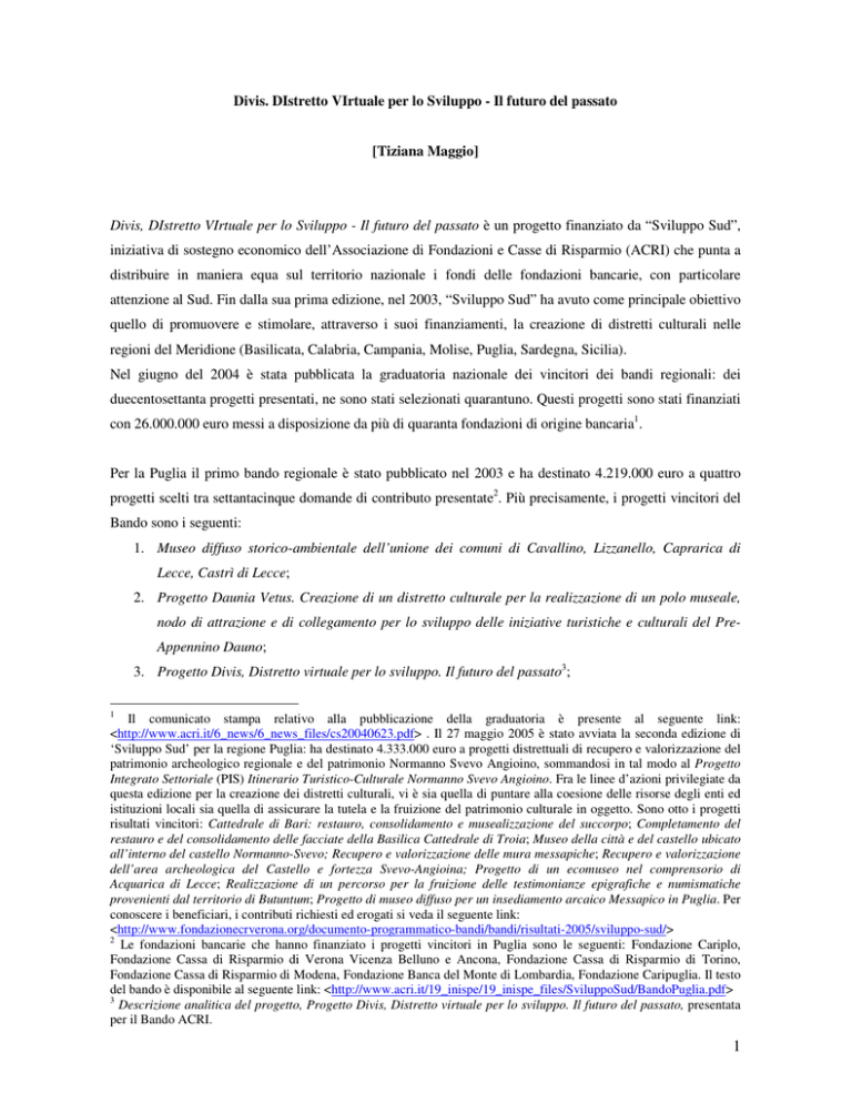 Divis. DIstretto VIrtuale per lo Sviluppo - Il futuro del passato [Tiziana Maggio] Divis, DIstretto VIrtuale per lo Sviluppo - Il futuro del passato è un progetto finanziato da “Sviluppo Sud”, iniziativa di sostegno economico dell’Associazione di Fondazioni e Casse di Risparmio (ACRI) che punta a distribuire in maniera equa sul territorio nazionale i fondi delle fondazioni bancarie, con particolare attenzione al Sud. Fin dalla sua prima edizione, nel 2003, “Sviluppo Sud” ha avuto come principale obiettivo quello di promuovere e stimolare, attraverso i suoi finanziamenti, la creazione di distretti culturali nelle regioni del Meridione (Basilicata, Calabria, Campania, Molise, Puglia, Sardegna, Sicilia). Nel giugno del 2004 è stata pubblicata la graduatoria nazionale dei vincitori dei bandi regionali: dei duecentosettanta progetti presentati, ne sono stati selezionati quarantuno. Questi progetti sono stati finanziati con 26.000.000 euro messi a disposizione da più di quaranta fondazioni di origine bancaria1. Per la Puglia il primo bando regionale è stato pubblicato nel 2003 e ha destinato 4.219.000 euro a quattro progetti scelti tra settantacinque domande di contributo presentate2. Più precisamente, i progetti vincitori del Bando sono i seguenti: 1. Museo diffuso storico-ambientale dell’unione dei comuni di Cavallino, Lizzanello, Caprarica di Lecce, Castrì di Lecce; 2. Progetto Daunia Vetus. Creazione di un distretto culturale per la realizzazione di un polo museale, nodo di attrazione e di collegamento per lo sviluppo delle iniziative turistiche e culturali del PreAppennino Dauno; 3. Progetto Divis, Distretto virtuale per lo sviluppo. Il futuro del passato3; 1 Il comunicato stampa relativo alla pubblicazione della graduatoria è presente al seguente link: <http://www.acri.it/6_news/6_news_files/cs20040623.pdf> . Il 27 maggio 2005 è stato avviata la seconda edizione di ‘Sviluppo Sud’ per la regione Puglia: ha destinato 4.333.000 euro a progetti distrettuali di recupero e valorizzazione del patrimonio archeologico regionale e del patrimonio Normanno Svevo Angioino, sommandosi in tal modo al Progetto Integrato Settoriale (PIS) Itinerario Turistico-Culturale Normanno Svevo Angioino. Fra le linee d’azioni privilegiate da questa edizione per la creazione dei distretti culturali, vi è sia quella di puntare alla coesione delle risorse degli enti ed istituzioni locali sia quella di assicurare la tutela e la fruizione del patrimonio culturale in oggetto. Sono otto i progetti risultati vincitori: Cattedrale di Bari: restauro, consolidamento e musealizzazione del succorpo; Completamento del restauro e del consolidamento delle facciate della Basilica Cattedrale di Troia; Museo della città e del castello ubicato all’interno del castello Normanno-Svevo; Recupero e valorizzazione delle mura messapiche; Recupero e valorizzazione dell’area archeologica del Castello e fortezza Svevo-Angioina; Progetto di un ecomuseo nel comprensorio di Acquarica di Lecce; Realizzazione di un percorso per la fruizione delle testimonianze epigrafiche e numismatiche provenienti dal territorio di Butuntum; Progetto di museo diffuso per un insediamento arcaico Messapico in Puglia. Per conoscere i beneficiari, i contributi richiesti ed erogati si veda il seguente link: <http://www.fondazionecrverona.org/documento-programmatico-bandi/bandi/risultati-2005/sviluppo-sud/> 2 Le fondazioni bancarie che hanno finanziato i progetti vincitori in Puglia sono le seguenti: Fondazione Cariplo, Fondazione Cassa di Risparmio di Verona Vicenza Belluno e Ancona, Fondazione Cassa di Risparmio di Torino, Fondazione Cassa di Risparmio di Modena, Fondazione Banca del Monte di Lombardia, Fondazione Caripuglia. Il testo del bando è disponibile al seguente link: <http://www.acri.it/19_inispe/19_inispe_files/SviluppoSud/BandoPuglia.pdf> 3 Descrizione analitica del progetto, Progetto Divis, Distretto virtuale per lo sviluppo. Il futuro del passato, presentata per il Bando ACRI. 1 4. CastLE. Castelli salentini in tour. Lecce. Sistema di valorizzazione e fruizione del Circuito fortificato salentino4. Fra questi quattro progetti, Divis ha richiesto e ricevuto il finanziamento maggiore: l’erogazione concessa dal Bando è stata di 1.095.000 euro5. Il progetto, la cui durata viene fissata in 24 mesi, è stato promosso dai Comuni di Castellana Grotte e di Canosa di Puglia che, per l’occasione, si sono costituiti in Associazione Temporanea di Scopo (ATS). Il progetto era stato redatto da una costituenda Associazione Temporanea d’Impresa (ATI) composta da quattro società pugliesi, Digamma Società Consortile di Bari, Consorzio Campus Virtuale di Bari, Grotte di Castellana s.r.l., e dalla Fondazione Archeologica Canosina di Canosa di Puglia6. È stato nominato capofila del progetto il Comune di Castellana Grotte. Il 29 dicembre 2004 la Fondazione Cariverona indicava ai due Comuni le modalità operative necessarie perché fosse erogato il finanziamento. Fra queste vi erano la stesura ed approvazione di un atto costitutivo e di uno statuto per l’Associazione Temporanea di Scopo dei due Comuni. Tale indicazione fu seguita dal Comune di Canosa, che approvava lo statuto. Sembra però che il Comune di Castellana non abbia effettuato le operazioni necessarie all’approvazione dell’atto costitutivo. La finalità di Divis era la creazione di un «distretto culturale virtuale a rete fra il sito di interesse speleologico delle Grotte di Castellana ed il sito di interesse archeologico Ipogeo Varrese del Comune di Canosa di Puglia, per la loro valorizzazione culturale e per lo sviluppo turistico ecocompatibile delle aree pertinenti il progetto».7 Le Grotte di Castellana, le cavità carsiche più grandi d’Italia, furono scoperte nel 1938 dallo speleologo Anelli e sono caratterizzate da spettacolari stalattiti e stalagmiti. In prossimità delle grotte, si trova il Museo peleologico Franco Anelli che è il vero oggetto degli interventi