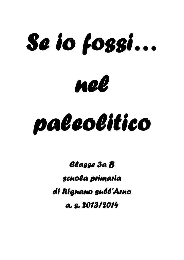 Se io fossi… nel paleolitico Classe 3a B scuola primaria di Rignano sull'Arno a. s. 2013/2014 Una settimana speciale del paleolitico Tanto tempo fa, nel paleolitico, c’era un villaggio di Homo sapiens sapiens, in una capanna c’era una piccola famigliola con padre, madre, figlia e figlio. Il figlio ero io Gartery: questo è il mio nome. Eravamo una famiglia felice come tutte le altre del villaggio. Ma un brutto giorno, nell’ora di pranzo, si sentì un tremendo boato, io mi affacciai e vidi una nube scura che si alzava verso l’alto e che oscurò il cielo. Questo evento durò alcuni giorni, poi all’improvviso dalla nube nera comparve un raggio di sole che mi fece vedere un’immensità di ghiaccio. Presi un pezzo di roccia grande come una mela e un legno lungo come un braccio. Andai sul ghiaccio piazzai il pezzo di legno e ci battei sopra con la roccia: si sentì un crac e da lì scivolò tutto il ghiaccio e rimasero scoperte le rocce: erano liscissime! Io non so come presi il sasso, è come se la mia mente facesse tutto a modo suo, colpii la roccia e feci un piccolo, o meglio, un piccolissimo buco. Io lo vidi e ne feci un altro accanto, sentii un fruscio e vidi un cervo e mi venne in mente di scolpirlo. Appena lo feci vidi mio padre che faceva yoga e mi venne in mente di scolpire anche lui. Poi portai a casa la pietra con il cervo e mio padre scolpiti sopra, andai vicino al fuoco, sopra il mio giaciglio di paglia e mostrai i miei disegni a mia sorella. Lei mi chiese come avevo fatto e io risposi che ero andato nella valle qui vicino e avevo scolpito un cervo e mio padre. Mia sorella si congratulò con me e da quel giorno quella valle fu sacra. Il giorno dopo si tenne un consiglio e fu deciso che quella valle si sarebbe chiamata “Valle Camonica” e tutti andarono lì a scolpire nel luogo sacro. Invece io e mia sorella andammo ad esplorare accanto alla valle e vedemmo che il sole faceva un effetto su tutti e due i lati e lo mostrammo a tutti. Lo urlammo, si sentì un rimbombo tremendo e tutti ci ascoltarono. Gli anziani dissero che dove rimbombava l’eco si scolpiva anche più di una volta. Andrea R SE IO FOSSI… NEL PALEOLITICO Nel paleolitico, nel villaggio di Sapned viveva un bambino di nome Anthony e gli piaceva fare tante cose. Un giorno lo chiamarono per andare a pescare, lui pescava tanti pesci. Il secondo giorno andava a cacciare, a lui piaceva cacciare. Dopo era andato a cena con il cibo che aveva cacciato. La vita degli homo sapiens era molto bella perché facevano tante cose. Antonio SE IO FOSSI… NEL PALEOLITICO Noi siamo andati nella 4 b alla lavagna interattiva a vedere le pitture rupestri degli homo di Neanderthal, australopitechi io ho disegnato un homo sapiens. Il paleolitico è una preistoria dove ci sono uomini e animali. Tutti gli animali possono scappare e i Neanderthal catturano cinghiali, conigli cattivi, cervi e orsi con una pietra tagliente che poteva tagliare la carne degli animali come gli uomini che mangiano la carne di cucina. I sapiens vengono dalla savana scrivevano e disegnavano animali morti e uomini. Di notte dormivano nel loro letto di roccia dentro le caverne di roccia. Andrea F SE IO FOSSI… NEL PALEOLITICO C’era una volta tanto tempo fa una famiglia di homo sapiens che vivevano in valle Camonica, stavano nelle grotte. La mamma si chiama Denise e il babbo Mario e avevano una bambina che si chiamava Leila . Tante volte sulle rocce facevano le incisioni rupestri per ricordarsi cosa cacciavano, per festeggiare, per immaginarsi il loro corpo e disegnavano i cervi perché per loro erano molto importanti. Le rocce dove incidevano erano dentro le grotte o montagne o alla punta di montagne. Quando non si incideva si andava a caccia per prendere la carne che poi mettevano al fuoco e la mangiavano bella arrostita. Denise SE IO FOSSI… NEL PALEOLITICO C’ era una volta, tanto tempo fa, una tribù di omini. Questi omini erano molto bravi nella caccia, soprattutto il capo di nome Predatore Fulmineo, la sua compagna invece si chiamava Spatola Succosa, era molto brava a cucinare di tutto. I suoi due bambini si chiamavano Ducciouan e Andreauon erano bravissimi a fare le incisioni rupestri. I due disegnavano omini, cervi e lance e usavano sassi appuntiti per scalfire la pietra. Un bel giorno Ducciouan e Andreauon con il loro padre andarono a fare delle incisioni ma fecero un brutto incontro con un orso delle caverne. Dopo aver ucciso l’ orso, i tre tornarono al villaggio. Spatola Succosa fece diventare l’ orso una buonissima carne al fuoco e fecero un gran banchetto. Tutta la tribù visse felice e contenta. Duccio SE IO FOSSI… NEL PALEOLITICO C’ era una volta, in un’era paleolitica, un paese che si chiamava Valle Camonica. Lì ci vivevano tante persone per fare i disegni e li facevano in modo molto preistorico. Prendevano una roccia molto particolare, dura che si trova dove ci sono due montagne molto speciali: una volta all’ anno fanno un effetto che sembra magico. A proposito, io mi chiamo Jimmer. Nella prima montagna un raggio di sole buca la cima, alla seconda invece appare un’ ombra che viene dal sole. In quel posto, in mezzo a queste montagne, quando si urla si sente l’ eco ed è lì che si trovano le pietre. Noi scegliamo una roccia molto grande e lì si scolpisce: scolpiamo omini e cervi e viene una cosa bellissima: Noi lo facciamo perché vogliamo disegnare la nostra vita. Gaia SE IO FOSSI… NEL PALEOLITICO I sapiens facevano dipinti sulle grotte e disegnavano le case che per loro erano importanti. C ostruivano le cose di legno nelle grotte e facevano i dipinti e il tiro con l’arco per cacciare gli animali. Dipingevano sulle grotte per ricordare le cose che hanno fatto e quelle più importanti per loro. Disegnavano quando cacciavano, quando tiravano l’arco e tante altre cose. Giulio C. SE IO FOSSI… NEL PALEOLITICO Nel paleolitico i sapiens si spostarono nella Valle Camonica in Italia. Tutti i giorni cacciavano e quando