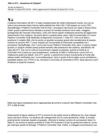 Z68 vs Z77... Questione di Chipset? Scritto da Alessio C. Martedì 10 Aprile 2012 00:00 - Ultimo aggiornamento Martedì 24 Aprile 2012 12:44 Il settore informatico nel 2011 è stato caratterizzato da molte interessanti novità, ma una su tutte è sicuramente stata il lancio delle piattaforme Intel LGA 1155 basate sui nuovi CPU SandyBridge e Platform Controller Hub di Intel. I processori del brand con sede a Santa Clara, infatti, grazie a performance elevate e a prezzi di vendita contenuti sono stati i maggiori protagonisti del mercato informatico, visto che hanno spinto moltissime persone ad aggiornare interamente il loro sistema. Da pochi giorni a questa parte, però, Intel ha presentato un nuovo Platform Controller HUB destinato al segmento Consumer, l' Intel Z77, che va di fatto a sostituire il modello Z68, che ha avuto un grande successo grazie alla caratteristica di essere, insieme al vecchio P67, l' unico chipset con funzionalità di Overclock compatibile con i processori SandyBridge. Con l' arrivo del nuovo Platform Controller Hub, però, ci siamo chiesti quanto un singolo chipset possa portare benefici alle prestazioni del sistema, soprattutto nel caso del Z77, che non è nulla di rivoluzionario rispetto al passato, poichè si tratta di un Controller che si basa sui suoi predecessori, andando di fatto a riutilizzarne i punti forti e a migliorarne quelli più deboli. Con Z77, quindi, ci potremmo trovare nuovamente di fronte alla stessa realtà verificatasi con i suoi predecessori, dove il punto di forza della nuova architettura potrebbe essere non il PCH in se, ma bensì il connubio di Controller e CPU. Sarà davvero così? Andiamo a scoprirlo insieme. Nelle due figure sottostanti sono rappresentati gli schemi a blocchi dei Platform Controller Hub Z77 e Z68 di Intel. Osservando la figura relativa al Z77 si evince fin da subito come le differenze tra i due chipset siano davvero minime. La struttura dei collegamenti con le varie periferiche, infatti, è rimasta praticamente inviariata rispetto al passato, offrendo lo stesso numero di connessioni Sata II e Sata III, ma anche la stessa quantità di Linee PCI Express 2.0 per le periferiche esterne, come per esempio quelle di Storage. Il Platform Controller Hub, inoltre, è collegato al processore con 1/9 Z68 vs Z77... Questione di Chipset? Scritto da Alessio C. Martedì 10 Aprile 2012 00:00 - Ultimo aggiornamento Martedì 24 Aprile 2012 12:44 lo stesso schema usato anche su Z68, dove troviamo un Link DMI da 20GB/s ed un collegamento, chiamato Flexible Display Interface, studiato per inviare il segnale in uscita dalla GPU integrata nel CPU alle tre connessioni video offerte dal Z77. Una delle prime differenze evidenti di Z77 rispetto a Z68 è la presenza del supporto nativo alle connessioni USB 3.0. Con Z77, infatti, si potrà godere di ben quattro connessioni USB 3.0 senza la necessità di adoperare controller esterni, rendendo di fatto il Layout delle Mainboard più semplice e anche la gestione dei driver meno complicata. L' inserimento delle quattro porte USB 3.0 riduce a 10 il numero di connettività USB 2.0, ma calcolando la retrocompatibilità delle porte adottanti il nuovo standard, il numero di connessioni USB messe a disposizione rimane praticamente invariato rispetto al passato, ovvero quattordici. Allargando l' attenzione all' intera piattaforma, e non solo al controller, appare subito evidente come un notevole salto in avanti sia stato fatto con le memorie, infatti con IvyBridge il Memory Controller integrato nella CPU sarà certificato per funzionare a 1600 MHz, rispetto ai 1333 MHz di SandyBridge. Restano invece invariate, sempre per quanto riguarda le connettività offerte dalla CPU, il numero di linee PCI Express messe a disposizione, che diventeranno però compatibili con lo standard PCI Express 3.0. Z77 è anche compatibile con i sistemi Multi VGA, e nel caso di una piattaforma dotata di due Schede video queste lavoreranno a 8X ciascuna, o, qualora fosse in funzione la nuova tecnologia di connessione Intel Thunderbolt, una VGA funzionerà a 8X mentre la seconda a soli 4X, lasciando così libere le 4 linee PCI Express necessarie a Thunderbolt. 2/9 Z68 vs Z77... Questione di Chipset? Scritto da Alessio C. Martedì 10 Aprile 2012 00:00 - Ultimo aggiornamento Martedì 24 Aprile 2012 12:44 Nella tabella seguente sono riassunti i componenti utilizzati per l' analisi delle Performance: Abbiamo deciso di eseguire svariate prove al fine di determinare quali fossero le Performance del nuovo Z77 abbinato ai nostri componenti, e abbiamo suddiviso il lavoro in più sessioni. La prima parte di test è stata incentrata sul calcolo delle Performance della piattaforma Z77 abbinata ad un processore Intel Core I7 2700k . Il sistema è stato tenuto prima in condizioni di Default, quindi con CPU a 3500 MHz (100 x 35) con la modalità Turbo attiva e memorie a 1333 MHz con timing a 9-9-9-24. Successivamente abbiamo ripetuto gli stessi test ma con un leggero overclock del sistema, così da vedere il boost prestazionale ottenibile dal PC, e, in questa situazione, le frequenze sono state portate a 4500 MHz per la CPU (100 x 45) e le memorie sono state settate a 2133 MHz con timing a 8-10-10-24 1T. Dopo aver concluso i test con Z77, abbiamo deciso di ripeterli utilizzando una piattaforma Z68, raccogliendo nuovamente i dati del sistema a Default e poi in Overclock, così da riuscire a capire quanto il Platform Controller Hub più aggiornato possa influire sulle prestazioni. I software utilizzati sono i seguenti: - SuperPi 3/9 Z68 vs Z77... Questione di Chipset? Scritto da Alessio C. Martedì 10 Aprile 2012 00:00 - Ultimo aggiornamento Martedì 24 Aprile 2012 12:44 - WPrime - WinRaR 4.11 64 Bit - CineBench 11.5 64 Bit - Aida 64 Extreme Edition 2.30.1900 - 3DMark Vantage - 3DMark 11 - Crysis 2 - Dirt 3 - Lost Planet 2 - Metro 2033 - Atto Disk Benchmark Tool - HD Tune PRO 5.00 4/9 Z68 vs Z77... Questione di Chipset? Scritto da Alessio C. Martedì 10