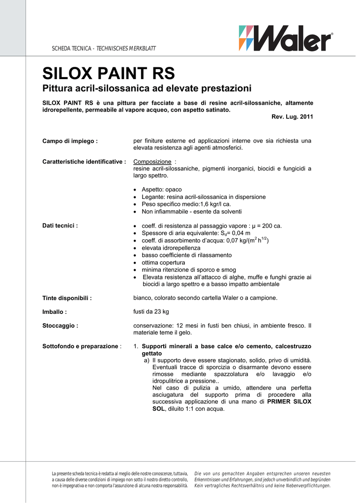 SCHEDA TECNICA - TECHNISCHES MERKBLATT SILOX PAINT RS Pittura acril-silossanica ad elevate prestazioni SILOX PAINT RS è una pittura per facciate a base di resine acril-silossaniche, altamente idrorepellente, permeabile al vapore acqueo, con aspetto satinato. Rev. Lug. 2011 Campo di impiego : per finiture esterne ed applicazioni interne ove sia richiesta una elevata resistenza agli agenti atmosferici. Caratteristiche identificative : Composizione : resine acril-silossaniche, pigmenti inorganici, biocidi e fungicidi a largo spettro. • • • • Aspetto: opaco Legante: resina acril-silossanica in dispersione Peso specifico medio:1,6 kgr/l ca. Non infiammabile - esente da solventi Dati tecnici : • • • • • • • • coeff. di resistenza al passaggio vapore : µ = 200 ca. Spessore di aria equivalente: Sd= 0,04 m coeff. di assorbimento d’acqua: 0,07 kg/(m2 h1/2) elevata idrorepellenza basso coefficiente di rilassamento ottima copertura minima ritenzione di sporco e smog Elevata resistenza all’attacco di alghe, muffe e funghi grazie ai biocidi a largo spettro e a basso impatto ambientale Tinte disponibili : bianco, colorato secondo cartella Waler o a campione. Imballo : fusti da 23 kg Stoccaggio : conservazione: 12 mesi in fusti ben chiusi, in ambiente fresco. Il materiale teme il gelo. Sottofondo e preparazione : 1. Supporti minerali a base calce e/o cemento, calcestruzzo gettato a) Il supporto deve essere stagionato, solido, privo di umidità. Eventuali tracce di sporcizia o disarmante devono essere rimosse mediante spazzolatura e/o lavaggio e/o idropulitrice a pressione.. Nel caso di pulizia a umido, attendere una perfetta asciugatura del supporto prima di procedere alla successiva applicazione di una mano di PRIMER SILOX SOL, diluito 1:1 con acqua. La presente scheda tecnica è redatta al meglio delle nostre conoscenze, tuttavia, a causa delle diverse condizioni di impiego non sotto il nostro diretto controllo, non è impegnativa e non comporta l’assunzione di alcuna nostra responsabilità. Die von uns gemachten Angaben entsprechen unseren neuesten Erkenntnissen und Erfahrungen, sind jedoch unverbindlich und begründen Kein vertragliches Rechtsverhältnis und keine Nebenverpflichtungen. 2. Sottofondo con pittura o rivestimento esistente b) nel caso di pitture o rivestimenti plastici, o minerali solidali ed integri, spazzolare a secco in profondità, quindi previa pulizia a umido e successiva asciugatura applicare una mano di PRIMER SILOX SOL, diluizione 1:1 con acqua. c) pitture o rivestimenti minerali parzialmente distaccati: rimuovere meccanicamente o mediante idropulitrice a pressione, quindi su supporto perfettamente asciutto applicare due mani bagnato su bagnato di PRIMER ISOL 46 S a solvente. Modalità di impiego : a pennello, pennellessa, o rullo. a) applicare una mano di SILOX PAINT RS diluito 20% con acqua; b) dopo almeno 24 ore applicare una seconda mano di SILOX PAINT RS diluito 10% con acqua. La pulizia degli attrezzi va fatta subito dopo l’uso con acqua. Avvertenze: La temperatura in fase di applicazione deve essere compresa tra +5 e +30 °C. Non applicare sotto sole battente o in presenza di vento persistente. Non applicare con Umidita’ Relativa dell’ambiente superiore a 80%. Si raccomanda di applicare il prodotto nelle condizioni climatiche suddette per non pregiudicare le caratteristiche estetiche e prestazionali del prodotto. Proteggere le superfici da pioggia e umidità per 48 ore circa sino a completa essiccazione del prodotto. Il prodotto completa i processo di filmazione in 8-10 giorni in condizioni ambientali ottimali (5-30°C; U.R. max 80%) Nel caso le superfici dovessero subire dilavamenti da parte dell’acqua piovana in questo lasso di tempo, si potrebbero verificare antiestetiche colature o rigature verticali traslucide. Questo fenomeno non pregiudica le prestazioni del prodotto e può essere rimosso tramite idrolavaggio o a seguito successive precipitazioni piovose. Nel caso di utilizzo di più lotti di produzione è consigliabile rimescolare fra loro le varie produzioni allo scopo di evitare leggere differenze di tonalità. E’ consigliato utilizzare sempre materiale dello stessa produzione da spigolo a spigolo. Nel caso si renda necessario il proseguimento in parete con una nuova produzione, non realizzare l’accostamento contiguo delle tinte ma utilizzare per il raccordo le eventuali interruzioni di continuità della superficie quali spigoli, modanature o altro. Consumo: 2 0,4 –0,5 kg/m per due mani Tossicità : nulla. In caso di prolungato contatto con mucose ed occhi, lavare con abbondante acqua e sapone. Si consiglia di provvedere, nel caso di applicazione all’interno, ad una normale ventilazione. IMTE s.r.l. - Div. Waler Via Leonardo da Vinci, 5 - 20020 - Solaro MI Tel. +39 02 969.01.67 r.a. - Fax + 39 02 969.18.27 - www.waler.it - [email protected] R.E.A. n° 820452 Registro Imprese e Codice Fiscale 00864560156 Part. I.V.A. 00698220969