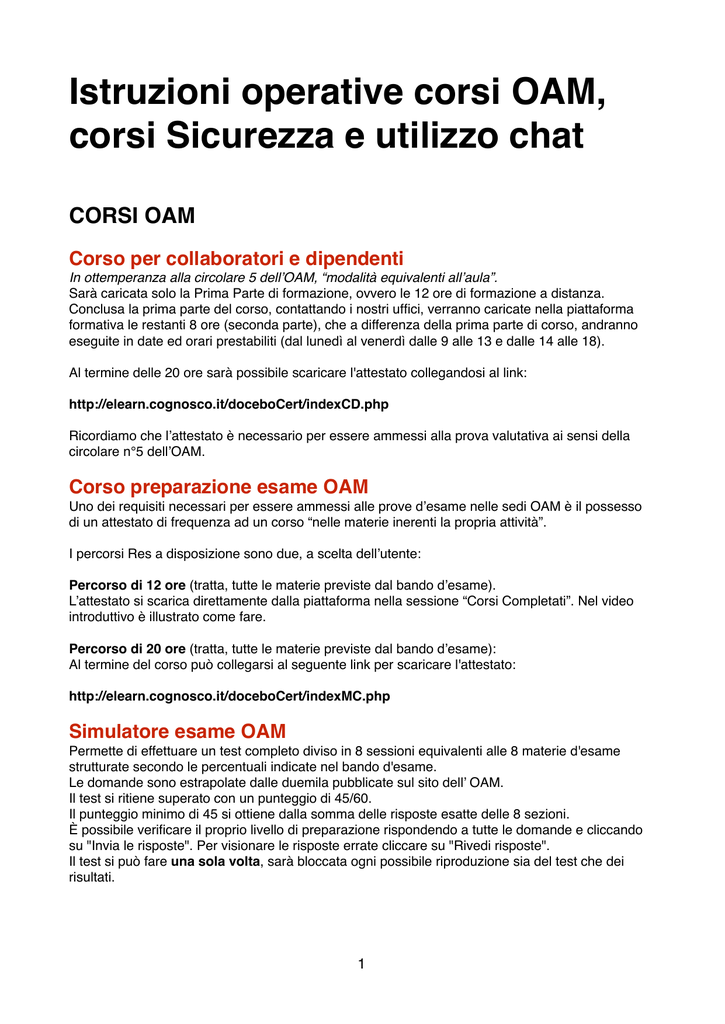 Istruzioni operative corsi OAM, corsi Sicurezza e utilizzo chat! ! ! CORSI OAM! ! Corso per collaboratori e dipendenti! In ottemperanza alla circolare 5 dell’OAM, “modalità equivalenti all’aula”.! Sarà caricata solo la Prima Parte di formazione, ovvero le 12 ore di formazione a distanza.! Conclusa la prima parte del corso, contattando i nostri uffici, verranno caricate nella piattaforma formativa le restanti 8 ore (seconda parte), che a differenza della prima parte di corso, andranno eseguite in date ed orari prestabiliti (dal lunedì al venerdì dalle 9 alle 13 e dalle 14 alle 18).! ! Al termine delle 20 ore sarà possibile scaricare l'attestato collegandosi al link:! ! http://elearn.cognosco.it/doceboCert/indexCD.php! ! Ricordiamo che l’attestato è necessario per essere ammessi alla prova valutativa ai sensi della circolare n°5 dell’OAM.! ! Corso preparazione esame OAM! Uno dei requisiti necessari per essere ammessi alle prove d’esame nelle sedi OAM è il possesso di un attestato di frequenza ad un corso “nelle materie inerenti la propria attività”. ! ! I percorsi Res a disposizione sono due, a scelta dell’utente: ! ! Percorso di 12 ore (tratta, tutte le materie previste dal bando d’esame). ! L’attestato si scarica direttamente dalla piattaforma nella sessione “Corsi Completati”. Nel video introduttivo è illustrato come fare.! ! Percorso di 20 ore (tratta, tutte le materie previste dal bando d’esame): ! Al termine del corso può collegarsi al seguente link per scaricare l'attestato:! ! http://elearn.cognosco.it/doceboCert/indexMC.php! ! Simulatore esame OAM! Permette di effettuare un test completo diviso in 8 sessioni equivalenti alle 8 materie d'esame strutturate secondo le percentuali indicate nel bando d'esame. ! Le domande sono estrapolate dalle duemila pubblicate sul sito dell’ OAM.! Il test si ritiene superato con un punteggio di 45/60. ! Il punteggio minimo di 45 si ottiene dalla somma delle risposte esatte delle 8 sezioni. ! È possibile verificare il proprio livello di preparazione rispondendo a tutte le domande e cliccando su "Invia le risposte". Per visionare le risposte errate cliccare su "Rivedi risposte".! Il test si può fare una sola volta, sarà bloccata ogni possibile riproduzione sia del test che dei risultati. ! ! ! 1 Simulatore illimitato esame OAM ! Ha la stessa funzionalità del Simulatore esame OAM, con l’unica differenza che l’esame può essere simulato all’infinito senza limiti di tempo e numero. Ovviamente il test si ricomporrà tutte le volte attingendo casualmente alle duemila domande pubblicate sul sito OAM.! ! ! Aggiornamento Biennale OAM 60 ore! Il corso è diviso in quattro parti da 15 ore, fruibili e acquistabili separatamente.! Come richiesto dall'Organismo nella circolare n.6/12 (modalità equivalenti all’aula), le 10 ore di video lezione devono essere fruite in orari prestabiliti:! dal Lunedì al Venerdì, nei seguenti orari 9:00 - 13:00 / 14:00 - 18:00! Le restanti 5 ore di corso sono fruibili 24 ore su 24 e 7 giorni su 7.! ! Il corso è così suddiviso:! ! Prima Parte! • 10 ore di video lezione sulle seguenti materie: Antiriciclaggio, Arbitro Bancario Finanziario, Reclami e Trasparenza parte 1 e 2.! • 5 ore di slide commentate sulle seguenti materie: Mutuo, Apertura di Credito, Carta di Credito, Cessione del Quinto.! ! Seconda parte! • 10 ore di video lezione sulle seguenti materie: Valutazione del Merito Creditizio, Le Garanzie, Disciplina dell'usura.! • 5 ore di video lezione sulle seguenti materie: Disciplina in tema di Intermediazione Assicurativa, Tutela del Consumatore.! ! Terza Parte! • 10 ore di video lezione sulle seguenti materie: La nuova adeguata verifica in vigore da 01/01/2014, i soggetti operanti nell’intermediazione creditizia: gli intermediari bancari, gli intermediari finanziari e gli intermediari del credito;! • 5 ore di video lezione sulle seguenti materie: il sistema istituzionale preposto alla regolazione e al controllo del sistema finanziario; i mediatori creditizi e gli agenti in attività finanziaria in particolare: attività svolta, requisiti richiesti, sistema di vigilanza.! ! Quarta parte! • 10 ore di video lezione sulle seguenti materie: prestiti personali, affidamenti finalizzati, leasing deleghe di pagamento, deontologia e correttezza professionale nei rapporti con il cliente.! • 5 ore di video lezione sulle seguenti materie: factoring, aspetti tecnici e normativi dei servizi di pagamento.! ! ! CORSI SICUREZZA! Ai sensi dell’accordo Stato Regioni del dicembre 2011. ! Il test finale previsto dopo la formazione e-learning deve essere fatto "in presenza". ! Perciò, al termine del percorso formativo on-line deve essere necessariamente scaricato e stampato il test finale che, una volta completato, va inviato a RES srl, all’att.ne di Sabrina Bernini, via fax al n. 0587 211063 oppure via e-mail all’indirizzo [email protected].! A seguito del superamento del test sarà reso disponibile, sulla piattaforma e-learning, l’attestato di partecipazione del presente corso.! ! In seguito de “Adeguamento e linee applicative degli accordi ex articolo 34, comma 2, e 37, comma 2, del decreto legislativo 9 aprile 2008, n. 81, e successive modificazioni e integrazioni” è disponibile una chat al fine di favorire l’interazione tra i docenti e tra i docenti ed il tutor.! 2 CHAT su piattaforma e-learning! ! Al fine di favorire l’interazione tra i docenti e tra i doventi e il tutor, è stato inserito all’interno della piattaforma la possibilità di poter accedere ad un sistema di “chat”.! ! Tale sistema è accessibile dal menu di sinistra dopo che si è avuto accesso al corso.! Una volta che si accede alla chat (verrà aperta una nuova finestra pop-up, ndr) è possibile visualizzare tutti gli utenti attualmente attivi sulla chat-room stessa. Per comunicare con tutti gli utenti presenti (è possibile visualizzare la lista in alto a destra, ndr), è sufficient