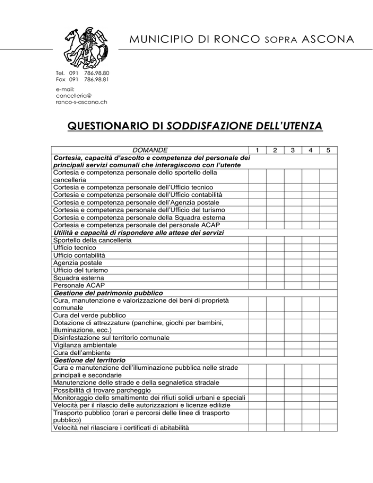 MUNICIPIO DI RONCO SOPRA ASCONA Tel. 091 786.98.80 Fax 091 786.98.81 e-mail: cancelleria@ ronco-s-ascona.ch QUESTIONARIO DI SODDISFAZIONE DELL’UTENZA 1 DOMANDE Cortesia, capacità d’ascolto e competenza del personale dei principali servizi comunali che interagiscono con l’utente Cortesia e competenza personale dello sportello della cancelleria Cortesia e competenza personale dell’Ufficio tecnico Cortesia e competenza personale dell’Ufficio contabilità Cortesia e competenza personale dell’Agenzia postale Cortesia e competenza personale dell’Ufficio del turismo Cortesia e competenza personale della Squadra esterna Cortesia e competenza personale del personale ACAP Utilità e capacità di rispondere alle attese dei servizi Sportello della cancelleria Ufficio tecnico Ufficio contabilità Agenzia postale Ufficio del turismo Squadra esterna Personale ACAP Gestione del patrimonio pubblico Cura, manutenzione e valorizzazione dei beni di proprietà comunale Cura del verde pubblico Dotazione di attrezzature (panchine, giochi per bambini, illuminazione, ecc.) Disinfestazione sul territorio comunale Vigilanza ambientale Cura dell’ambiente Gestione del territorio Cura e manutenzione dell’illuminazione pubblica nelle strade principali e secondarie Manutenzione delle strade e della segnaletica stradale Possibilità di trovare parcheggio Monitoraggio dello smaltimento dei rifiuti solidi urbani e speciali Velocità per il rilascio delle autorizzazioni e licenze edilizie Trasporto pubblico (orari e percorsi delle linee di trasporto pubblico) Velocità nel rilasciare i certificati di abitabilità 2 3 4 5 MUNICIPIO RONCO S. ASCONA Azioni e iniziative per sensibilizzare i cittadini all’utilizzo dei mezzi pubblici Gestione del traffico, parcheggi e viabilità Servizio controllo abitanti Adeguatezza delle informazioni Semplicità nello svolgimento delle pratiche Rapidità con cui si è svolto il servizio Comodità durante l’attesa in fila Pulizia e igiene dei locali Agenzia postale Adeguatezza delle informazioni Semplicità nello svolgimento delle pratiche Rapidità con cui si è svolto il servizio Comodità durante l’attesa in fila Pulizia e igiene dei locali Servizio web comunale Informazioni sui servizi pubblici comunali (orari di apertura, costi, servizi personalizzati…) Informazioni sugli avvenimenti del comune Informazioni sui servizi scolastici del comune Informazioni sui trasporti pubblici del comune Informazioni sugli impianti sportivi del comune Informazioni sulla raccolta differenziata del comune Informazioni sui numeri utili Servizi alla collettività Sviluppo delle attività sportive Sviluppo del tempo libero (corsi, attività ricreative per i minori e per gli adulti) Realizzazione delle attività estive e invernali Istituto scolastico Ronco s. Ascona Scuola elementare Scuola dell’infanzia Mensa scolastica Organizzazione di manifestazioni culturali Sicurezza pubblica Controlli preventivi sul territorio Controlli per la sicurezza stradale Segnaletica stradale Attraversamenti pedonali Fol. 2