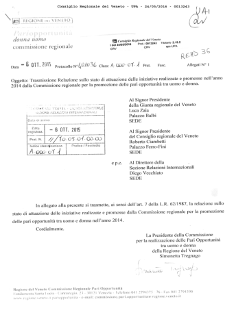 Consiglio Regionale del Veneto - UPA - 24/05/2016 - 0013243 RIGIONt ii VISt 10) donna uomo commissione regionale OTT.2015 Consiglio Regional e del Veneto Titolario 2.19.2 I del 2410512016 Prot.: 0013243 CRV ProtocolloN01.(0.103( Class: A.(1)0- - 6 Data CRVspc-UPA ol-Prat.Fasc.Allegati N° 1 Oggetto: Trasmissione Relazione sullo stato di attuazione delle iniziative realizzate e promosse nell'anno 2014 dalla Commissione regionale per la promozione delle pari opportunità tra uomo e donna. Al Signor Presidente della Giunta regionale del Veneto Luca Zaia Palazzo Balbi SEDE •-••••`. Dat3 d : zrrIvo Data rogistraz. - 6 OTT. 2015 Prol. N. Al Signor Presidente del Consiglio regionale del Veneto Roberto Ciambetti Palazzo Ferro-Fini SEDE 10.05-04-WW Indice class:icazionc, Pratica / Faucicolo 0).-)" e p.c.Al Direttore della Sezione Relazioni Internazionali Diego Vecchiato SEDE 1n allegato alla presente si trasmette, ai sensi dell'art. 7 della L.R. 62/1987, la relazione sullo stato di attuazione delle iniziative realizzate e promosse dalla Commissione regionale per la promozione delle pari opportunità tra uomo e donna nell'anno 2014. Cordialmente. La Presidente della Commissione per la realizzazione delle Pari Opportunità tra uomo e donna della Regione del Veneto Simonetta Tregnago Regione del Venelo tommissione Regionale Pari Opportunita Fondanlenta Sania I ne la - Cannaregio. 23 - 30 I 21 Venelia - elerono 041 2794375 76 - Fax 04 I 2794390 ww‘+, reuione.‘,enelo.a panoppomouta -commissione.pari.opportunitaw regione.veneto.it REGIONE Dit VENI •.....•............. 111111 donna uomo Conlinissione regionale RELAZIONE SULLO STATO DI ATTUAZIONE DELLE INIZIATIVE REALIZZATE E PROMOSSE NELL'ANNO 2014 L.R. 30.121987, n. 62 Commissione per la realizzazione delle Pari Opportumta' tra uomo e donna La Commissione per la realizzazione delle Pari Opportunità tra uomo e donna della Regione del Veneto è istituita - con L.R. 30 dicembre 1987, n. 62 - presso la Giunta regionale ed è organo consultivo della Regione nelle iniziative riguardanti le politiche di genere per l'effettiva attuazione del principio di parità e di pari opportunità sancito dalla Costituzione e dallo Statuto regionale. In data 6 settembre 2011 si è formalmente insediata la Commissione, nominata con Decreto del Presidente della Giunta n. 118 del 1 luglio 2011. Con successivi Decreti del Presidente della Giunta n. 128 del 2.07,2012, n. 149 del 14.08.2012, n. 159 del 30.10.2014 e n. 160 del 30.10.2014 - si è provveduto alla sostituzione delle componenti dimissionarie e alla sostituzione della consigliera di parità regionale nominata con Decreto del Ministero del Lavoro e delle Politiche Sociali del 20 giugno 2012. Il presente rapporto relaziona sulle attività poste in essere dalla Commissione dal 1 gennaio al 31 dicembre 2014. In tale arco temporale sono state avviate e realizzate le inizíative previste dal Programma di attività anno 2013 ed è stato elaborato il Programma di attività anno 2014, approvato dal Consiglio regionale in data 16 dicembre 2014. [Programma anno 2013 La programmazione anno 2013, su stanziamento complessivo di € 50.000,00, prevedeva in sintesi: C 18.000,00 A) INIZIATIVE DI STUDIO E RICERCA € 18.000,00 1. DONNE E TECNOLOGIA C 24.000,00 B) INIZIATIVE DI INFORMAZIONE E DIVULGAZIONE 10.000,00 1, LA COMUNICAZIONE POLI 1CA: tecniche e strumenti € 14.000,00 2. COMUNICAZIONE INTERNA ED ESTERNA 15.000,00 € C) INIZIATIVE IN RETE E CONFRONTO 1, LE POLITICHE DI GENERE IN VENETO: proposte per una nuova normativa di riordino € 0,00 € 8.000,00 D) FUNZIONAMENTO Come sopra evidenziato nel corso del 2014 sono state avviate tutte le iniziative e portate a termine molte delle attività previste dal Programma 2013; di seguito il dettaglio dell'attuazione approvato dalla Giunta regionale con DGR n. 2373/2013. A) INIZIATIVE DI STUDIO E RICERCA 1. DONNE E TECNOLOGIA L'iniziativa si propone un approfondimento delle disparità di genere nell'ambito della forrnazione dell'occupazione nello settore I.C.T. — Information and Communications Technology - già oggetto di un primo studio inserito nel Programma 2010 della Commissione. La prima ricerca "DONNE E TECNOLOGIE INFORMATICHE" venne affidata all'Università Cà Foscari di Venezia, Dipartimento di Scienze Ambientali, Informatica e Statistica, con la supervisione e il coordinamento del prof. Agostino Cortesi. Gli interessanti risultati emersi e i positivi ríscontri raccolti dalla diffusione della ricerca hanno suggerito l'opportunità di un approfondimento, in particolare sulle prospettive occupazionali che l'ICT offre. Le conclusìoni della ricerca avevano infatti evidenziato che le tecnologie informatiche racchiudono un potenziale di crescita e di trasformazione della società che non può non tener conto della parità di genere e, d'altro lato, aveva riscontrato un gender gap accentuato sia in termini formativi che professionali. L'inizìativa, sempre in collaborazione con l'Università Ca' Foscari, prevede di realizzare un intervento mirato di informazione, sensibilizzazione e messa in rete delle opportunità offerte dal settore IC , partendo proprio dai dati precedentemente raccolti e dalle valutazioni emerse e condivise ín Commissione. A luglio del 2014 con la sottoscrizione della lettera contratto si è dato avvio alle attività che si articolano in tre fasi: FASE 1: Progettazione e realizzazione di strumenti web-based per la messa in rete e la diffusione delle diverse iniziative promosse a livello regionale e nazionale che hanno come finalità o effetto la riduzione del gender gap in ambito ICT. In particolare: a. progettazione, realizzazione e messa in esercizio di un síto di tipo social specializzato; ONVEN 1• 1411111t1 ir<11111DiStii,111C 10 ) 2 b. raccolta e messa in linea della documentazione e di strumenti di alimentazione semi-automatica di contenuti; c. realizzazione di una campagna virale su internet di fidelizzazione al social network av
