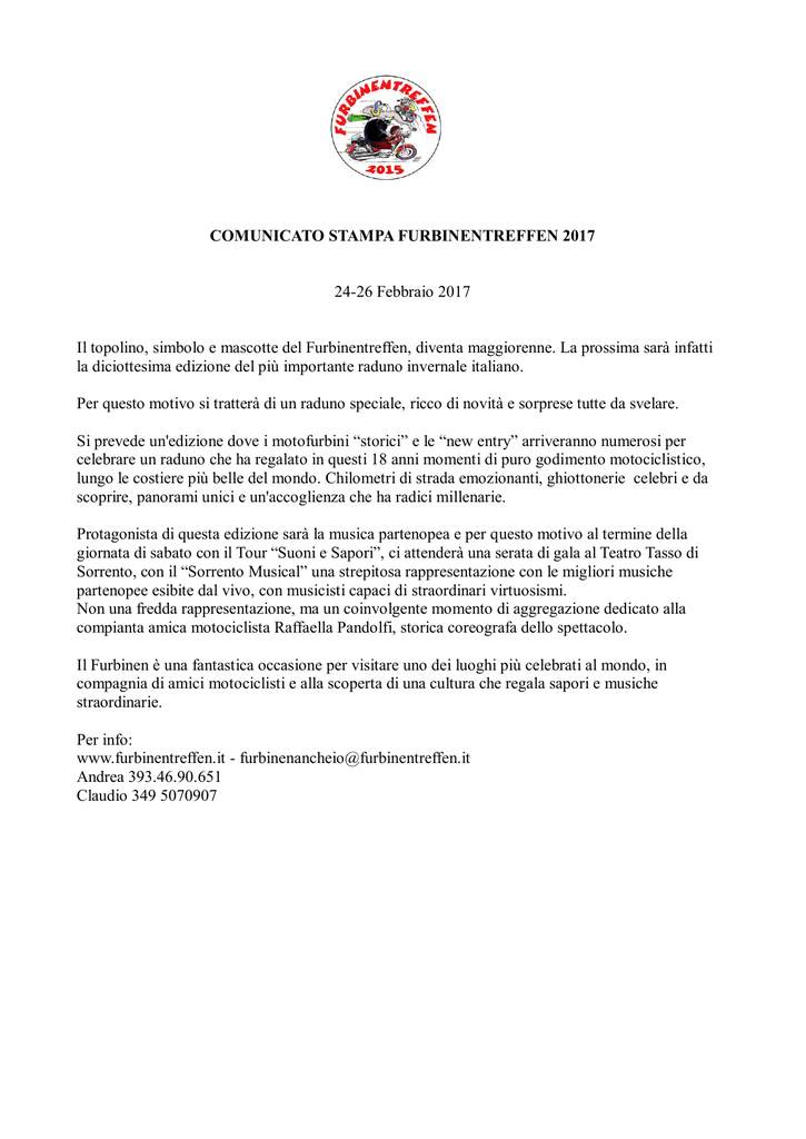 COMUNICATO STAMPA FURBINENTREFFEN 2017 24-26 Febbraio 2017 Il topolino, simbolo e mascotte del Furbinentreffen, diventa maggiorenne. La prossima sarà infatti la diciottesima edizione del più importante raduno invernale italiano. Per questo motivo si tratterà di un raduno speciale, ricco di novità e sorprese tutte da svelare. Si prevede un'edizione dove i motofurbini “storici” e le “new entry” arriveranno numerosi per celebrare un raduno che ha regalato in questi 18 anni momenti di puro godimento motociclistico, lungo le costiere più belle del mondo. Chilometri di strada emozionanti, ghiottonerie celebri e da scoprire, panorami unici e un'accoglienza che ha radici millenarie. Protagonista di questa edizione sarà la musica partenopea e per questo motivo al termine della giornata di sabato con il Tour “Suoni e Sapori”, ci attenderà una serata di gala al Teatro Tasso di Sorrento, con il “Sorrento Musical” una strepitosa rappresentazione con le migliori musiche partenopee esibite dal vivo, con musicisti capaci di straordinari virtuosismi. Non una fredda rappresentazione, ma un coinvolgente momento di aggregazione dedicato alla compianta amica motociclista Raffaella Pandolfi, storica coreografa dello spettacolo. Il Furbinen è una fantastica occasione per visitare uno dei luoghi più celebrati al mondo, in compagnia di amici motociclisti e alla scoperta di una cultura che regala sapori e musiche straordinarie. Per info: www.furbinentreffen.it - [email protected] Andrea 393.46.90.651 Claudio 349 5070907 Programma Venerdì 24 febbraio − Accoglienza dei partecipanti, − Cena con menù degustazione a base di specialità “di terra” abbinate ai migliori vini locali e festa con premi e cotillon Sabato 25 marzo − Accoglienza dei partecipanti con arrivo il sabato, − Partenza del “Rally Suoni e Sapori”, itinerario con road-book in una sorta di caccia al tesoro in moto lungo la Penisola Sorrentina e la Costiera Amalfitana. Un percorso eno-gastronomico e culturale attraverso gli angoli più belli di questa splendida regione, alla scoperta delle sue perle storiche ed artistiche, con assaggi di indimenticabile tipicità, − Cena con menù degustazione a base di specialità “di mare” abbinate ai migliori vini locali, − Serata di Gala al Teatro Tasso (abbigliamento informale) con lo spettacolo Sorrento Musical. Domenica 26 marzo − Colazione, “brunch sorrentino” e arrivederci al Furbinen 2018. Un po' di storia del Furbinentreffen, il raduno invernale per motociclisti gaudenti Il Furbinentreffen viene concepito in una notte da lupi fra un gruppo di amici che attorno a un tavolo stanno preparando … l’ennesima partecipazione al mitico Elefantentreffen! Proprio così: dovevamo necessariamente rischiare il congelamento, avendo come obiettivo finale una pozza di fango e brina nel bel mezzo della gelida Germania, ci siamo a un tratto chiesti perché questo, quando il nostro Bel Paese pullula di splendide mete, motociclisticamente godibilissime nel mite inverno mediterraneo?! Ecco così nascere l’idea di una festosa occasione di incontro per cui si macinano sì chilometri da veri arditi, sfidando le peggiori intemperie, ma con la prospettiva, al traguardo, di godersi un ben meritato premio! E quale premio migliore di una costiera fra le più belle del mondo in cui si inizia già a respirare aria di primavera, che ci offre in esclusiva le sue splendide strade, la sua arte, la sua squisita cucina, l’ospitalità della sua gente?! Il Furbinen si propone come un modello di raduno fondato sull’ozio creativo e sulla civiltà delle due ruote, libero dai deliri della competitività distruttiva e dall’attivismo insensato; il suo programma esibisce una ricca ghirlanda di proposte che intrecciano la moto con la storia, il paesaggio, la gastronomia, accompagnando le giornate mototuristiche dei suoi ospiti senza insidiarne la privacy, predisponendo occasioni di godimento senza imporle, cercando di soddisfare una ampia scala di sottili desideri senza ostacolare intenzionali romantiche escursioni solitarie... La proposta di un raduno tanto insolito ha subito incontrato quella insaziabile sete di nuove amicizie e di nuove avventure che rende assolutamente straordinaria la tribù dei motociclisti, e così - al di là delle più ottimistiche previsioni - la costiera è stata gioiosamente invasa da centinaia di bikers provenienti da tutta Italia e che, infreddoliti ed entusiasti, anno dopo anno, la hanno acclamata a loro Paradiso invernale.