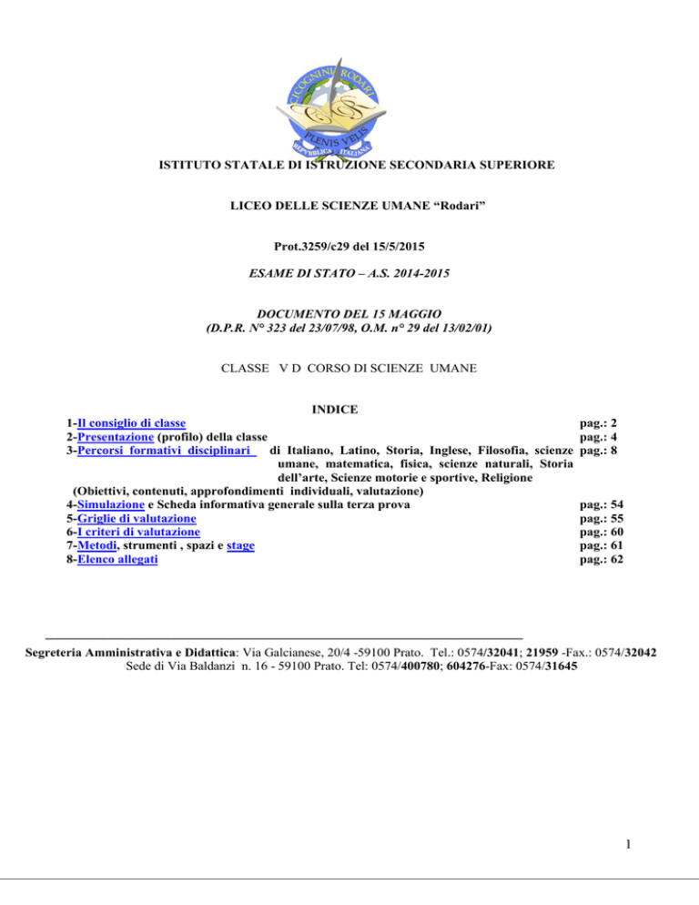 ISTITUTO STATALE DI ISTRUZIONE SECONDARIA SUPERIORE LICEO DELLE SCIENZE UMANE “Rodari” Prot.3259/c29 del 15/5/2015 ESAME DI STATO – A.S. 2014-2015 DOCUMENTO DEL 15 MAGGIO (D.P.R. N° 323 del 23/07/98, O.M. n° 29 del 13/02/01) CLASSE V D CORSO DI SCIENZE UMANE INDICE 1-Il consiglio di classe 2-Presentazione (profilo) della classe 3-Percorsi formativi disciplinari di Italiano, Latino, Storia, Inglese, Filosofia, scienze umane, matematica, fisica, scienze naturali, Storia dell’arte, Scienze motorie e sportive, Religione (Obiettivi, contenuti, approfondimenti individuali, valutazione) 4-Simulazione e Scheda informativa generale sulla terza prova 5-Griglie di valutazione 6-I criteri di valutazione 7-Metodi, strumenti , spazi e stage 8-Elenco allegati pag.: 2 pag.: 4 pag.: 8 pag.: 54 pag.: 55 pag.: 60 pag.: 61 pag.: 62 __________________________________________________________________________ Segreteria Amministrativa e Didattica: Via Galcianese, 20/4 -59100 Prato. Tel.: 0574/32041; 21959 -Fax.: 0574/32042 Sede di Via Baldanzi n. 16 - 59100 Prato. Tel: 0574/400780; 604276-Fax: 0574/31645 1 1. Consiglio di Classe Firma Dirigente Scolastico Mario di Carlo Italiano Elisabetta Cocchi Latino Salomé Palma Storia Maria Stella Giuffrida Lingua Inglese Doriana Fallo Scienze Naturali Tiziana Bucci Filosofia Stefano Berni Scienze Umane Lorenzo Bonacchi Storia dell’Arte Massimiliano Masci Matematica Patrizia Cataldi Educazione Fisica Maria Grazia Biagi Religione ( facoltativo) Angela Baldi Sostegno Vetrone Maria Michela Sostegno Monteleone Miriam Sostegno Ronca Maria Antonella fisica Patrizia Cataldi 2 Schema per continuità o discontinuità didattica Disciplina Classe 3 –Nominativo docente Italiano Mauro Antinarella Latino Salomé Palma Storia Elisabetta Cocchi Lingua Inglese Doriana Fallo Storia dell’Arte Massimiliano Masci Filosofia Stefano Berni Scienze Umane Lorenzo Bonacchi Scienze sportive e motorie Maria Grazia Biagi Matematica Patrizia Cataldi Scienze Naturali Cinquegrana Consiglia Religione ( facoltativo) Angela Baldi Fisica Patrizia Cataldi Classe 4 - Nominativo docente Elisabetta Cocchi Salomé Palma Maria Stella Giuffrida Doriana Fallo Massimiliano Masci Stefano Berni Lorenzo Bonacchi Maria Grazia Biagi Patrizia Cataldi Cinquegrana Consiglia Angela Baldi Patrizia Cataldi 3 2. Profilo della classe La classe ha avuto la continuità didattica negli ultimi tre anni eccetto storia e italiano solo per il primo anno e scienze naturali per i primi due anni. Complessivamente il gruppo ha manifestato buona motivazione e interesse rispetto agli studi affrontati, mostrando un atteggiamento disponibile e collaborativo verso l’insegnante. La classe segue le lezioni di fisica della Prof.ssa Cataldi, in lingua inglese (CLIL). Proseguendo un percorso di approfondimento iniziato gli anni precedenti, la classe ha lavorato sempre con impegno e disciplina. In particolare, l’impegno è stato generalmente costante e ha permesso, nella maggioranza dei casi, di raggiungere risultati pienamente sufficienti. Nonostante ciò, la classe mostra una preparazione tipicamente scolastica senza particolari esigenze di approfondimento e di applicazione delle conoscenze alla realtà circostante. Benché la programmazione sia stata impostata dagli insegnanti nel tentativo di far emergere capacità critiche e autonome, qualche volta emerge solo la finalità strumentale del voto e del risultato, qualche volta anche la competizione tra gli alunni. Risulta così qualche frizione che non ha permesso una socializzazione pienamente vissuta. Per preparare la classe all’esame di Stato, oltre ai colloqui orali, sono state fatte, nel corso dell’anno, varie prove scritte di verifica sul modello delle prove di esame. Gli esiti di tali verifiche, di carattere formativo, hanno evidenziato in alcuni studenti alcune incertezze nella capacità di sintesi, di argomentazione e di sintassi. I programmi preventivati all’inizio dell’anno scolastico sono stati svolti completamente e gli obiettivi fissati sono stati globalmente raggiunti. Le alunne Alfì Michelle, Batignani Virginia e Mugnai Elisa hanno svolto uno stage alternanza scuola lavoro presso l’Archivio di Stato. E’ presente un caso con P.I.S (vedi allegati). 4 Attività integrative svolte dalla classe: Terzo anno: gita in Germania a Treviri teatro la Pergola Apologia di Socrate gita a Roma sulla storia del tessuto nei rapporti tra Italia e Cina Quarto anno: Teatro di Rifredi: Vita di Galileo di Brecht Visita guidata al Museo Galileo di Firenze gita turistica a Venezia scambi culturali Italia Svezia Quinto anno: spettacolo teatrale sulla genetista americana barbara McClintok intervento dell’Usl sulla donazione del sangue e del midollo osseo visita alla scuola montessoriana Carducci di Bologna teatro di Rifredi: Uno nessuno e centomila uscita alla prima del film “Il giovane favoloso” Gita a Dublino scambi culturali Italia Svezia 5 Elenco dei docenti nel triennio Italiano Mauro Antinarella, Elisabetta Cocchi Storia Elisabetta Cocchi Latino Salomé Palma Inglese Doriana Fallo Filosofia Stefano Berni Scienze umane Lorenzo Bonacchi Matematica-fisica Patrizia Cataldi Scienze naturali Cinquegrana Consiglia, Tiziana Bucci Storia dell’arte Massimilano Masci scienze motorie e sportive Maria Grazia Biagi Religione Angela Baldi 6 Elenco Studenti 1 2 3 4 5 6 7 8 9 10 11 12 13 14 15 16 17 18 19 20 21 22 23 24 25 26 Alberghini Camilla Alfì Michelle Astorino Giada Batignani Virginia Benussi Giulia Cavaciocchi Ettore Ciardi Margherita Clericuzio Martina Corrieri Giulio Dreucci Benedetta Fantacci Federica Fiaschi Alessia Lombardi Noemi Martini Giulia Mugnai Elisa Natali Lucia Pancani Caterina Percopo Alyssa Rosa Greta Ruggeri Giulia Saccone Sara Sassoli Simone Scapicchio Michelangelo Sernissi Laura Staffiere Valeria Tozzi Martina 7 3 Percorsi formativi disciplinari 3. 1. Percorso formativo di Italiano 3.1 PERCORSO FORMATIVO DI ITALIANO Obiettivi Conoscenze Conoscenza dei n