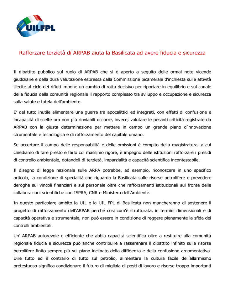 Rafforzare terzietà di ARPAB aiuta la Basilicata ad avere fiducia e sicurezza Il dibattito pubblico sul ruolo di ARPAB che si è aperto a seguito delle ormai note vicende giudiziarie e della dura valutazione espressa dalla Commissione bicamerale d’inchiesta sulle attività illecite al ciclo dei rifiuti impone un cambio di rotta decisivo per riportare in equilibrio e sul canale della fiducia della comunità regionale il rapporto complesso tra sviluppo e occupazione e sicurezza sulla salute e tutela dell’ambiente. E’ del tutto inutile alimentare una guerra tra apocalittici ed integrati, con effetti di confusione e incapacità di scelte ora non più rinviabili occorre, invece, valutare le pesanti criticità registrate da ARPAB con la giusta determinazione per mettere in campo un grande piano d’innovazione strumentale e tecnologica e di rafforzamento del capitale umano. Se accertare il campo delle responsabilità e delle omissioni è compito della magistratura, a cui chiediamo di fare presto e farlo col massimo rigore, è impegno delle istituzioni rafforzare i presidi di controllo ambientale, dotandoli di terzietà, imparzialità e capacità scientifica incontestabile. Il disegno di legge nazionale sulle ARPA potrebbe, ad esempio, riconoscere in uno specifico articolo, la condizione di specialità che riguarda la Basilicata sulle risorse petrolifere e prevedere deroghe sui vincoli finanziari e sul personale oltre che rafforzamenti istituzionali sul fronte delle collaborazioni scientifiche con ISPRA, CNR e Ministero dell’Ambiente. In questo particolare ambito la UIL e la UIL FPL di Basilicata non mancheranno di sostenere il progetto di rafforzamento dell’ARPAB perché così com’è strutturata, in termini dimensionali e di capacità operativa e strumentale, non può essere in condizione di reggere pienamente la sfida dei controlli ambientali. Un’ ARPAB autorevole e efficiente che abbia capacità scientifica oltre a restituire alla comunità regionale fiducia e sicurezza può anche contribuire a rasserenare il dibattito infinito sulle risorse petrolifere finito sempre più sul piano inclinato della diffidenza e della confusione argomentativa. Dire tutto ed il contrario di tutto sul petrolio, alimentare la cultura facile dell’allarmismo pretestuoso significa condizionare il futuro di migliaia di posti di lavoro e risorse troppo importanti per garantire i servizi primari al nostro territorio come la sanità, il welfare, l’istruzione, la ricerca e la forestazione. Insomma occorre saper restituire alla Basilicata un nuovo punto d’equilibrio che non abbia scorciatoie e deroghe su salute e controllo ambientale ma che faccia merito e capacità anche delle opportunità che le risorse rivenienti dal petrolio possono offrire in termini di nuovo sviluppo, di occupazione, di agibilità finanziaria nei bilanci istituzionali. Per questo ben venga che il governo regionale intervenga sul rilancio dell’ARPAB dotandola di quanto serve in termini di risorse finanziarie e professionali aggiuntive, senza le quali questo ente non è in grado di reggere la domanda di controllo e monitoraggio ambientale con così tanti poli sensibili da questo punto di vista (Fenice, Val Basento, Val D’Agri). Dal canto sua la nuova Direzione strategica eviti clamori e corti circuiti, metta mano, invece, subito e con merito alla nuova riorganizzazione aziendale, innanzitutto attraverso l’approvazione del piano triennale di fabbisogno del personale, a partire dalle graduatorie concorsuali vigenti; elabori un adeguato e moderno piano di formazione degli attuali dipendenti, la stragrande maggioranza dotati di ottima professionalità e di abnegazione e sappia, soprattutto, fruttare positivamente le poste finanziarie della Regione dotandosi di strumentazione moderna ed efficiente e di tecnici altamente specializzati. Potenza, 03 maggio 2016 L’Addetto Stampa