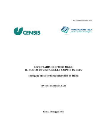 In collaborazione con DIVENTARE GENITORI OGGI: IL PUNTO DI VISTA DELLE COPPIE IN PMA Indagine sulla fertilità/infertilità in Italia SINTESI DEI RISULTATI Roma, 18 maggio 2016 A otto anni di distanza dalla prima ricerca del Censis avente come protagoniste le coppie in PMA, è stato realizzato un nuovo studio volto a indagare la situazione delle coppie che combattono l’infertilità mediante un’indagine su un campione di 361 coppie seguite da 23 centri per il trattamento dell’infertilità ubicati nelle diverse aree territoriali del paese. Tra i mutamenti più significativi nel profilo delle coppie che si sottopongono alla PMA, da segnalare è l’avanzare dell’età del partner maschile (che passa da 37,7 anni nel 2008 a 39,8 anni nel 2016) e femminile (da 35,3 anni a 36,7 anni) e una condizione professionale più stabile per entrambi (tab. 1). Tab. 1 - Età media dei partner, per area geografica (val. medi) Partner Maschile 2016 Partner Femminile 2016 Partner Partner Maschile Femminile diff. 2016-2008 diff. 2016-2008 Nord Centro Sud e Isole 40,1 40,0 38,7 37,2 36,8 35,5 +2,3 +2,1 +1,2 +1,9 +1,2 +0,4 Totale 39,8 36,7 +2,0 +1,4 Fonte: Indagine Censis, 2008 e 2016 Si tratta di coppie che cercano di avere un figlio mediamente da 3,9 anni, un tempo leggermente inferiore a quello rilevato nella ricerca precedente in cui si superavano di poco i 4 anni. I primi dubbi in relazione alla difficoltà di ottenere una gravidanza sono intervenuti dopo 15,5 mesi di tentativi, un tempo più lungo rispetto ai 12,2 mesi di media nel 2008 e sono le donne più giovani a essersi interrogate per prime sulle difficoltà incontrate, mentre per le donne più avanti negli anni sembra essere data per scontata qualche difficoltà in più. Si incrementa, inoltre, il tempo che si lascia trascorrere tra i primi dubbi e la scelta di rivolgersi a un medico (10,9 mesi contro i 9,2 mesi indicati nella precedente indagine). Guardando all’intero percorso, dal primo contatto con il medico al ricorso al primo centro di PMA, si osserva che in media trascorre poco più di un anno (12,7 mesi), circa 6 mesi in meno FONDAZIONE CENSIS 1 rispetto al dato rilevato nel 2008. In ogni caso, anche in quest’ultima indagine rimane confermato che le coppie meno istruite sono arrivate ai centri di PMA dopo un percorso decisamente più lungo rispetto a quelle con un livello di istruzione più alto, dal momento che l’istruzione con tutta probabilità migliora i livelli di conoscenza sul tema, incentivando le coppie a un intervento medico più tempestivo per superare le difficoltà. Il professionista a cui la coppia si è rivolta la prima volta è nella grande parte dei casi il ginecologo (72,5%), il 13,6% indica invece di essersi rivolto direttamente allo specialista di un centro di PMA. Con quote più ridotte, invece, si fa riferimento all’andrologo e/o urologo (6,2%) e al medico di medicina generale (5,8%) (fig. 1). Fig. 1 - Primo professionista a cui la coppia si è rivolta, per livello di istruzione (val. %) 13,1 7,5 3,4 5,8 10,0 Medico di medicina generale 73,0 71,5 Ginecologo 72,5 74,8 74,0 Andrologo/Urologo Specialista del Centro PMA 6,3 6,2 6,3 4,3 4,3 4,3 10,7 2,5 Basso Medio 17,7 13,6 1,1 Alto 1,9 Totale 2016 Altro medico 5,5 7,1 2,6 Totale 2008 Fonte: Indagine Censis, 2008 e 2016 FONDAZIONE CENSIS 2 Da notare che si presenta quasi raddoppiata la quota di coppie che si rivolgono direttamente allo specialista del centro di PMA (il 7,1% nel 2008) e si riduce la percentuale di chi chiama in causa il ginecologo e il medico di medicina generale. Dopo il contatto con il medico ha inizio per la coppia il percorso diagnostico per l’individuazione delle cause dell’infertilità, un iter che non sempre porta al riconoscimento di una condizione clinica come causa specifica di infertilità. Il campione, infatti, è diviso tra gli intervistati ai quali è stato diagnosticato un problema connesso a una causa specifica (55,0%) e la parte restante composta dal 9,7% delle coppie che riconosce la presenza di dubbi del medico su possibili cause (in particolare al Sud e Isole, 19,1%) e dal 35,3% la cui causa di infertilità rimane inspiegata. Rispetto al 2008 si assiste a una diminuzione significativa (circa 9 punti percentuali) delle coppie a cui è stata diagnosticata una causa specifica dell’infertilità (fig. 2). Fig. 2 - Riconoscimento di una condizione clinica specifica come causa dell’infertilità, per area geografica (val. %) 44,9 57,4 55,0 62,5 63,8 Sì No 36,0 36,2 35,3 30,4 29,1 19,1 6,4 7,1 Nord Centro Sud e Isole 9,7 C’è incertezza, ci sono dubbi su più possibili cause 7,1 Totale Totale 2016 2008 Fonte: Indagine Censis, 2008 e 2016 FONDAZIONE CENSIS 1 Che il percorso diagnostico, in alcuni casi, possa rivelarsi lungo e articolato lo si evince anche dal 37,7% di coppie che dichiarano di essersi rivolte a medici diversi prima di individuare la causa dell’infertilità, una percentuale che al Sud e Isole aumenta in maniera consistente (48,8%). Il peso della variabile territoriale, emerso già nello studio precedente, evidenzia dunque un percorso che per le coppie del Sud e Isole non si presenta sempre lineare. Guardando all’esperienza con i centri per la PMA, la scelta della struttura risulta essere dettata da diversi criteri tra i quali spicca la fama per gli ottimi risultati della struttura, che rappresenta il criterio principalmente seguito dalle coppie (38,6%), in particolare al Centro Italia (42,9%) e tra i rispondenti con livelli alti di istruzione (45,1%). Inoltre, il 18,9% riconosce di aver scelto il centro perché vicino alla propria abitazione e con percentuali più ridotte si fa riferimento anche al parere ottenuto da altre coppie in cura presso il centro scelto, alla presenza nella struttura del proprio medico curante e alla dotazione tecnologica più adeguata. In base alla tipologia di centro scelto, si osserva che, tra le coppie in carico presso centri pubblici, la quota più ampia e pari al 31,2% moti
