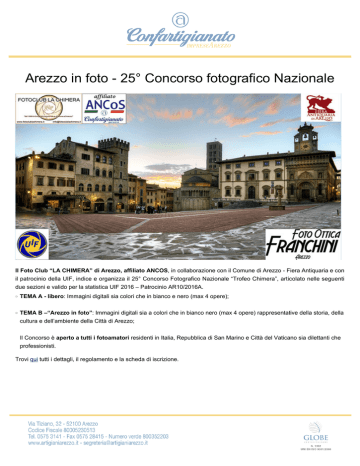 Arezzo in foto - 25° Concorso fotografico Nazionale Il Foto Club “LA CHIMERA” di Arezzo, affiliato ANCOS, in collaborazione con il Comune di Arezzo - Fiera Antiquaria e con il patrocinio della UIF, indice e organizza il 25° Concorso Fotografico Nazionale “Trofeo Chimera”, articolato nelle seguenti due sezioni e valido per la statistica UIF 2016 – Patrocinio AR10/2016A. ❍ TEMA A - libero: Immagini digitali sia colori che in bianco e nero (max 4 opere); ❍ TEMA B –“Arezzo in foto”: Immagini digitali sia a colori che in bianco nero (max 4 opere) rappresentative della storia, della cultura e dell’ambiente della Città di Arezzo; Il Concorso è aperto a tutti i fotoamatori residenti in Italia, Repubblica di San Marino e Città del Vaticano sia dilettanti che professionisti. Trovi qui tutti i dettagli, il regolamento e la scheda di iscrizione.