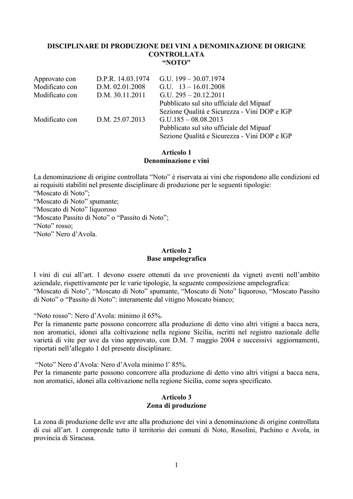 DISCIPLINARE DI PRODUZIONE DEI VINI A DENOMINAZIONE DI ORIGINE CONTROLLATA “NOTO” Approvato con Modificato con Modificato con D.P.R. 14.03.1974 D.M. 02.01.2008 D.M. 30.11.2011 Modificato con D.M. 25.07.2013 G.U. 199 – 30.07.1974 G.U. 13 – 16.01.2008 G.U. 295 – 20.12.2011 Pubblicato sul sito ufficiale del Mipaaf Sezione Qualità e Sicurezza - Vini DOP e IGP G.U.185 – 08.08.2013 Pubblicato sul sito ufficiale del Mipaaf Sezione Qualità e Sicurezza - Vini DOP e IGP Articolo 1 Denominazione e vini La denominazione di origine controllata “Noto” è riservata ai vini che rispondono alle condizioni ed ai requisiti stabiliti nel presente disciplinare di produzione per le seguenti tipologie: “Moscato di Noto”; “Moscato di Noto” spumante; “Moscato di Noto” liquoroso “Moscato Passito di Noto” o “Passito di Noto”; “Noto” rosso; “Noto” Nero d’Avola. Articolo 2 Base ampelografica I vini di cui all’art. 1 devono essere ottenuti da uve provenienti da vigneti aventi nell’ambito aziendale, rispettivamente per le varie tipologie, la seguente composizione ampelografica: “Moscato di Noto”, “Moscato di Noto” spumante, “Moscato di Noto” liquoroso, “Moscato Passito di Noto” o “Passito di Noto”: interamente dal vitigno Moscato bianco; “Noto rosso”: Nero d’Avola: minimo il 65%. Per la rimanente parte possono concorrere alla produzione di detto vino altri vitigni a bacca nera, non aromatici, idonei alla coltivazione nella regione Sicilia, iscritti nel registro nazionale delle varietà di vite per uve da vino approvato, con D.M. 7 maggio 2004 e successivi aggiornamenti, riportati nell’allegato 1 del presente disciplinare. “Noto” Nero d’Avola: Nero d’Avola minimo l’ 85%. Per la rimanente parte possono concorrere alla produzione di detto vino altri vitigni a bacca nera, non aromatici, idonei alla coltivazione nella regione Sicilia, come sopra specificato. Articolo 3 Zona di produzione La zona di produzione delle uve atte alla produzione dei vini a denominazione di origine controllata di cui all’art. 1 comprende tutto il territorio dei comuni di Noto, Rosolini, Pachino e Avola, in provincia di Siracusa. 1 Articolo 4 Norme per la viticoltura Le condizioni ambientali e di coltivazione dei vigneti destinati alla produzione dei vini di cui all’art. 1 devono essere quelle tradizionali della zona e comunque atte a conferire al vino le specifiche caratteristiche di qualità. Le forme di allevamento, i sesti di impianto e i sistemi di potatura devono essere quelli generalmente usati o comunque atti a non modificare le caratteristiche delle uve e dei vini. I vigneti impiantati successivamente all’entrata in vigore del presente disciplinare devono essere ad alberello o a controspalliera con una densità minima di 4.000 piante per ettaro per le tipologie rosse e 3.500 per il Moscato. E’ vietata ogni pratica di forzatura. E’ consentita l’irrigazione di soccorso. La produzione massima di uva per ettaro in coltura specializzata e il titolo alcolometrico volumico naturale minimo devono essere i seguenti: Tipologia Produzione uva t/ha “Moscato di Noto” “Moscato di Noto” Spumante “Moscato di Noto” Liquoroso “Moscato Passito di Noto” o “Passito di Noto” “Noto” rosso “Noto” Nero d’Avola 12,5 12,5 12,5 12,5 12 11 Titolo alcol. volum. nat. min. % vol. 11 11 13 12 12 12,5 A detti limiti, anche in annate eccezionalmente favorevoli, la resa di uva per ettaro dovrà essere riportata purché la produzione non superi il 20%. Qualora venga superato anche tale limite tutta la produzione perde il diritto alla denominazione di origine. Per i vigneti a coltura promiscua la produzione massima per ettaro deve essere calcolata in rapporto alla effettiva superficie coperta dalla vite. Articolo 5 Norme per la vinificazione Le operazioni di vinificazione, ivi compresi l’alcolizzazione dei vini liquorosi e l’eventuale affinamento, devono essere effettuate all’interno del territorio dei comuni compresi nella zona di produzione di cui all’art. 3 del presente disciplinare. Per tutte le tipologie è consentito tuttavia che tali operazioni siano effettuate in cantine situate fuori dal territorio della zona di produzione delle uve di cui all’art. 3 purché all’interno della provincia di Siracusa e all’interno del territorio del comune di Ispica (Ragusa). Nella vinificazione sono ammesse soltanto le pratiche enologiche leali e costanti, tradizionali della zona, atte a conferire ai vini le loro peculiari caratteristiche. E’ consentito l’arricchimento dei mosti e dei vini di cui all’art. 1 nei limiti stabiliti dalle norme nazionali e comunitarie, con mosti concentrati ottenuti da uve dei vigneti iscritti allo schedario della stessa denominazione di origine controllata oppure con mosto concentrato rettificato o a mezzo concentrazione a freddo o altre tecnologie consentite. 2 Le diverse tipologie previste dall’art. 1 devono essere elaborate in conformità delle norme comunitarie e nazionali. La tipologia “Moscato Passito di Noto” o “Passito di Noto” deve essere ottenuta con l’appassimento delle uve sulla pianta o dopo la raccolta, con uno dei metodi ammessi dalla vigente normativa. Per la tipologia “Moscato di Noto” liquoroso la fermentazione si protrae fino ad ottenere un titolo alcolometrico volumico effettivo di 6,50% vol dopo di che si può procedere all’aggiunta di alcole da vino e/o acquavite di vino. Il prodotto ottenuto non potrà essere immesso al consumo prima dei 5 mesi a partire da quando è stato alcolizzato. Le rese massime dell’uva in vino e del vino per ettaro, compresa l’eventuale aggiunta correttiva, comprese altresì le aggiunte occorrenti per l’elaborazione del tipo liquoroso, devono essere le seguenti: Resa Prod. max uva/vino vino hl/ha “Moscato di Noto” 70% 87,5 “Moscato di Noto” Spumante 70% 87,5 “Moscato di Noto” Liquoroso 70% 87,5 “Moscato Passito di Noto” 
