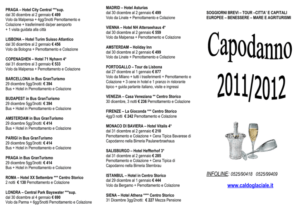 PRAGA – Hotel City Central ***sup. dal 30 dicembre al 2 gennaio € 499 Volo da Malpensa + 4gg/3notti Pernottamento e Colazione + trasferimenti da/per aeroporto + 1 visita guidata alla città LISBONA – Hotel Turim Suisso Atlantico dal 30 dicembre al 2 gennaio € 456 Volo da Bologna + Pernottamento e Colazione COPENAGHEN – Hotel 71 Nyhavn 4* dal 31 dicembre al 3 gennaio € 533 Volo da Malpensa + Pernottamento e Colazione BARCELLONA in Bus GranTurismo 29 dicembre 5gg/3notti: € 394 Bus + Hotel in Pernottamento e Colazione BUDAPEST in Bus GranTurismo 29 dicembre 5gg/3notti: € 394 Bus + Hotel in Pernottamento e Colazione AMSTERDAM in Bus GranTurismo 29 dicembre 5gg/3notti: € 414 Bus + Hotel in Pernottamento e Colazione PARIGI in Bus GranTurismo 29 dicembre 5gg/3notti: € 414 Bus + Hotel in Pernottamento e Colazione PRAGA in Bus GranTurismo 29 dicembre 5gg/3notti: € 414 Bus + Hotel in Pernottamento e Colazione MADRID – Hotel Asturias dal 30 dicembre al 2 gennaio € 499 Volo da Linate + Pernottamento e Colazione SOGGIORNI BREVI – TOUR –CITTA’ E CAPITALI EUROPEE – BENESSERE – MARE E AGRITURISMI VIENNA – Hotel NH Atterseehaus 4* dal 30 dicembre al 2 gennaio € 559 Volo da Malpensa + Pernottamento e Colazione AMSTERDAM – Holiday Inn dal 30 dicembre al 2 gennaio € 499 Volo da Linate + Pernottamento e Colazione PORTOGALLO – Tour da Lisbona dal 27 dicembre al 1 gennaio € 877 Volo da Milano + tutti i trasferimenti + Pernottamento e Colazione + 3 cene in hotel e 1 pranzo in ristorante tipico + guida parlante italiano, visite e ingressi VENEZIA – Casa Veneziana ** Centro Storico 30 dicembre, 3 notti € 236 Pernottamento e Colazione FIRENZE – La Gioconda *** Centro Storico 4gg/3 notti € 242 Pernottamento e Colazione MONACO DI BAVIERA – Hotel Vitalis 4* dal 31 dicembre al 2 gennaio € 210 Pernottamento e Colazione + Cena Tipica Bavarese di Capodanno nella Birreria Paulanerbraehaus SALISBURGO – Hotel Heffterhof 3* dal 31 dicembre al 2 gennaio € 285 Pernottamento e Colazione + Cena Tipica di Capodanno nella Birreria Sternbrau ROMA – Hotel XX Settembre *** Centro Storico 2 notti € 130 Pernottamento e Colazione ISTANBUL – Hotel in Centro Storico dal 29 dicembre al 1 gennaio € 444 Volo da Bergamo + Pernottamento e Colazione LONDRA – Central Park Bayswater ***sup. dal 30 dicembre al 4 gennaio € 690 Volo da Parma + 6gg/5notti Pernottamento e Colazione SIENA – Hotel Athena **** Centro Storico 31 Dicembre 3gg/2notti: € 227 Mezza Pensione INFOLINE: 0525/90418 0525/99409 www.caldoglaciale.it ROMANIA – Tour in pensione completa dal 30 dicembre al 2 gennaio € 625 Volo da Rimini + tutti i trasferimenti + hotel 3 stelle + guida parlante italiano, visite e ingressi PUGLIA - Tour Matera,Alberobello,Lecce,Cerrate dal 30 dicembre al 2 gennaio € 750 Bus + Pensione Completa con Bevande + Hotel 4 Stelle + guida locale + Cenone con Veglione MAROCCO – Tour delle Città Imperiali dal 31 dicembre 8gg/7notti Mezza Pensione: € 980 Volo da Malpensa o Bologna + tutti i trasferimenti Hotel ¾* + guida parlante italiano, visite e ingressi MAROCCO – Marrakech con Tour dal 29 dicembre 4gg/3notti hotel 4 stelle: € 966 Volo da Malpensa o Bologna + tutti i trasferimenti + Cenone di Capodanno + guida parlante italiano TUNISIA – Hammamet All Inclusive 4* dal 30 dicembre 4gg/3notti Hotel Miramar: € 409 Volo da Malpensa + tutti i trasferimenti PELLEGRINAGGIO in TERRA SANTA dal 26 dicembre 8gg/7notti hotel 4 stelle: € 1473 Volo da Malpensa + tutti i trasferimenti + Radio guida con auricolare e ingressi come da programma SALERNO – Luci d’Artista Concorso Fotografico Dal 30 dicembre 4gg/3notti hotel 3 stelle: € 389 Volo da Malpensa + Pernottamento e colazione + 1 cena tipica + partecipazione Gratis al Concorso ISCHIA – Terme Gran Paradiso **** 3 notti € 349, 4 notti € 399, 5 notti € 449 Mezza Pensione + Cenone con Spumante + Sauna,Bagno Turco + 1 Maschera al Fango ISCHIA – Grand Hotel Terme di Augusto ***** 4 notti € 544 , 7 notti € 859, Pensione Completa + Cenone/Veglione +Terme+Sauna, Bagno Turco, Percorso Kneipp + Prova Benessere a Scelta NEVE – FRIULI – Forni di Sopra Hotel i Larici 4* 30 dicembre, 4gg/3 notti: Mezza Pensione: € 295 Cenone di Capodanno € 60 in loco Toscana, VAL D’ELSA – Capodanno in Villa 2 notti in mezza pensione + cenone di san silvestro + brunch del 1 gennaio: € 234 Toscana, Capodanno Agriturismo nel Chianti 2 notti in mezza pensione + cenone di san silvestro con bevande + Aperitivo con Vini, Cena/ Degustazione Prodotti Tipici della Fattoria: € 278 NEVE, MAZZIN DI FASSA – Hotel Alpen Rose *** 5gg/4 notti € 434 Mezza Pensione + Cenone Toscana, Capodanno Medievale in Fattoria 1 notte + cena medievale con festa + prima colazione + visita percorso storico fattoria: € 165 NEVE, PASSO DEL TONALE – Hotel Pian di Neve *** 5gg/4 notti € 519 Pensione Completa con Bevande + Cenone con musica Toscana, VOLTERRA Capodanno in Caseificio 3 notti + mezza pensione + cenone di fine anno con musica dal vivo: € 340 NEVE, SKI AREA PAGANELLA, a Molveno Hotel 3* 29 Dicembre 4 notti € 368 Mezza Pensione +Cenone + SkiBus Gratuito per gli impianti di Andalo Toscana, PESCIA Capodanno da Pinocchio 2 notti in agriturismo ex cartiera in pernottamento e colazione + cenone di fine anno con bevande e animazione + 1 cena senza bevande: € 249 NEVE, FOLGARIDA – MirtilloRosso App.(sulle piste) Dal 26 dicembre 7 notti € 287,50 (base 4 pax) NEVE, TRENTO – Bondone/Levico 15Km Hotel Albermonaco *** 3gg/2notti in pernottamento e colazione + centro salus + cena di Fine Anno: € 212 Toscana, MONTALCINO Capodanno col Brunello 3 notti in b&b + cenone + 2 cene in ristorante + degustazione in cantina storica: € 285 Le quote sono: TUTTE PER PERSONA IN CAMERA DOPPIA NEVE, VAL DI NON – Hotel Punto Verde *** 4gg/3notti in pernottamento e colazione + festa fine anno sulle piste: € 232 NEVE, MERANO – Hotel Wiesenhof **** 5g