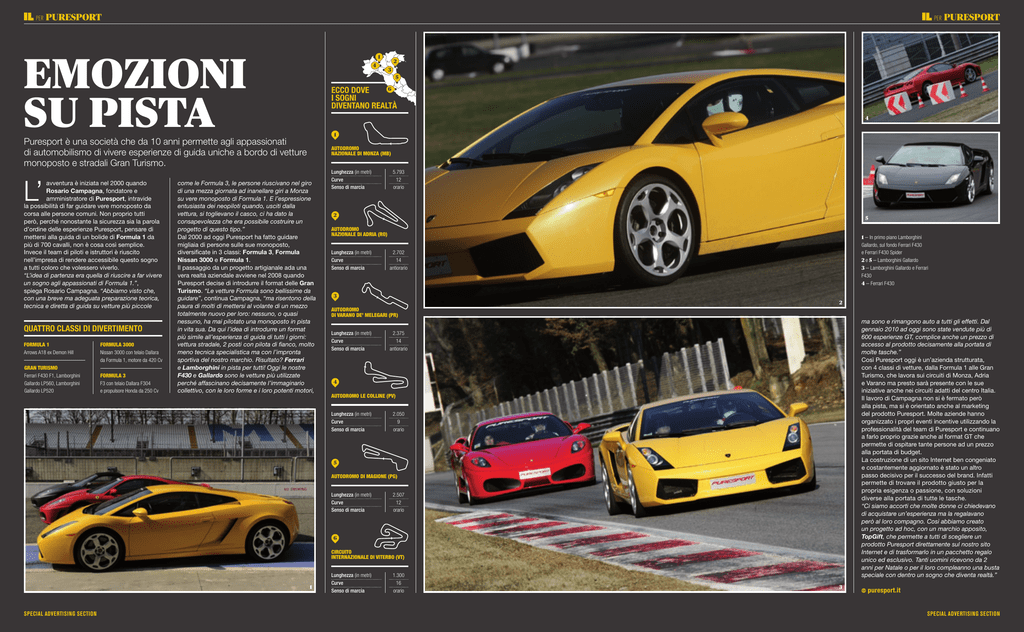 per PURESPORT per emozioni su pista 1 4 L’ quattro classi di divertimento FORMULA 1 Arrows A18 ex Demon Hill GRAN TURISMO Ferrari F430 F1, Lamborghini Gallardo LP560, Lamborghini Gallardo LP520 formula 3000 Nissan 3000 con telaio Dallara da Formula 1, motore da 420 Cv FORMULA 3 F3 con telaio Dallara F304 e propulsore Honda da 250 Cv 2 3 5 6 ecco dove i sogni diventano realtà 4 1 Puresport è una società che da 10 anni permette agli appassionati di automobilismo di vivere esperienze di guida uniche a bordo di vetture monoposto e stradali Gran Turismo. avventura è iniziata nel 2000 quando Rosario Campagna, fondatore e amministratore di Puresport, intravide la possibilità di far guidare vere monoposto da corsa alle persone comuni. Non proprio tutti però, perché nonostante la sicurezza sia la parola d’ordine delle esperienze Puresport, pensare di mettersi alla guida di un bolide di Formula 1 da più di 700 cavalli, non è cosa così semplice. Invece il team di piloti e istruttori è riuscito nell’impresa di rendere accessibile questo sogno a tutti coloro che volessero viverlo. “L’idea di partenza era quella di riuscire a far vivere un sogno agli appassionati di Formula 1.”, spiega Rosario Campagna. “Abbiamo visto che, con una breve ma adeguata preparazione teorica, tecnica e diretta di guida su vetture più piccole AUTODROMO NAZIONALE di MONZA (mB) come le Formula 3, le persone riuscivano nel giro di una mezza giornata ad inanellare giri a Monza su vere monoposto di Formula 1. E l’espressione entusiasta dei neopiloti quando, usciti dalla vettura, si toglievano il casco, ci ha dato la consapevolezza che era possibile costruire un progetto di questo tipo.” Dal 2000 ad oggi Puresport ha fatto guidare migliaia di persone sulle sue monoposto, diversificate in 3 classi: Formula 3, Formula Nissan 3000 e Formula 1. Il passaggio da un progetto artigianale ada una vera realtà aziendale avviene nel 2008 quando Puresport decise di introdurre il format delle Gran Turismo. “Le vetture Formula sono bellissime da guidare”, continua Campagna, “ma risentono della paura di molti di mettersi al volante di un mezzo totalmente nuovo per loro: nessuno, o quasi nessuno, ha mai pilotato una monoposto in pista in vita sua. Da qui l’idea di introdurre un format più simile all’esperienza di guida di tutti i giorni: vettura stradale, 2 posti con pilota di fianco, molto meno tecnica specialistica ma con l’impronta sportiva del nostro marchio. Risultato? Ferrari e Lamborghini in pista per tutti! Oggi le nostre F430 e Gallardo sono le vetture più utilizzate perché affascinano decisamente l’immaginario collettivo, con le loro forme e i loro potenti motori, Lunghezza (in metri) Curve Senso di marcia 5.793 12 orario 2 5 AUTODROMO NAZIONALE DI ADRIA (Ro) Lunghezza (in metri) Curve Senso di marcia 1 — In primo piano Lamborghini Gallardo, sul fondo Ferrari F430 e Ferrari F430 Spider 2 e 5 — Lamborghini Gallardo 3 — Lamborghini Gallardo e Ferrari F430 4 — Ferrari F430 2.702 14 antiorario 3 2 AUTODROMO di VARANO DE’ MELEGARI (PR) Lunghezza (in metri) Curve Senso di marcia ma sono e rimangono auto a tutti gli effetti. Dal gennaio 2010 ad oggi sono state vendute più di 600 esperienze GT, complice anche un prezzo di accesso al prodotto decisamente alla portata di molte tasche.” Così Puresport oggi è un’azienda strutturata, con 4 classi di vetture, dalla Formula 1 alle Gran Turismo, che lavora sui circuiti di Monza, Adria e Varano ma presto sarà presente con le sue iniziative anche nei circuiti adatti del centro Italia. Il lavoro di Campagna non si è fermato però alla pista, ma si è orientato anche al marketing del prodotto Puresport. Molte aziende hanno organizzato i propri eventi incentive utilizzando la professionalità del team di Puresport e continuano a farlo proprio grazie anche al format GT che permette di ospitare tante persone ad un prezzo alla portata di budget. La costruzione di un sito Internet ben congeniato e costantemente aggiornato è stato un altro passo decisivo per il successo del brand. Infatti permette di trovare il prodotto giusto per la propria esigenza o passione, con soluzioni diverse alla portata di tutte le tasche. “Ci siamo accorti che molte donne ci chiedevano di acquistare un’esperienza ma la regalavano però al loro compagno. Così abbiamo creato un progetto ad hoc, con un marchio apposito, TopGift, che permette a tutti di scegliere un prodotto Puresport direttamente sul nostro sito Internet e di trasformarlo in un pacchetto regalo unico ed esclusivo. Tanti uomini ricevono da 2 anni per Natale o per il loro compleanno una busta speciale con dentro un sogno che diventa realtà.” 2.375 14 antiorario 4 AUTODROMO LE COLLINE (PV) Lunghezza (in metri) Curve Senso di marcia 2.050 9 orario 5 Autodromo di Magione (pg) Lunghezza (in metri) Curve Senso di marcia 2.507 12 orario 6 Circuito Internazionale di Viterbo (VT) 1 SPECIAL ADVERTISING SECTION PURESPORT Lunghezza (in metri) Curve Senso di marcia 1.300 16 orario 3 puresport.it SPECIAL ADVERTISING SECTION