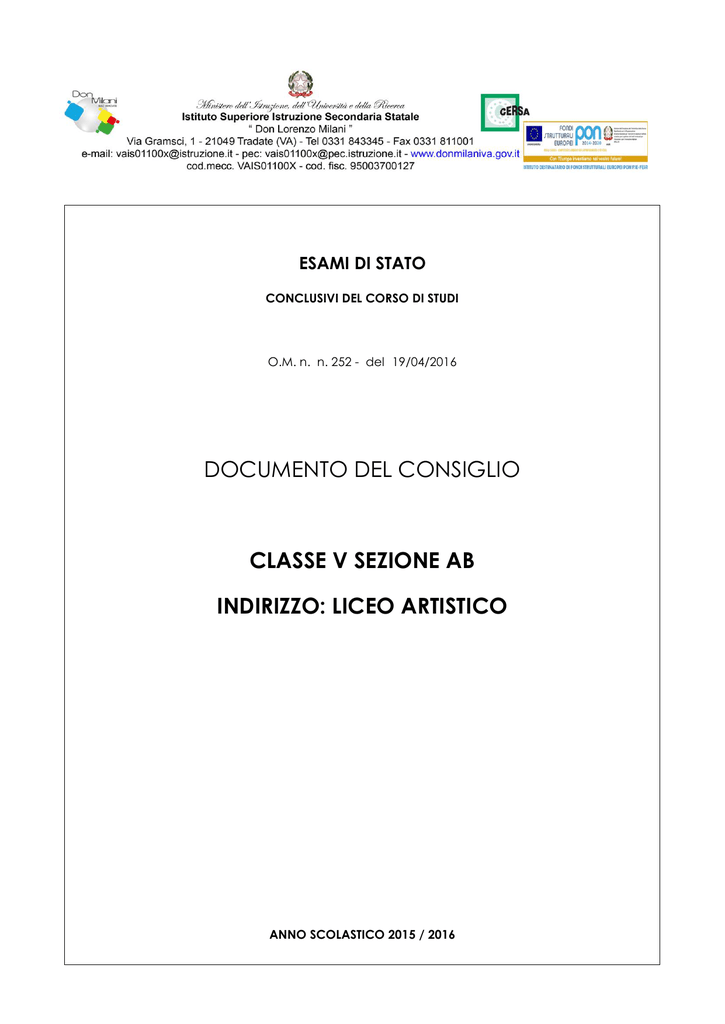 ESAMI DI STATO CONCLUSIVI DEL CORSO DI STUDI O.M. n. n. 252 - del 19/04/2016 DOCUMENTO DEL CONSIGLIO CLASSE V SEZIONE AB INDIRIZZO: LICEO ARTISTICO ANNO SCOLASTICO 2015 / 2016 INDICE 1) Presentazione dell’Istituto ……………………………………………………………………………… Pag. 3 2) Presentazione della classe …………………………………………………………………………….. Pag. 5 a) b) c) d) e) La classe: candidati interni ……………………………………………………………………… Docenti del Consiglio di Classe …………………………………………………………………. Storia della classe e sua evoluzione ……………………………………………………………. Quadri orario ………………………………………………………………………………………... Profilo complessivo della classe ………………………………………………………………... Pag. 5 Pag. 5 Pag. 6 Pag. 6 Pag. 7 3) Profilo in uscita ……………………………………………………………………………………………. Pag. 9 a) b) c) d) Metodologie adottate ……………………………………………………………………………. Attività di recupero, di integrazione, di approfondimento ……………………………….. Strumenti di verifica ……………………………………………………………………………….. Criteri di valutazione deliberati dal Consiglio di classe …………………………………….. Pag. 9 Pag. 9 Pag. 10 Pag. 10 4) Attività extracurriculari e progetti educativi particolari ………………………………………….. Pag. 11 5) Simulazioni prove d’esame ……………………………………………………………………………. Pag. 13 6) Progetto di "Alternanza Scuola-Lavoro" ……………………………………………………………... Pag. 14 Allegato A : Relazioni finali dei docenti e programmi effettivamente svolti delle singole discipline……….. Pag. 16 Allegato B: Testi delle simulazioni dell’Esame di Stato con relative griglie di valutazione ………………… Pag. 50 Allegato D: Documenti alunni con sostegno (in busta chiusa) 2 1) PRESENTAZIONE DELL’ISTITUTO a) LA STORIA Il nostro Istituto nasce come sezione staccata per ragionieri e geometri dell’ITCG “Daverio” di Varese e acquisisce l’autonomia nel 1982. Nel 1984 viene intitolato a Don Lorenzo Milani, educatore rigoroso e maestro di vita. Nell’anno scolastico 2000/2001 viene istituito l’indirizzo professionale per operatori della gestione aziendale e turistica e per grafici professionali. Nel dicembre 2003 acquisisce la Certificazione di Qualità UNI ISO 9001:2000. Nel gennaio 2007 la sezione professionale grafico trova la sua sede definitiva a Venegono Inferiore. Il 2010 è l’anno di avvio della “Riforma Gelmini” della scuola superiore che, distinguendo in indirizzi Liceali, Tecnici, Tecnologici e Professionali, per il nostro istituto ha comportato le scelte di rinunciare ai corsi professionali e di inserire gli indirizzi di Liceo artistico “Audiovisivo”, “Multimediale/Grafica”, presso la sede di Venegono, e di introdurre gli indirizzi tecnici “Tecnologico: Grafica e Comunicazione”, “Tecnologico: Costruzioni, Ambienti e Territorio” e “Tecnico Economico: Amministrazione, Finanza e Marketing”. Nell’anno scolastico 2012/2013, la sezione del Liceo artistico viene integrata da un altro indirizzo di studi “Architettura e ambiente”. Nell’anno scolastico 2015/2016 è stata approvata l’attivazione dell’indirizzo “Figurativo”. b) INDIRIZZI La classe VAB Liceo è articolata in due indirizzi. Gli studenti hanno seguito le materie di area comune congiuntamente, dividendosi in due gruppi nelle ore delle discipline d’indirizzo, caratterizzanti ciascun percorso di apprendimento. INDIRIZZO: LICEO ARTISTICO: AUDIOVISIVO E MULTIMEDIALE Gli studenti, a conclusione del percorso di studi, dovranno: avere approfondito la conoscenza degli elementi costitutivi dei linguaggi audiovisivi e multimediali negli aspetti espressivi e comunicativi, avere consapevolezza dei fondamenti storici e concettuali; conoscere le principali linee di sviluppo tecniche e concettuali delle opere audiovisive contemporanee e le intersezioni con le altre forme di espressione e comunicazione artistica; conoscere e applicare le tecniche adeguate nei processi operativi, avere capacità procedurali in funzione della “contaminazione” tra le tradizionali specificazioni disciplinari; conoscere e sapere applicare i principi della percezione visiva e della composizione dell’immagine. Sbocchi professionali: Il diplomato Potrà inserirsi nel mondo del lavoro nell’area dei servizi collegati alla comunicazione pubblicitaria. Potrà accedere a tutti gli indirizzi di studi universitari, in particolare: architettura, accademia di belle arti, istituto superiore di design, l’ISIA (Istituto Superiore per le Industrie Artistiche), il DAMS (discipline arte musica e spettacolo) o una delle numerose istituzioni private che offrono corsi di fotografia, video, animazione e grafica. 3 LICEO ARTISTICO: GRAFICA Gli studenti, a conclusione del percorso di studi, dovranno: conoscere gli elementi costitutivi dei codici dei linguaggi progettuali e grafici; avere consapevolezza delle radici storiche e delle linee di sviluppo nei vari ambiti della produzione grafica e pubblicitaria; conoscere e applicare le tecniche grafico-pittoriche e informatiche adeguate nei processi operativi; saper individuare le corrette procedure di approccio nel rapporto progetto- prodotto contesto, nelle diverse funzioni relative alla comunicazione visiva e editoriale; Saper identificare e usare tecniche e tecnologie adeguate alla progettazione e produzione grafica; Conoscere e sapere applicare i principi della perc