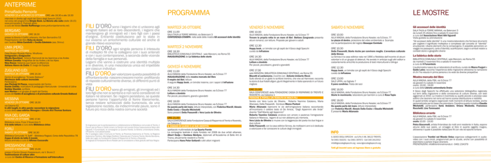 ANTEPRIME PROGRAMMA PrimaRadio Piemonte VENERDÌ 15 e VENERDÌ 22 OTTOBRE ORE: alle 18.30 e alle 19.30 interviste in diretta agli ospiti del Gioco degli Specchi 2010 nel corso del programma Simply Book. La libreria alla radio (dalle 18.15) www.primaradio.it. Podcast attivo a cura del libraio Davide Ruffinengo (www.profumiperlamente.net) BERGAMO GIOVEDÌ 21 OTTOBRE ORE 18.30 presso la libreria Il Caffè Letterario, Via San Bernardino 53 Presentazione del libro Roba da donne con l’autrice Silvia Camilotti e Cecilia Edelstein (ass. Shinui) LIMA (PERÙ) MARTEDÌ 26 OTTOBRE Casa Museo Ricardo Palma. Miraflores Inmigración y Emigración Mirella Bacchioni: Antonio Raimondi de los Apeninos a los Andes William Zanatta: fotografías de los Andes y de los Alpes Nino Rocco: Italianos que hacen la diferencia Adriana Alarco de Zadra: El Juego de Espejos ZUGLIANO (UD) MARTEDÌ 26 OTTOBRE ORE 20.30 Centro di accoglienza “Ernesto Balducci” RIcchezza delle culture incrociate Partecipano: don Pierluigi Di Piazza, responsabile del Centro Davide Zoletto, ricercatore di pedagogia intercuturale - Università di Udine Božidar Stanišić, scrittore suor Marina e un gruppo di ospiti del Centro a cura del Centro di accoglienza e di promozione culturale Ernesto Balducci MESSINA VENERDÌ 29 OTTOBRE ORE 18.30 via Catania 62 In altri luoghi, in altre parole: raccontare la migrazione a cura della casa editrice Mesogea e Circolo Arci Thomas Sankara FILI D’ORO sono i legami che ci uniscono agli emigrati italiani ed ai loro discendenti, i legami che mantengono gli immigrati ed i loro figli con i paesi d’origine. Entrambi costituiscono per lo stato in cui viviamo un arricchimento culturale ed anche di grande rilievo economico FILI D’ORO ogni singola persona è intessuta di molteplici fili che la collegano con i suoi antenati e con i suoi contemporanei, a seconda delle vicende della famiglia e sue personali. Legami che vanno a costruire una identità multipla e in divenire, in una mescolanza unica ed irripetibile per ciascun individuo FILI D’ORO per valorizzare questa possibilità di affrontare la vita - nascere crescere morire - profittando di risposte culturalmente diverse, di differenti punti di vista FILI D’ORO sono gli emigrati, gli immigrati ed i loro figli che non si sentono e non sono considerati né italiani né stranieri. Se i legami persistono, se queste persone hanno l’opportunità di fiorire liberamente, senza restare schiacciati dalla burocrazia, da una legislazione razzista, da indiscriminate paure, sono il futuro più ricco della nostra comune società RIVA DEL GARDA Biblioteca civica, P.zza 3 Novembre 5 Il tè delle letture a cura della Biblioteca civica FORLÌ SABATO 30 OTTOBRE ORE 16.30 Biblioteca Comunale “A. Saffi” - Biblioteca Ragazzi, Corso della Repubblica 78 Zuppa di storie da tutto il mondo lettura animata a cura di Alfonso Cuccurullo BRESSANONE (BZ) GIOVEDÌ 4 NOVEMBRE ORE 15.00 presso il Centro Giovani Kassianeum, via V. Bruno 2 Testimonianze di culture altre a cura del Centro di Ricerca e Formazione sull’Intercultura MARTEDÌ 26 OTTOBRE VENERDÌ 5 NOVEMBRE ORE 11.00 ORE 10.00 SALA THUN di TORRE MIRANA, via Belenzani 3 CONFERENZA STAMPA nella sede della mostra Gli accessori delle identità MARTEDÌ 2 NOVEMBRE ORE 18.30 BIBLIOTECA COMUNALE CENTRALE - sala Manzoni, via Roma 55 INAUGURAZIONE de La fabbrica delle storie GIOVEDÌ 4 NOVEMBRE ORE 11.00 AULA MAGNA della Fondazione Bruno Kessler, via S.Croce 77 INAUGURAZIONE della mostra mercato del libro Il respiro dei libri, letture A seguire Happy book, un brindisi insieme, con i sapori di InFusione ORE 14.30 AULA MAGNA della Fondazione Bruno Kessler, via S.Croce 77 Letture a dondolo Per piccoli, piccolissimi, grandi e grandetti ORE 18.00 AULA MAGNA della Fondazione Bruno Kessler, via S.Croce 77 Da questa parte del mare, letture interpretate, con Federica Marzili, Alessio Dalla Costa e Claudia Michelotti Sono presenti Della Passarelli e Vera Lucia de Oliveira ORE 21.00 VENERDÌ 29 OTTOBRE ORE 17.30 Si ringraziano per la partecipazione e collaborazione la Biblioteca comunale di Trento, il Forum per la Pace e i Diritti umani, la Trentini nel mondo Onlus,l’associazione Mani altri Sguardi, Il Funambolo, la compagnia La Quarta Parete, la libreria universitaria Drake, InFusione, Curcu&Genovese. Per il sostegno dato il Comune di Trento, la Provincia Autonoma di Trento, la Regione Autonoma Trentino -Alto Adige/Südtirol, l’Azienda per il Turismo Trento, Monte Bondone, Valle dei Laghi, la Fondazione Cassa di Risparmio di Trento e Rovereto Si ringrazia la Fondazione Bruno Kessler per la concessione a titolo gratuito dell’Aula Magna LE MOSTRE SALA CONFERENZE della Fondazione Cassa di Risparmio di Trento e Rovereto, via Calepina 1 IL VIAGGIO DI ULISSE E LE SUE IDENTITÀ spettacolo multimediale de La Quarta Parete La compagnia teatrale è stata fondata nel 2008 da due artisti albanesi, Albert Dedja e Dardana Bërdyna, diplomati all’Accademia di Belle Arti di Tirana, attualmente residenti a Trento Partecipano Hans Peter Gottardi e altri attori migranti AULA MAGNA, della Fondazione Bruno Kessler, via S.Croce 77 Trovare la propria rotta in un mare di libri. Stefano Zangrando presenta alcuni romanzi, con letture. Proposte per giovani e adulti ORE 12.30 Happy book, un brindisi con gli ospiti de Il Gioco degli Specchi curato da InFusione ORE 14.30 AULA MAGNA, della Fondazione Bruno Kessler, via S.Croce 77 Letture a dondolo Per piccoli, piccolissimi, grandi e grandetti ORE 17.30 sala MANZONI, BIBLIOTECA COMUNALE CENTRALE, via Roma 55 Biscotti al cardamomo, incontro con Antonio Umberto Riccò Sullo sfondo di un giallo lo scrittore trentino, che vive ad Hannover, racconta la storia di due fratelli afgani, giunti illegalmente in Italia sperando in un futuro migliore ORE 21.00 SALA CONFERENZE della FONDAZIONE CASSA DI RISPARMIO DI TRENTO E ROVERETO, via Calepina 1 PERSONE E POPOLI: UN TESSUTO DI MOLTI FILI Serata con Vera Lucia de Oliveira, R