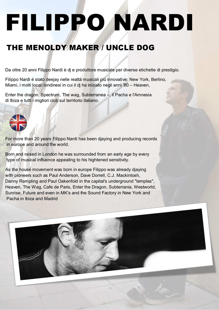 FILIPPO NARDI THE MENOLDY MAKER / UNCLE DOG Da oltre 20 anni Filippo Nardi è dj e produttore musicale per diverse etichette di prestigio. Filippo Nardi è stato deejay nelle realtà musicali più innovative: New York, Berlino, Miami, i molti locali londinesi in cui il dj ha iniziato negli anni '80 – Heaven, Enter the dragon, Spectrum, The wag, Subterranea –, il Pacha e l'Amnesia di Ibiza e tutti i migliori club sul territorio italiano. For more than 20 years Filippo Nardi has been djaying and producing records in europe and around the world. Born and raised in London he was surrounded from an early age by every type of musical influence appealing to his hightened sensitivity. As the house movement was born in europe Filippo was already djaying with pioneers such as Paul Anderson, Dave Dorrell, C.J. Mackintosh, Danny Rampling and Paul Oakenfold in the capital's underground "temples", Heaven, The Wag, Cafe de Paris, Enter the Dragon, Subterrania, Westworld, Sunrise, Future and even in MK's and the Sound Factory in New York and Pacha in Ibiza and Madrid ISY DEE LA TOPLESS DJ ITALIANA FAMOSA AL MONDO Sono ormai anni che per passione si diverte a mixare con il vinile, anche se ormai ultimamente vede molto più moderno e innovativo utilizzare il computer durante i suoi dee jay set. La motivazione del suo abbigliamento sexy e trasgressivo in consolle è dovuto, ci spiega, al fatto che si è sempre innervosita per il fatto che il pubblico raramente guarda il dee jay. A volte il pubblico non conosce neppure il nome di chi si trova alla scelta musicale. Vestita così riesce ad attrarre certamente l'attenzione del pubblico, e ci assicura, non solo quello maschile. Buona elettro/house e tanto tanto esibizionismo per una serata unica e sexy ma con eleganza. It is now years and loving it likes to mix with vinyl, but now recently seen much more modern and innovative use your computer during her deejay Set The motivation of her dress sexy and transgressive in the console is due, he explains, the fact that it has always irritated by the fact that the public rarely looks at the dee jay. Sometimes the public does not even know the name of who is the choice of music. Dressed like that can certainly attract the attention of the public, and assures us, not just the men. Good electro / house and lots all performances for a unique evening and sexy but with elegance. TITTY T. TECNICA E SOUND Titty T. è deejay da molti anni. Ha sempre usato il vinile e si accanisce contro chi le propone CD o peggio ancora software vari. Il suo deejay set è caratterizzato da suoni tech house e deep anche se la sua esperienza la porta sempre ad avere un occhio di riguardo per la pista. Il suo carattere positivamente folle la porta a creare serate piene di energia e stile. Titty T. is a deejay from many years. She always used the vinyl and hates the deejay who that use cd, software or similar. She’s deejay set is characterized by sound tech house deep, and she’s large experience She’ s character brings the crowds to create positive evenings full of energy and style LOLLY JO TOPLESS DEEJAY Lolly Jo (topless deejay) coltiva da anni la sua passione per la musica. La sua grinta si unisce a quella della sua musica dando alla serata un tocco esplosivo. Il suo tour tocca tutta l'europa ed è caratterizzato dalla migliore house del momento. E' possibile avere Lolly Jo nel proprio locale come "guest deejay" o in "versione topless" Lolly Jo (topless dee jay) has got big passion for music. Her fighting spirit giving the evening a touch explosive. Her tour touches throughout Europe and is characterized by the best house at the time. Iif you want you can have also lolly jo in version "Guest Dee Jay" (no topless). TEDDY ROMANO LIVE HOUSE: TECHONOLOGY & SHOW Teddy Romano è dee jay da oltre 20 anni. Il primo deejay ad utilizzare l’iphone come controller nei deejay set Dal 2008 lancia un nuovo stile nel modo di suonare utilizzando uno dei software più elaborati nel panorama musicale "Ableton Live". Il pubblico assiste alla sua serata come se si trovasse ad un concerto, un mix tra i suoni dell' house più attuale uniti e lavorati (dal vivo) con campioni dell'house storica. Teddy Dee Jay Romano has over 20 years. First Iphone deejayset. Since 2008 launches a new style in the way of playing in one of the most developed software in the musical world "Ableton Live". Use of the software with the APc40 Akay (a MIDI controller full of lights so to speak) makes the set a spectacular and unique. The public attends her evening as if he were at a concert, a mix between the sounds of 'house and worked together most current (live) with samples of house history. FUEGONEGRO FASHION PARTY NIGHT L'atmosfera che il "Fuego Negro" riesce a creare è piena di suggestioni, di colori, di vibrazioni. Costumi cinematografici creati sulla base di quelli aborigeni originali. La pelle completamente ricoperta da terra rossa, tipica della zona. Balli e coreografie intorno ai fuochi. Il tutto portato in scena da 5 ballerine e 1 ballerino professionisti. "Fuego Negro" la one night The atmosphere that the "Fuego Negro" can be created is full suggestions, colors, vibrations. Film costumes created on the basis of those Aboriginal originals. The skin is completely covered with red earth, typical of the area. Choreography and dance around the fires. All staged by 5 dancers and 1 professional dancer. RAGAZZE DEL COYOTE ANIMAZIONE SEXY E COINVOLGENTE Tre ragazze imprevedibili e sexy che dal banco-bar e dai punti più visibili del locale riusciranno, in collaborazione con i barman, a coinvolgere tutto il pubblico. Tre uscite di circa 30 minuti ciascuna: PRIMA USCITA: Abbigliamento in stile texano con cappelli e pantaloncini cortissimi in jeans. SECONDA USCITA: Abbigliamento rigorosamente bianco. In questa uscita le ragazze creano un momento di forte impatto accendendo una striscia di fuoco con l’alcool puro (trasparenze sexy quando per spegnere il fuoco si versano addoss