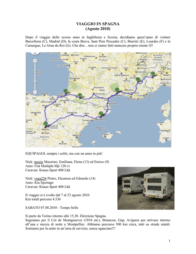 VIAGGIO IN SPAGNA (Agosto 2010) Dopo il viaggio dello scorso anno in Inghilterra e Scozia, decidiamo quest’anno di visitare Barcellona (C), Madrid (D), la costa Brava, Sant Pere Pescador (C), Biarritz (E), Lourdes (F) e la Camargue, Le Grau du Roi (G). Che dire…non ci siamo fatti mancare proprio niente ! EQUIPAGGI, sempre i soliti, ma con un anno in più! Nick: nessie Massimo, Emiliana, Elena (13) ed Enrico (9) Auto: Fiat Multipla Mjt 120 cv Caravan: Knaus Sport 400 Lkk Nick: vega226 Pietro, Eleonora ed Edoardo (14) Auto: Kia Sportage Caravan: Knaus Sport 400 Lkk Il viaggio si è svolto dal 7 al 23 agosto 2010 Km totali percorsi 4.536 SABATO 07.08.2010 - Tempo bello Si parte da Torino intorno alle 15,30. Direzione Spagna. Seguiamo per il Col de Montgenevre (1854 mt.), Briancon, Gap, Avignon per arrivare intorno all’una e mezza di notte a Montpellier. Abbiamo percorso 500 km circa, tutti su strade statali. Sostiamo per la notte in un’area di servizio, senza sganciare!!! 1 DOMENICA 08.08.2010 - Tempo bello Alle 7,30 ripartiamo, decidiamo di percorrere l’autostrada. Troviamo traffico intenso ma scorrevole. Dopo tre ore arriviamo a Sant Pere Pescador (Costa Brava) in Catalogna, a circa 40 km dalla frontiera con la Francia. Ci sistemiamo presso il camping “Las Dunas”, in due piazzole molto spaziose. Il Camping Las Dunas é un camping di prima categoria. Non dispone solamente di una spiaggia meravigliosa, ma anche di piscine e servizi sanitari eccellenti. Tutto questo immerso in uno splendido paesaggio. Unico neo: il prezzo (circa 65 € al giorno per 2 adulti e 2 bambini). Km percorsi 249. http://www.campinglasdunas.com/01_Alojamientos.php?lang=IT LUNEDI 09.08.2010 – Tempo nuvoloso Trascorriamo la mattinata nella bellissima spiaggia del campeggio. A causa del peggioramento del tempo, nel pomeriggio, decidiamo di andare a Figueres per visitare il teatro-museo dedicato a Salvator Dalì (circa 19 km). Il cuore del museo è l'edificio che ha ospitato il teatro cittadino quando Dalì era ancora un bambino e dove è stata organizzata una delle prime esposizioni pubbliche del giovane artista. Il museo ha aperto nel 1974, espandendosi di continuo durante gli anni ottanta. Oltre ai dipinti di Dalì, il museo ospita sculture, collage, marchingegni meccanici e un simpatico salotto i cui mobili, osservati da una certa prospettiva, sembrano la faccia dell'attrice Mae West. Il museo possiede inoltre una piccola selezione di opere di altri artisti come El Greco, Marcel Duchamp e l’amico di Dalì, Antoni Pitxot, che divenne direttore del museo dopo la morte di Dalì, che è sepolto in una cripta nel basamento del museo. http://www.salvador-dali.org/museus/figueres/en_index.html 2 MARTEDI 10.08.2010 – Tempo bello Giornata trascorsa alla visita di Barcellona, che dista circa 150 km dal campeggio. Per conoscere una città non c’è niente di meglio che passeggiare tranquillamente lungo le sue strade e piazze. Iniziamo visitando il Quartiere Gotico, il vero cuore cittadino, con la visita della Cattedrale (tempio gotico costruito nei secoli XIV e XV). Per le strette vie arriviamo in Piazza San Giacomo (Plaze de Sant Jaume), centro istituzionale della città, dove si affacciano il Municipio e il Palazzo della Generalitat, sede della Regione Catalogna. Nella piccola calle Paradìs, presso la sede del Centro Escursionista della Catalogna, ci imbattiamo in uno straordinario gioiello archeologico: quattro colonne corinzie del vecchio Tempio d’Augusto (foto). Nel primo pomeriggio percorriamo la famosissima Rambla, corso pedonale e serpeggiante che congiunge la plaza de Catalunya al mare, attraversando il quartiere vecchio. Durante il cammino ci fermiamo a visitare il mercato di generi alimentari più vecchio e più “genuino” tra i 40 mercati sparsi in tutta la città: la Boqueria, una specie di tempio per gli amanti della gastronomia e una vera delizia per i sensi. Il resto del pomeriggio è stato dedicato alla visita del Tempio della Sacra Famiglia, capolavoro dell’architetto Antoni Gaudì, considerato da molti il genio del Liberty, simbolo indiscusso della città (16 € gli adulti e 13 € i bambini più 10 € di audio guida in italiano). http://www.sagradafamilia.cat/ MERCOLEDI’ 11.08.2010 – Tempo poco nuvoloso Giornata di relax nella bellissima spiaggia del campeggio. GIOVEDI’ 12.08.2010 – Tempo poco nuvoloso/pioggia Mattinata in spiaggia e nel pomeriggio visita alle cittadine di L’Escala e Pals. Quest’ultima è un borgo medievale straordinariamente affascinante situato su una collina il cui centro storico, ammirevolmente conservato, merita un’attenta e minuziosa passeggiata nelle sue vie che conducono fino al belvedere di Josep Pla, belvedere da cui si scorgono l’estesa pianura sabbiosa della spiaggia di Pals, le isole Medes e il massiccio dei Montgrì. VENERDI’ 13.08.2010 - Tempo nuvoloso/pioggia Dopo aver trascorso la mattinata in spiaggia, partiamo nuovamente per Barcellona. Grazie alle autovetture a disposizione ci spostiamo con facilità all’interno della Città. Questo ci ha permesso di visitare: il Park Guell, ideato come città-giardino residenziale dall’architetto Gaudì; la Casa Batlò, che mette in rilievo il concetto scultorio e decorativo dell’architettura gaudiana; la Casa Milà o “La 3 Pedrera”, simile ad una gigantesca scultura che sancisce il trionfo delle linee curve; la Casa Vincens, prima opera importante realizzata da Gaudì. La giornata è terminata con la visita del Parco di Montjuic. Dalla plaza d’Espanya, incorniciata dalle due torri veneziane, abbiamo potuto ammirare la straordinaria prospettiva dell’avenida Reina Maria Cristina, con la scalinata che conduce al Palazzo Nazionale (foto). Lo spettacolo notturno degli zampilli d’acqua, le luci e i suoni offerti dalla Fontana Magica, a cui abbiamo assistito, è stato semplicemente indimenticabile. In nottata rientro in campeggio. SABATO 14.08.2010 - Tempo nuvoloso In questa gior