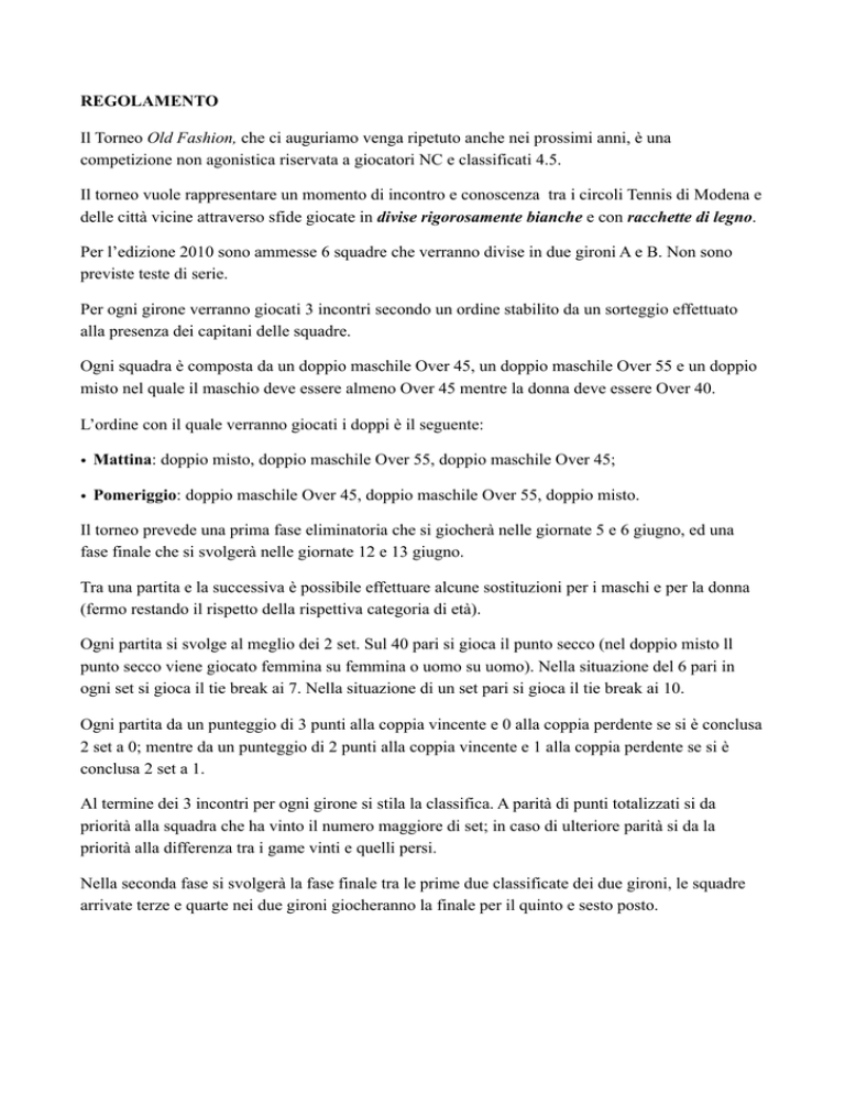 REGOLAMENTO Il Torneo Old Fashion, che ci auguriamo venga ripetuto anche nei prossimi anni, è una competizione non agonistica riservata a giocatori NC e classificati 4.5. Il torneo vuole rappresentare un momento di incontro e conoscenza tra i circoli Tennis di Modena e delle città vicine attraverso sfide giocate in divise rigorosamente bianche e con racchette di legno. Per l’edizione 2010 sono ammesse 6 squadre che verranno divise in due gironi A e B. Non sono previste teste di serie. Per ogni girone verranno giocati 3 incontri secondo un ordine stabilito da un sorteggio effettuato alla presenza dei capitani delle squadre. Ogni squadra è composta da un doppio maschile Over 45, un doppio maschile Over 55 e un doppio misto nel quale il maschio deve essere almeno Over 45 mentre la donna deve essere Over 40. L’ordine con il quale verranno giocati i doppi è il seguente: • Mattina: doppio misto, doppio maschile Over 55, doppio maschile Over 45; • Pomeriggio: doppio maschile Over 45, doppio maschile Over 55, doppio misto. Il torneo prevede una prima fase eliminatoria che si giocherà nelle giornate 5 e 6 giugno, ed una fase finale che si svolgerà nelle giornate 12 e 13 giugno. Tra una partita e la successiva è possibile effettuare alcune sostituzioni per i maschi e per la donna (fermo restando il rispetto della rispettiva categoria di età). Ogni partita si svolge al meglio dei 2 set. Sul 40 pari si gioca il punto secco (nel doppio misto ll punto secco viene giocato femmina su femmina o uomo su uomo). Nella situazione del 6 pari in ogni set si gioca il tie break ai 7. Nella situazione di un set pari si gioca il tie break ai 10. Ogni partita da un punteggio di 3 punti alla coppia vincente e 0 alla coppia perdente se si è conclusa 2 set a 0; mentre da un punteggio di 2 punti alla coppia vincente e 1 alla coppia perdente se si è conclusa 2 set a 1. Al termine dei 3 incontri per ogni girone si stila la classifica. A parità di punti totalizzati si da priorità alla squadra che ha vinto il numero maggiore di set; in caso di ulteriore parità si da la priorità alla differenza tra i game vinti e quelli persi. Nella seconda fase si svolgerà la fase finale tra le prime due classificate dei due gironi, le squadre arrivate terze e quarte nei due gironi giocheranno la finale per il quinto e sesto posto. Fase finale: La prima classificata del girone A si scontrerà con la seconda classificata del girone B; mentre la seconda classificata del girone A si scontrerà con la prima del girone B. le due squadre vincenti giocheranno la finale per il primo e secondo posto, mentre le perdenti giocheranno per il terzo e quarto posto. Premi Alla prima squadra classificata verrà consegnata il Trofeo 100 anni del TM. Verranno consegnati trofei a tutte le squadre partecipanti, sono previsti premi individuali che ogni squadra provvederà a distribuire ai giocatori che hanno partecipato. SPONSOR Il Trofeo è sponsorizzato dalla BPER. I TEMPI Ogni doppio dura in media 80 minuti. Ogni partita tra due squadre (3 doppi) dura mediamente 240 minuti, ovvero 4 ore. Gli incontri dei due gironi vengono giocati in contemporanea in 2 campi diversi. La fase eliminatoria prevede l’uso di 2 campi (in terra) dalle 16 alle 20 del sabato 5 e due campi dalle 9 alle 13 e dalle 15 alle 19 della domenica 6 giugno. Nella seconda fase si giocheranno le semifinali nella giornata di sabato 12 giugno. La finale per il terzo e quarto posto e la finale per il quinto e sesto posto verranno giocate la domenica pomeriggio e ciascuna prevede lo svolgimento di un solo doppio la cui tipologia viene stabilita per sorteggio. La finale per il primo e secondo posto verrà giocata la domenica pomeriggio e prevede lo svolgimento dei 3 doppi.
