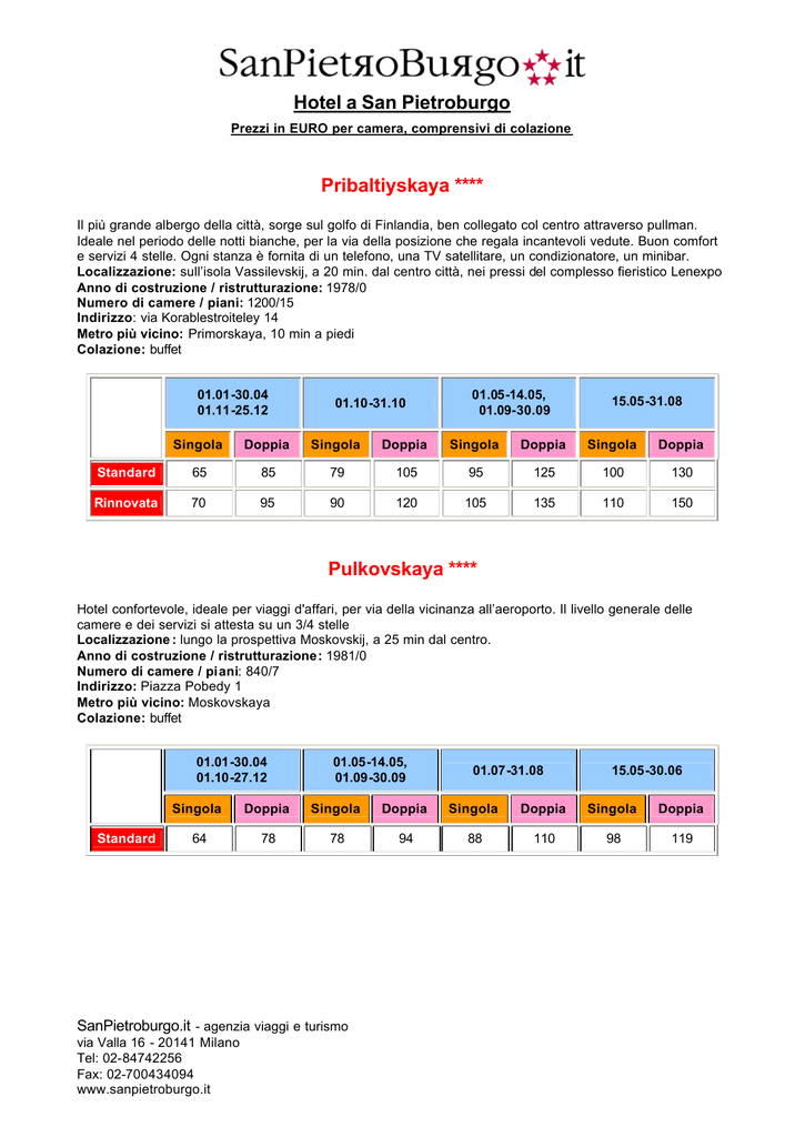 Hotel a San Pietroburgo Prezzi in EURO per camera, comprensivi di colazione Pribaltiyskaya **** Il più grande albergo della città, sorge sul golfo di Finlandia, ben collegato col centro attraverso pullman. Ideale nel periodo delle notti bianche, per la via della posizione che regala incantevoli vedute. Buon comfort e servizi 4 stelle. Ogni stanza è fornita di un telefono, una TV satellitare, un condizionatore, un minibar. Localizzazione: sull’isola Vassilevskij, a 20 min. dal centro città, nei pressi del complesso fieristico Lenexpo Anno di costruzione / ristrutturazione: 1978/0 Numero di camere / piani: 1200/15 Indirizzo: via Korablestroiteley 14 Metro più vicino: Primorskaya, 10 min a piedi Colazione: buffet 01.01-30.04 01.11-25.12 01.10-31.10 01.05-14.05, 01.09-30.09 15.05-31.08 Singola Doppia Singola Doppia Singola Doppia Singola Doppia Standard 65 85 79 105 95 125 100 130 Rinnovata 1700 1956 90 120 105 135 110 150 Pulkovskaya **** Hotel confortevole, ideale per viaggi d'affari, per via della vicinanza all’aeroporto. Il livello generale delle camere e dei servizi si attesta su un 3/4 stelle Localizzazione : lungo la prospettiva Moskovskij, a 25 min dal centro. Anno di costruzione / ristrutturazione: 1981/0 Numero di camere / piani: 840/7 Indirizzo: Piazza Pobedy 1 Metro più vicino: Moskovskaya Colazione: buffet 01.01-30.04 01.10-27.12 Standard 01.05-14.05, 01.09-30.09 01.07-31.08 15.05-30.06 Singola Doppia Singola Doppia Singola Doppia Singola Doppia 64 78 78 94 88 110 98 119 SanPietroburgo.it - agenzia viaggi e turismo via Valla 16 - 20141 Milano Tel: 02-84742256 Fax: 02-700434094 www.sanpietroburgo.it Moskva ***/**** Hotel Centrale, alla fine della prospettiva Nevskij. Uno degli hotel turistici più famosi della città. Offre tre tipi di camere: standard, rinnovate e business class, queste ultime di livello 4 stelle, mentre le altre di livello inferiore. I servizi offerti si attestano su 3 stelle. Preferibile soprattutto per la buona posizione, vicino al metrò. Vengono di seguito proposte camere standard e camere business Localizzazione: alla fine della prospettiva Nevskij, di fronte al monastero di Alexander Nevskij Anno di costruzione / ristrutturazione: 1976/2000 Numero di camere / piani: 797/7 Indirizzo: Piazza Alexandr Nevsky 2 Metro più vicino: Ploschad Alexandra Nevskogo, a 20 metri Pulkovo - 17 km Moskovsky - 1,5 km Colazione: buffet 01.03-31.03 01.10-31.03.2004 01.04-30.04 01.08-30.09 01.05-30.06 01.07-31.07 Singola Doppia Singola Doppia Singola Doppia Singola Doppia Standard 56 70 71 85 85 98 80 93 business class 1820 11086 90 118 111 144 104 139 Okhtinskaya*** L’hotel Okhtinskaya è il più recente albergo della città, terminato nel 1992. Offre un ottimo rapporto qualità/prezzo. Si affaccia sulla Neva, davanti al complesso di Smolny. Il centro è raggiungibile in circa 10 minuti con i mezzi pubblici o in taxi Localizzazione: a 10 min dal cent ro città Anno di costruzione / ristrutturazione: 1992 Numero di camere / piani: 290/14 Indirizzo: 4 Bolsheokhtinsky prospect Metro più vicino: Novocerkaskaya, a 5 minuti Colazione: continentale 05.01-30.04, 01.10-25.12 Standard 01.05-14.05, 01.07-30.09 26.12.03-04.01.04 15.05-30.06 Singola Doppia Singola Doppia Singola Doppia 44 58 64 81 98 124 Sovetskaya ***(Fontanka) Albergo sovietico che è stato in parte rinnovato (corpo "Fontanka"). Abbastanza centrale, lungo il fiume Fontana, ed economico. Localizzazione : lungo il fiume Fontanka, a 15 min dalla prospettiva Nevskij Anno di costruzione / ristrutturazione: 1967/ 2002 Numero di camere / piani: 972/18 Indirizzo: 43/1 prospect Lermontovsky Metro più vicino: Tecnologicesky Institut, a 5 minuti Colazione: buffet 03.01-30.04, 01.10-19.12 01.05-30.09 20.12.03-02.01.04 Singola Doppia Singola Doppia Standard 44 78 48 85 Rinnovate 48 84 53 94 SanPietroburgo.it - agenzia viaggi e turismo via Valla 16 - 20141 Milano Tel: 02-84742256 Fax: 02-700434094 www.sanpietroburgo.it San Pietroburgo*** Buon albergo situato lungo la Neva. Dalle sue camere si gode una stupenda vista di San Pietroburgo, in particolare della Fortezza dei SS. Pietro e Paolo Localizzazione : lungo la Neva, a 10 min dal cent ro città Anno di costruzione / ristrutturazione: 1970/ 2000 Numero di camere / piani: 410/7 Indirizzo: 5/2 Pirogovskaya embankment Metro più vicino: Ploshad Lenina, a 5 minuti Colazione: continentale 01.05-24.05 15.06-24.08 01.01-30.04 25.08-31.12 25.05-14.06 Singola Doppia Singola Doppia Singola Doppia Standard 51 76 61 86 71 91 Rinnovata 1710 11066 91 118 106 128 Tavricheskaya*** L’hotel Tavricheskaya è una struttura tipo Guest House situato nel centro storico della città, nei pressi del complesso di Smolny. Il suo livelle è 3 stelle. Localizzazione : a 15 min dal centro città, Anno di costruzione / ristrutturazione: Numero di camere / piani: 20/4 Indirizzo: 81 Chaikovskogo Metro più vicino: Chernyshevskaya, a 5 min Colazione: buffet NB: per la prenotazione di questo hotel occorre versare una quota pari al 25% della tariffa di un giorno 01.03-31.03 01.10-31.12 01.04-14.05 01.07-30.09 15.05-30.06 Singola Doppia Singola Doppia Singola Doppia Standard 44 83 47 90 51 101 Rinnovata 1550 93 60 102 66 110 SanPietroburgo.it - agenzia viaggi e turismo via Valla 16 - 20141 Milano Tel: 02-84742256 Fax: 02-700434094 www.sanpietroburgo.it Stork*** L’hotel Stork è di recente costruzione (il 2003 è l suo secondo anno di attività) e si trova a poca distanza dalla prospettiva Nevskij, all’altezza di Ploshad Vosstania. Di piccole dimensioni, ha un livello generale su 34 stelle. Il rapporto qualità-prezzo è molto buono. Possibili due tipi di sistemazione: le classiche camere o i “room appartments”, mini appartamenti di 2-3 camere che possono accogliere fino a 6 persone, realizzando in tal modo un notevole risparmio. Localizzazione : a 5 min dal centro città Anno di costruzione / ristrutturazione: 2002 Numero di camere / piani: 60 posti Indirizzo: Sapernii 22 Metro più vicino: Plo