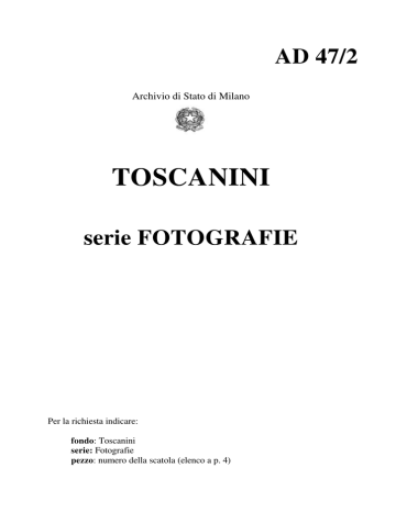 AD 47/2 Archivio di Stato di Milano TOSCANINI serie FOTOGRAFIE Per la richiesta indicare: fondo: Toscanini serie: Fotografie pezzo: numero della scatola (elenco a p. 4) Archivio Toscanini Fotografie Inventario a cura di Giovanni Luca Dilda Schede di catalogazione a cura di Lucia Citerio e Giovanni Luca Dilda Il presente strumento di corredo contiene l’elenco delle serie che compongono il fondo fotografico dell’Archivio Toscanini, con i relativi riferimenti cronologici e una sintetica descrizione di ogni fotografia, tratta dalla scheda di catalogazione, con codice alfanumerico, titolo, data, indicazioni sul soggetto, autore della ripresa, materia e tecnica ed eventuali note. Il presente inventario sintetico è basato sulle schede di catalogazione delle immagini redatte da Lucia Citerio e Giovanni Luca Dilda. 1 Introduzione Il fondo fotografico dell’Archivio Arturo Toscanini, costituito da 637 immagini 1, è stato battuto in asta Bolaffi e acquistato dal Ministero dei Beni e delle Attività culturali nel dicembre 2012, e assegnato all’Archivio di Stato di Milano. L’archivio proviene dalla nipote del Maestro Emanuela Castelbarco, figlia di Wally Toscanini (19001991) e del conte Emanuele Castelbarco Visconti Simonetta (1884-1964) 2, e raccoglie fotografie, corrispondenza e manoscritti musicali di proprietà del direttore d’orchestra, provenienti dalle figlie Wally e Wanda (1907-1998), come attestano le iscrizioni documentarie spesso presenti sul verso delle stampe fotografiche 3. Il fondo fotografico è stato in parte ricostituito attraverso l’acquisto di sei lotti d’asta, qui di seguito descritti, e comprende originali (fotografie private e relative ad eventi pubblici, pezzi sciolti o estratti nel corso degli anni dagli album di famiglia) e riproduzioni con formati, tecniche e temi diversi: - n. 1007: “Arturo Toscanini e Yehudi Menuhin. Bella fotografia che raffigura il Maestro mentre studia una partitura con giovane violinista, datata ‘20/12/32’ con le firme autografe di entrambi i musicisti, 115 x 160 mm, in cornice. Unita breve ma cordiale lettera autografa di un diciassettenne Menuhin.” (ATF_229); - n. 1008: “Autografo di Yehudi Menuhin. Bella fotografia di grande formato con lunga e affettuosa dedica di un giovane Yehudi Menuhin ‘with infinite love to the King of music and Musicians with gratitude for the kind lessons you gave me on board the S.S. Ile de France, from your humble admirer and friend’ (ATF_228); - n. 1009: “Raccolta fotografica del ‘King of Music and Musicians’. Interessantissimo per la ricerca e la documentazione iconografica sul Maestro è un nutrito gruppo di fotografie di vari formati raffiguranti Toscanini, i suoi amici e la sua famiglia. Alcune delle fotografie presentano l’autografo del Maestro (...). Molte delle fotografie sono vergate al retro dalla figlia Wally con le indicazioni dei luoghi, degli anni e dei personaggi che accompagnarono il Maestro nel cammino di tutta la sua vita.” (la quasi totalità delle immagini); - n. 1030: “Fotografia con dedica autografa ad Ada Mainardi. Breve ma significativa dedica del Maestro, con busta e sigillo in ceralacca rossa, spedita da New York nel 1935 (85 x 65 mm. montata su cartoncino).” (ATF_278); - n. 1031: “Fotografia con dedica autografa ad Ada Mainardi. Bel ritratto fotografico del Maestro di profilo con, al verso, dedica autografa in inchiostro blu ‘L’rreale è la mia realtà. Essere amato da te, Ada.” (ATF_039); - n. 1032: “Fotografia con dedica autografa di Arturo Toscanini. Fotografia in bianco e nero che ritrae un pensoso Toscanini in un parco con, al verso, due righe autografe a matita ‘A Castanienbaum, pensando a te. Artù’, senza data, 110 x 168 mm.” (ATF_334). L’intervento ha previsto: 1. una ricognizione generale, con la distinzione del materiale fotografico da quello a stampa (cartoline, inviti, pubblicazioni), posto in coda alle serie fotografiche e descritto sommariamente; sono state mantenute nelle serie e schedate anche alcune immagini con supporti diversi (fotocopie e stampe) nel caso in cui rappresentassero componenti essenziali alla serie fotografica di cui erano parte; Corrispondenti a 616 schede di catalogazione per la presenza di copie o reimpieghi. http://geneall.net/it/ancestors/1759841/conte-emanuele-giuseppe-conte-castelbarco-visconti-simonetta-pindemonterezzonica/ 3 W per indicare Wally Toscanini e WHT per indicare Wanda Horowitz Toscanini, moglie del pianista Vladimir Horowitz. 1 2 2 2. riordino archivistico del materiale fotografico secondo Serie/ Servizi fotografici, riconoscibili in base ad eventi della vita del Maestro, autori di servizi e didascalie4. Nel corso del lavoro sono state ricostruite 173 serie: le serie nn. 1 – 171 sono state riordinate secondo l’ordine cronologico; in coda la serie n. 172 Toscaniniana (Fotografie di ritratti, sculture ed eventi in ricordo del Maestro) e la serie n. 173 Wally Toscanini con fotografie della figlia del direttore d’orchestra e di suoi oggetti personali, posteriore alla morte di Arturo Toscanini; 3. elaborazione di una scheda tecnica di catalogazione (V. Scheda tecnica); 4. catalogazione delle immagini e dei supporti (616 schede); 5. ricondizionamento con materiali idonei alla conservazione (buste in polipropilene inserite in scatole di cartone non acido). Nelle pagine seguenti sono riportate le seguenti parti: tavola di riferimento ai contenitori in cui sono conservate le singole fotografie ricondizionate, con riferimento alla serie d appartenenza (pagina 4); • cronologia (pagine 5 -18) con l’elenco delle Serie / Servizi fotografici, inseriti in parallelo agli eventi della vita di Arturo Toscanini (1867-1957); • inventario sintetico del fondo fotografico, riportante i seguenti elementi di descrizione: numero della scatola (contenitore); numero e nome della serie/servizio fotografico; codice identificativo della fotografia, titolo della fotografia, indicazione sul soggetto d