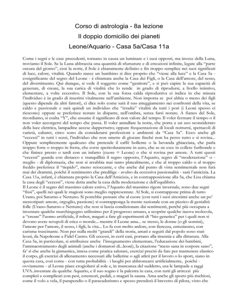 Corso di astrologia - 8a lezione Il doppio domicilio dei pianeti Leone/Aquario - Casa 5a/Casa 11a Come i segni e le case precedenti, tornano in causa un luminare e i suoi opposti, ma invece della Luna, troviamo il Sole. Se la Luna abbraccia una quantità di sfumature e di emozioni infinite, legate alla “parte oscura del giorno”, cioè la notte, il Sole è chiaramente definito e fin troppo semplice nei suoi significati di luce, calore, vitalità. Quando nasce un bambino si dice proprio che “viene alla luce” e la Casa 5a cosignificante del segno del Leone - è chiamata anche la Casa dei Figli, o la Casa dell’amore, del sesso, del divertimento. Qui dunque, si vede il soggetto come “genitore”, e si può capire la sua capacità di generare, di creare, la sua carica di vitalità che lo rende in grado di riprodursi, a livello istintivo, elementare, a volte eccessivo. Il Sole, con la sua forza calda riproduttiva ci indica in che misura l’individuo è in grado di inserirsi vitalmente nell’ambiente. Non importa se poi abbia o meno dei figli (questo dipende da altri fattori), ci dice solo come sarà il suo atteggiamento nei confronti della vita, se caldo e passionale e sarà quindi un individuo che “irradia” vitalità da tutti i pori (i Leoni spesso ci riescono) oppure se preferisce restare in disparte, nell’ombra, senza farsi notare. A fianco del Sole, ricordiamo, si esalta “Y”, che assume il significato di non valore del tempo. Il voler fermare il tempo o il non voler accorgersi del tempo che passa. Il voler annullare la notte, che porta a un uso sconsiderato della luce elettrica, lampadine accese dappertutto; oppure frequentazione di locali notturni, spettacoli di varietà, cabaret, circo sono da considerarsi professioni e ambienti da “Casa 5a”. Ecco anche gli “eccessi” in tutti i sensi, l’individuo che non smette di giocare finché non ha perso tutto e si rovina... Oppure semplicemente qualcuno che pretende il caffè bollente o la bevanda ghiacciata, che parla troppo forte o troppo in fretta, che corre spericolatamente in auto, che se ne esce in collere furibonde e che finisce presto o tardi con un infarto (cuore = Leone) o che si rovina per amore. A tutti questi “eccessi” guarda con distacco e tranquillità il segno opposto, l’Aquario, segno di “moderazione” o meglio - di diplomazia, che non si arrabbia mai tanto platealmente, e che al troppo caldo o al troppo freddo preferisce il “tiepido”, meno scioccante, e che anche dal punto di vista sentimentale non farà mai dei drammi, poiché il sentimento che predilige - avulso da eccessiva passionalità - sarà l’amicizia. La Casa 11a, infatti, è chiamata proprio la Casa dell’Amicizia, e in contrapposizione alla 5a, che Lisa chiama la casa degli “eccessi”, viene detta anche la casa della moderazione e dell’equilibrio. Il Leone è il segno del massimo calore estivo, l’Aquario del massimo rigore invernale, sono due segni “fissi”, quelli nei quali le stagioni sono meglio rappresentate. Al Sole, si contrappone prima di tutto Urano, poi Saturno e Nettuno. Si potrebbe pensare che al cuore (con tutti i suoi sinonimi anche un po’ stereotipati: amore, orgoglio, passione) si contrapponga la mente razionale con un pizzico di genialità folle (Urano-Saturno e Nettuno) che non si lascia condizionare dai sentimenti, perché più occupata a inventare qualche marchingegno utilissimo per il progresso umano, a scoprire qualche nuova molecola, a “creare” l’uomo artificiale, il robot, magari a fare gli esperimenti di “bio-genetica” per i quali non si devono avere scrupoli di etica o morale... mentre il Leone ama... se stesso, le donne (o gli uomini), l’amore per l’amore, il sesso, i figli, la vita... Lo fa con molto ardore, con fierezza, entusiasmo, con carisma trascinante. Non per nulla molti “grandi” della storia, amati e seguiti dal popolo sono stati leoni, da Napoleone a Fidel Castro. Gli eccessi, in certi casi, portano alla tirannia e alla dittatura. Alla Casa 5a, in particolare, si attribuisce anche l’insegnamento elementare, l’educazione dei bambini, l’ammaestramento degli animali (anche i domatori di...leoni), la citazione “mens sana in corpore sano”, fa’ sì che anche la ginnastica, intesa come pratica salutare, esercizi precisi da fare per mantenere elastico il corpo, gli esercizi di allenamento necessari alle ballerine o agli atleti per il lavoro o lo sport, siano in questa casa, così come - con tutta probabilità - i luoghi per abbronzarsi artificialmente, poiché ovviamente - al Leone piace crogiolarsi al sole e, in mancanza del suddetto, usa le lampade a raggi UVA..inventate da qualche Aquario, e il suo sogno è la palestra in casa, con tutti gli attrezzi più completi e complicati con pesi, estensori, pedali, e magari la sauna. Ama anche gli sports più rischiosi, come il volo a vela, il parapendio o il paracadutismo e spesso prenderà il brevetto di pilota, visto che il punto del volo - grazie all’esaltazione di Y - è nel Leone, e per coloro che se lo possono permettere, l’aereo privato o almeno un elicotterino, è di rigore. Il Leone è protagonista e lo è per natura e per elezione, c’è in lui comunque una grande signorilità d’animo e generosità. E’ capace di prodigarsi veramente per chi ha bisogno di aiuto, con grande abnegazione e sacrificio. (Chi lo conosce, spesso se ne approfitta e con l’adulazione ottiene quello che vuole). L’Aquario si interessa spesso di grandi opere umanitarie, può fare l’ambasciatore dell’UNICEF, accostarsi a nuove religioni, nuove ideologie, interessarsi di scienza e musica (Nettuno in esaltazione si fa sentire in questo senso), ma è spesso distratto per quanto riguarda i rapporti con la famiglia, l’amore, i figli, pensando che sono più importanti altre cose. Le quadrature con questi segni e queste case, vengono solitamente da Toro e Scorpione, l’altro asse della croce “fissa”, con le case 2