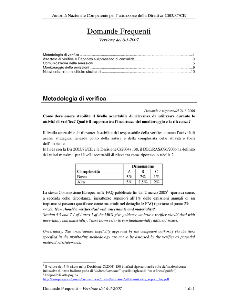 Autorità Nazionale Competente per l’attuazione della Direttiva 2003/87/CE Domande Frequenti Versione del 6-3-2007 Metodologia di verifica ................................................................................................................1 Attestato di verifica e Rapporto sul processo di convalida .........................................................3 Comunicazione delle emissioni ..................................................................................................5 Monitoraggio delle emissioni ......................................................................................................9 Nuovi entranti e modifiche strutturali ........................................................................................10 Metodologia di verifica Domanda e risposta del 21-3-2006 Come deve essere stabilito il livello accettabile di rilevanza da utilizzare durante le attività di verifica? Qual è il rapporto tra l’incertezza del monitoraggio e la rilevanza? Il livello accettabile di rilevanza è stabilito dal responsabile della verifica durante l’attività di analisi strategica, tenendo conto della natura e della complessità delle attività e fonti dell’impianto. In linea con la Dir 2003/87/CE e la Decisione C(2004) 130, il DEC/RAS/096/2006 ha definito dei valori massimi1 per i livelli accettabili di rilevanza come riportato in tabella 2. Complessità Bassa Alta Dimensione A B C 5% 2% 1% 5% 2,5% 2% La stessa Commissione Europea nelle FAQ pubblicate fin dal 2 marzo 20052 riportava come, a seconda delle circostanze, inesattezze superiori all’1% delle emissioni annuali di un impianto si possano qualificare come materiali; nel dettaglio le FAQ riportano al punto 23: << 23. How should a verifier deal with uncertainty and materiality? Section 4.3 and 7.4 of Annex I of the MRG give guidance on how a verifier should deal with uncertainty and materiality. These terms refer to two fundamentally different issues. Uncertainty: The uncertainties implicitly approved by the competent authority via the tiers specified in the monitoring methodology are not to be assessed by the verifier as potential material misstatements. 1 Il valore del 5 % citato nella Decisione C(2004) 130 è infatti riportato nelle sole definizioni come indicativo (il testo italiano parla di “indicativamente”, quello inglese di “as a broad guide”). 2 Disponibili alla pagina http://europa.eu.int/comm/environment/climat/emission/pdf/monitoring_report_faq.pdf Domande Frequenti – Versione del 6-3-2007 1 di 1 Autorità Nazionale Competente per l’attuazione della Direttiva 2003/87/CE Materiality: The MRG define “Materiality” as “the professional judgment of the verifier as to whether an individual or aggregation of omissions, misrepresentations or errors that affects the information reported for an installation will reasonably influence the intended users' decisions. As a broad guide, a verifier will tend to class a misstatement in the total emissions figure as being material if it leads to aggregate omissions, misrepresentations or errors in the total emissions figure being greater than five percent”. The level of materiality has to be established by the verifier on a case-by-case basis. Depending on the circumstances, a level of misstatement above 1% of annual emissions of an installation could qualify as material.>> Il testo qui citato chiarisce anche la differenza sostanziale tra incertezza (uncertainty) e rilevanza (materiality), nonché le modalità con cui deve essere calcolato il potenziale impatto delle inesattezze (misstatements), in particolare con riferimento all’incertezza: “Le incertezze implicitamente approvate dall’Autorità Competente attraverso i livelli di approccio specificati nella metodologia di monitoraggio non sono valutate dal verificatore come potenziali inesattezze”. In tal senso le incertezze nel monitoraggio non contribuiscono alla rilevanza delle inesattezze nella misura in cui esse sono state approvate nell’ambito delle prescrizioni di monitoraggio previste dai decreti autorizzativi e dal DEC/RAS/854/2005. Ad esempio, se in un impianto per il quale l’approccio di livello 3 richiesto dal DEC/RAS/854/2006 prevede “la quantificazione del consumo di combustibile utilizzando dispositivi di misura con un’incertezza massima ammissibile inferiore a ± 2,5 %”, si riscontra un’incertezza del 2%, inferiore quindi alla soglia del 2,5%, tale incertezza non deve essere valutata ai fini del raggiungimento della soglia di rilevanza. Al contrario, in caso di presenza di strumentazione che garantisca un’incertezza massima ammissibile del ± 3 %, superiore quindi alla soglia del 2,5%, si ha una non conformità, il cui effetto potenziale deve essere valutato, in particolare: è soggetto a valutazione lo scarto dello 0,5 % tra il 2,5 richiesto dalla normativa ed il 3 % riscontrato. Alla fine della verifica, se l’effetto cumulativo di tutti i rilievi emersi (secondo quanto descritto nel DEC/RAS/096/2006) non supera la soglia di rilevanza, il verificatore può esprimere un “giudizio con rilievi”, che consente comunque al gestore dell’impianto verificato la convalida del dato dichiarato e la regolare restituzione di un pari numero di quote di emissione. Domanda e risposta del 22-3-2006 Se in sede di verifica si riscontra la presenza di una o più fonti minori non autorizzate, ma la cui emissione è regolarmente monitorata nel rispetto dei requisiti della normativa, il verificatore può convalidare la dichiarazione delle attività e delle emissioni? Si. In presenza di fonti minori non autorizzate ma regolarmente monitorate il verificatore può convalidare la dichiarazione delle attività e delle emissioni. Il giudizio con rilievi sarà accompagnato dalla descrizione delle non conformità rilevate secondo quanto richiesto dal DEC/RAS/096/2006. Domande Frequenti – Versione del 6-3-2007 2 di 2 Autorità Nazionale Competente per l’attuazione d