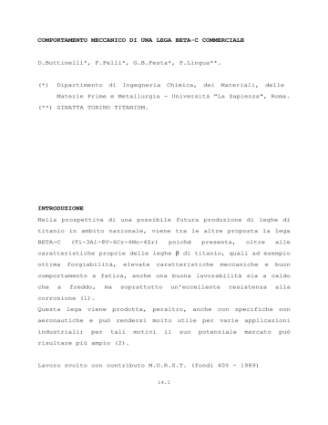 COMPORTAMENTO MECCANICO DI UNA LEGA BETA-C COMMERCIALE D.Buttinelli*, F.Felli*, G.B.Festa*, P.Lingua**. (*) Dipartimento di Ingegneria Chimica, dei Materiali, delle Materie Prime e Metallurgia - Università "La Sapienza", Roma. (**) GINATTA TORINO TITANIUM. INTRODUZIONE Nella prospettiva di una possibile futura produzione di leghe di titanio in ambito nazionale, viene tra le altre proposta la lega BETA-C (Ti-3Al-8V-6Cr-4Mo-4Zr) poiché presenta, oltre alle caratteristiche proprie delle leghe β di titanio, quali ad esempio ottima forgiabilità, elevate caratteristiche meccaniche e buon comportamento a fatica, anche una buona lavorabilità sia a caldo che a freddo, ma soprattutto un'eccellente resistenza alla corrosione (l). Questa lega viene prodotta, peraltro, anche con specifiche non aeronautiche e può rendersi molto utile per varie applicazioni industriali; per tali motivi il suo potenziale mercato risultare più ampio (2). Lavoro svolto con contributo M.U.R.S.T. (fondi 40% - 1989) 14.1 può In questo lavoro è stato studiato il comportamento meccanico di una lega BETA-C commerciale prodotta dalla soc. RMI (USA), ponendo particolare attenzione al binomio caratteristiche di velocità di propagazione della cricca - resistenza meccanica, in relazione alle possibili tessiture di lavorazione ed in funzione dei diversi trattamenti termici. Alcuni risultati vengono confrontati con quelli di leghe di Ti (α+β) con caratteristiche di comportamento a fatica molto buone, quali la lega 6-6-2 e la lega 6-4 (3-4). Questi dati sono ricavati da prove eseguite sulla stessa macchina ed in condizioni operative molto simili a quelle usate per la lega BETA-C. Al fine di una migliore presentazione riepilogativa dei dati di fatica o meglio degli andamenti di propagazione sub-critica della cricca, nelle varie condizioni di invecchiamento della lega, viene usata la relazione semiempirica di Collipriest (5), che permette di esprimere analiticamente la velocità di avanzamento della cricca di fatica mediante l'uso di un numero assai ridotto di parametri caratteristici sperimentali. L'equazione è del tipo: EQ il cui andamento della curva di fatica è fornito dalla funzione arcotangente iperbolica. 14.2 MATERIALI E PROCEDURE SPERIMENTALI La lega studiata è stata fornita allo stato solubilizzato (815°C÷1/2ora; A.C.), laminata in piastre di 20mm di spessore, con la seguente composizione chimica: Al 3,3% - V 8,1% - Cr 5.8% - Mo 3,9% - Zr 3,8% - Fe 0,03% - Nb 0,08% - C 0,02% - N 0,015% - H 80 ppm. Dalla piastra, tramite taglio alla fresatrice, sono stati ricavati i provini per le prove di invecchiamento, di trazione e di fatica, nelle direzioni L e T. Le prove di invecchiamento sono state condotte su provini 20x25x4(mm) in forno in atmosfera di argon, in un intervallo di temperatura 450°C÷600°C, per tempi fino a 24 ore, con rilevazione della durezza Vickers (carico 50kg, tempo di azione 15 secondi). Le prove di trazione sono state eseguite sui provini solubilizzati ed invecchiati a 450°C-475°C-500°C-525°C-550°C-570°C per 20 ore, determinando σy0,2 – σr e A%. Sono state eseguite anche prove di invecchiamento in doppio stadio che non hanno dato risultati significativi. Le prove di fatica sono state condotte seguendo le norme ASTM E647 in condizioni carico viene ambientali generato di da laboratorio, un con elettromagnete macchine ed il cui amplificato meccanicamente con una frequenza di 9,5 Hz. I provini di spessore B=12,5mm e W=40mm del tipo CT (compact tension specimen), prelevati dalla piastra nelle configurazioni LT e TL, sono stati esaminati, in questa prima parte della ricerca, nelle condizioni di solubilizzati e di invecchiati a 450°C, 500°C e 570°C per 20 ore. Il criterio di scelta per questi tempi e temperature è legato al fatto che si ottengono le caratteristiche meccaniche più elevate 14.3 compatibilmente con tempi di trattamento adeguati per la pratica industriale. Temperature più basse portano a caratteristiche meccaniche più elevate, ma solo con tempi di trattamento sensibilmente lunghi. I carichi applicati sono del tipo sinusoidale, con rapporto R=0,5 (R=Pmin/Pmax). La lettura della lunghezza della cricca è stata eseguita per via ottica con microscopio a 40 ingrandimenti, con verifica dopo rottura del campione. Da queste misure, con l'impiego del metodo polinomiale, si ricava la velocità di avanzamento della cricca. I risultati sono stati poi elaborati tramite un programma appositamente sviluppato per l'elaborazione delle curve da/dN-∆K. I dati sperimentali sono stati poi interpolati con il modello semiempirico di Collipriest (5); questo modello insieme a quelli di Paris e Forman sta alla base della previsione del comportamento a fatica di un componente reale. Gli esami metallografici [reagente d'attacco: 1 ml HF(40%), 5 ml HNO3, 94 ml H2O (distillata)] e quelli delle superfici di frattura sono stati condotti mediante microscopia ottica ed al microscopio elettronico a scansione Hitachi S-2500 dotato di sistema (EDS) Kevex 8000. 14.4 14.5 RISULTATI E DISCUSSIONE In tabella 1 sono riportate le caratteristiche meccaniche ottenute per la lega BETA-C alle varie temperature di invecchiamento dopo 20 ore di trattamento. Premesso c11e non si riscontrano sensibili differenze per i campioni prelevati in senso longitudinale e trasversale, gli incrementi più significativi si ottengono alle temperature nel campo 500°C-450°C dove si hanno i valori massimi di σy 1184 MPa e σr di 1266 MPa, anche se A% scende sino a valori del 5%. Valori più elevati si ottengono per tempi di trattamento maggiori come mostrato da una prova di trattamento eseguita a 475°C per 28 ore, dove si è ottenuto per σy 1274 MPa e σr di 1324 MPa. Per questa lega la lettura (6) riporta valori max. raggiungibili fino a σr 1654 MPa. Nel presente lavoro ci si è limitati a durate del trattamento simili a quelle industriali, è tuttavia in corso un'indagine più approfondita nel campo di temperatura 350°C-450°C e