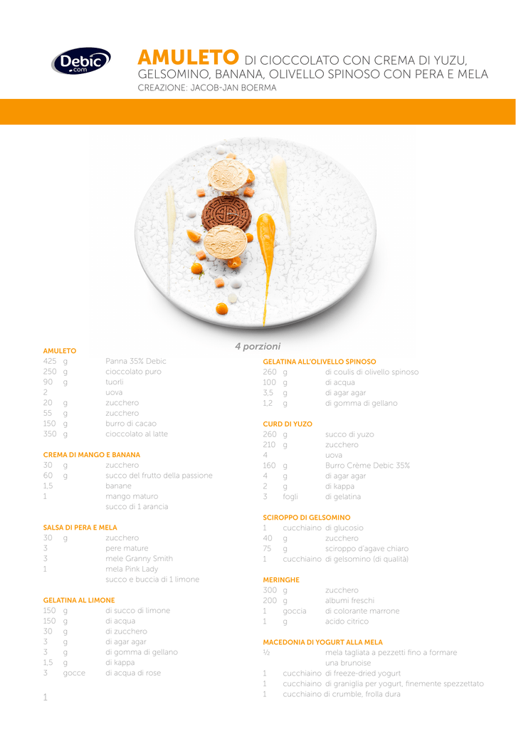 AMULETO DI CIOCCOLATO CON CREMA DI YUZU, GELSOMINO, BANANA, OLIVELLO SPINOSO CON PERA E MELA CREAZIONE: JACOB-JAN BOERMA 4 porzioni AMULETO 425 g 250 g 90 g 2 20 g 55 g 150 g 350 g Panna 35% Debic cioccolato puro tuorli uova zucchero zucchero burro di cacao cioccolato al latte CREMA DI MANGO E BANANA 30 g 60 g 1,5 1 zucchero succo del frutto della passione banane mango maturo succo di 1 arancia GELATINA ALL’OLIVELLO SPINOSO 260 g 100 g 3,5 g 1,2 g di coulis di olivello spinoso di acqua di agar agar di gomma di gellano CURD DI YUZO 260 g 210 g 4 160 g 4 g 2 g 3 fogli succo di yuzo zucchero uova Burro Crème Debic 35% di agar agar di kappa di gelatina SCIROPPO DI GELSOMINO SALSA DI PERA E MELA 30 g 3 3 1 zucchero pere mature mele Granny Smith mela Pink Lady succo e buccia di 1 limone GELATINA AL LIMONE 150 150 30 3 3 1,5 3 1 g g g g g g gocce di succo di limone di acqua di zucchero di agar agar di gomma di gellano di kappa di acqua di rose 1 40 75 1 cucchiaino di glucosio g zucchero g sciroppo d’agave chiaro cucchiaino di gelsomino (di qualità) MERINGHE 300 g 200 g 1 goccia 1 g zucchero albumi freschi di colorante marrone acido citrico MACEDONIA DI YOGURT ALLA MELA ½ mela tagliata a pezzetti fino a formare una brunoise 1 cucchiaino di freeze-dried yogurt 1 cucchiaino di graniglia per yogurt, finemente spezzettato 1 cucchiaino di crumble, frolla dura PREPARAZIONE AMULETO 1. 2. 3. 4. Montare la Panna 35% Debic a una consistenza ferma, ma non troppo. Sciogliere il cioccolato. Sbattere i tuorli, le uova e 20 g di zucchero. Scaldare 55 g di zucchero con un poco di acqua fino a 120° C e aggiungere il composto arioso e leggero di tuorli, uova e zucchero. 5. Aggiungere il cioccolato fuso e la panna montata. 6. Dividere in due stampi e riporre in congelatore. 7. Una volta congelato, spruzzare una miscela di burro di cacao e cioccolato al latte. CREMA DI MANGO E BANANA 1. Caramellare lo zucchero. 2. Aggiungere la banana e il mango tagliati a piccoli pezzi, il succo d’arancia e il succo del frutto della passione. 3. Ridurre e mescolare bene. SALSA DI PERA E MELA 1. Sbucciare le mele, le pere e tagliarle a fette sottili. 2. Caramellare lo zucchero, aggiungere le fette di pera, mescolare e aggiungere le mele, la buccia grattugiata del limone e alcune gocce di succo di limone. 3. Scaldare bene e passare al colino. Mescolare bene. GELATINA AL LIMONE 1. Portare a bollore gli ingredienti, versare in una ciotola e lasciar raffreddare. 2. Mescolare per evitare che si formino grumi. GELATINA ALL’OLIVELLO SPINOSO 1. Portare a bollore gli ingredienti, versare in una ciotola e lasciare raffreddare. 2. Passare al mixer fino a formare una gelatina omogenea. CURD DI YUZO 1. 2. 3. 4. Scaldare il succo di yuzo con l’agar agar, la kappa e lo zucchero. Versare in un mixer termico e mescolare con le uova a 60°C per 10 minuti. Aggiungere il Burro Crème Debic e immergere la gelatina nell’impasto. Versare negli stampini e lasciar raffreddare. SCIROPPO DI GELSOMINO 1. Congelare il gelsomino e mescolare gli altri ingredienti. 2. Portare a 75°C circa e aggiungere il gelsomino congelato. Lasciar riposare accanto alla fonte di calore per circa dieci minuti, passare al colino e lasciar raffreddare. MERINGHE 1. 2. 3. 4. 5. 6. 7. Portare l’acqua e lo zucchero a 120°C. Aggiungere gli albumi sbattuti e mescolare a velocità media finché il composto si raffredda e si gonfia. Aggiungere 1 g di acido citrico e una goccia di colorante marrone. Versare il composto in stampi rotondi su tappetini di silicone. Cuocere in forno a 90°C per dodici minuti e togliere gli stampi. Rimettere in forno per alcuni minuti. Riporre le meringhe in un essiccatore a 50°C. MACEDONIA DI YOGURT ALLA MELA Mescolare tutti gli ingredienti e aggiungere il succo di limone. COMPOSIZIONE 1. Disporre l’amuleto al centro del piatto. 2. Versare sopra e sotto il curd di yuzu e versare sopra l’insalata di yogurt alla mela. 3. Disporre la papaia e l’uva spina sopra e sotto. 4. Aggiungere un pizzico di gelatina al limone e di gelatina all’olivello spinoso, disegnare due linee con la salsa di pere e mele e con la crema di mango e banana. Versare a filo lo sciroppo di gelsomino e aggiungere qualche goccia di yogurt. 2