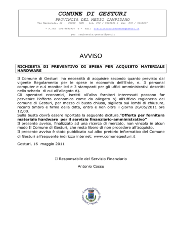 COMUNE DI GESTURI PROVINCIA DEL MEDIO CAMPIDANO Via Nazionale, 36 - P.Iva 09020 00473680924 pec (VS) – tel. 070 / 9360830-3 e - mail fax 070 / 9360837 [email protected] [email protected] AVVISO RICHIESTA DI PREVENTIVO DI SPESA PER ACQUISTO MATERIALE HARDWARE Il Comune di Gesturi ha necessità di acquisire secondo quanto previsto dal vigente Regolamento per le spese in economia dell’Ente, n. 3 personal computer e n.4 monitor lcd e 3 stampanti per gli uffici amministrativi descritti nella scheda di cui all’allegato A). Gli operatori economici, iscritti all’albo fornitori interessati possono far pervenire l’offerta economica come da allegato b) all’Ufficio ragioneria del comune di Gesturi, per mezzo di busta chiusa, sigillata sui lembi di chiusura, recanti timbro e firma della ditta, entro e non oltre il giorno 26/05/2011 ore 12,00. Sulla busta dovrà essere riportata la seguente dicitura.”Offerta per fornitura materiale hardware per il servizio finanziario-amministrativo” Il presente avviso, finalizzato ad una ricerca di mercato, non vincola in alcun modo Il Comune di Gesturi, che resta libero di non procedere all’acquisto. Il presente avviso è stato pubblicato sul albo pretorio informatico del Comune di Gesturi all’seguente indirizzo internet: www.comunegesturi.it Gesturi, 16 maggio 2011 Il Responsabile del Servizio Finanziario Antonio Cossu ALLEGATO a) Caratteristiche Hardware 1) Personal Computer ( quantità 3) Processore Intel socket B (Lga 1366) o altro processore con caratteristiche similari; Unità Centrale L’unita centrale deve soddisfare le seguenti specifiche minime: chipset capace di supportare una quantità di memoria pari ad almeno 8 GB; almeno 4 alloggiamenti per ospitare la Memoria RAM; interfacce esterne: 6 porte USB (v.2.0 o superiore): di cui almeno 2 porte devono essere posizionate sul lato frontale del PC. Memoria RAM installata La quantità di memoria RAM installata deve essere pari a 4 GB. La scheda madre deve poter permettere l’espansione della memoria RAM fino ad almeno 8 GB (complessivi). Unità disco base (hard disk drive) capacita di almeno 500 GB; velocità di rotazione 7.200 rpm; installate negli alloggiamenti previsti nella scheda madre; protocollo di trasferimento S-ATA almeno 3 Gb/sec. Unità di masterizzazione L’unita di masterizzazione deve avere le seguenti caratteristiche minime: Tipo: DVDRW DL Controllore grafico Il controllore grafico deve soddisfare le seguenti specifiche minime: Integrato nel chipset o nel processore oppure aggiuntivo tramite apposita scheda risoluzione in grado di supportare il monitor offerto alla sua risoluzione massima; uscita analogica 15 pin D-sub e uscita digitale DVI; in grado di gestire almeno 512 MB di memoria dedicabile. Il controllore grafico, aggiuntivo tramite apposita scheda, deve soddisfare l’ulteriore requisito: almeno 512 MB di memoria dedicata. Dispositivo di collegamento alla rete locale Il sistema deve essere configurato per la connessione alla rete locale. Il dispositivo per il collegamento del sistema alla rete locale deve soddisfare le seguenti specifiche minime: deve rispettare i requisiti di conformità indicati nella norma ISO 8802-3 e, in particolare, IEEE 802.3 (10Base-T), 802.3u (100Base-TX), 802.3ab (1000Base-T); deve essere dotato di connettore RJ45; deve supportare la funzionalità WOL. Devono inoltre essere forniti i software necessari per l’utilizzo dello stesso con il sistema operativo Windows XP (ed eventuali nuove versioni rilasciate da Microsoft).quali, ad esempio, i drivers. Tastiera La tastiera, connessa al sistema, deve essere del tipo italiana estesa, QWERTY con tasti funzione per Windows, con tastierino numerico separato e con il tasto EURO. Dispositivo di puntamento (mouse) Il dispositivo di puntamento (mouse), connesso al sistema, deve essere di tipo ottico, a due o tre pulsanti e con rotella per lo scrolling, non cordless. Funzionalità di gestione e sicurezza Il sistema deve disporre di alcune funzionalità tendenti a garantire la sicurezza e l’inviolabilità; si richiede: la disabilitazione da Bios del boot da unita rimovibili; la disabilitazione, o protezione con password, del sistema; la disabilitazione, o protezione con password, del setup del sistema; protezione con password di sicurezza per utente e amministratore da BIOS; presenza del numero seriale, del modello e del produttore del pc all’interno del BIOS; rispondenza alla specifiche SMBIOS; Logo Microsoft “Microsoft 7”, (Windows 7 Logo Program). Consumi Elettrici I consumi energetici delle apparecchiature devono essere conformi allo standard EPA ENERGY STAR ver. 5.0 o equivalente. Emissioni acustiche Le apparecchiature fornite dovranno avere un livello di potenza sonora emessa (LwAd) non superiore a 48 dB(A), in modalità idle. Tale livello deve essere certificato attraverso un rapporto di prova eseguito secondo le norme ISO 9296 e UNI EN ISO 7779 da un laboratorio scelto dal concorrente. E’ facoltà del concorrente effettuare tale misurazione secondo le norma UNI EN ISO 3741 o la UNI EN ISO 3744 o la UNI EN ISO 3745. Microsoft Office Ciascun personal computer dovrà essere corredato di una licenza d’uso non esclusiva a tempo indeterminato, trasferibile, del seguente software : Microsoft Office Standard 2007 o versione più recente. I pacchetti dei programmi software in questione dovranno essere in lingua italiana. Sistemi Operativi Microsoft Ciascun personal computer dovrà essere corredato di una licenza d’uso a tempo indeterminato del seguente sistema operativo: - Windows 7 Professional (ed eventuali nuove versioni rilasciate da Microsoft). Su ciascun personal computer dovrà essere apposta l’etichetta COA (Certificate of Authenticity) a comprova dell’autenticità della licenza, cosi come previsto dalle procedure Microsoft. Tutti i prodotti in precedenza indicati dovranno essere forniti nella loro ultima versione ed in lingua italiana, dovranno avere anche installata l’ultim